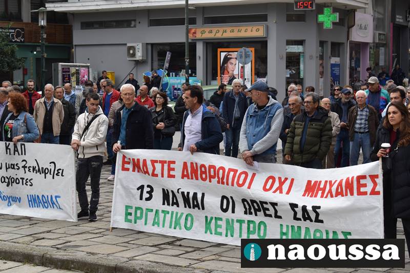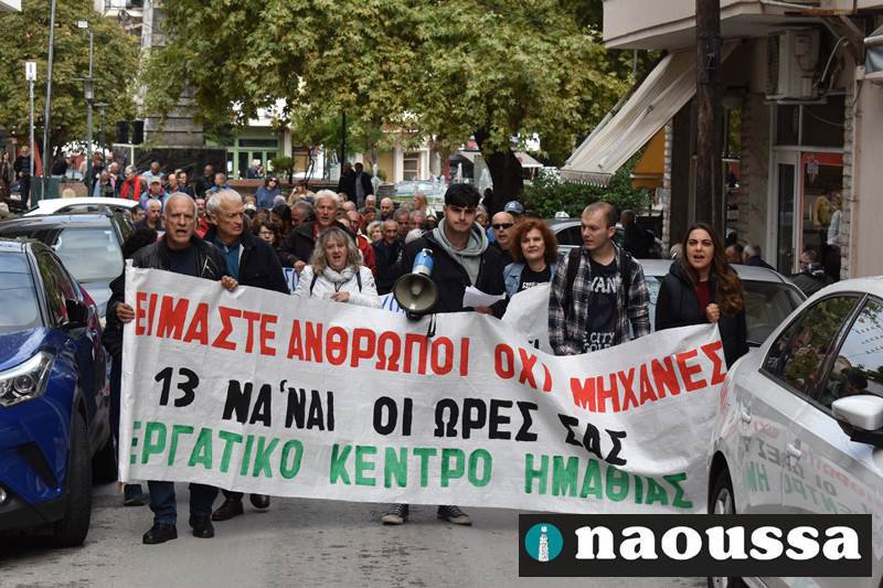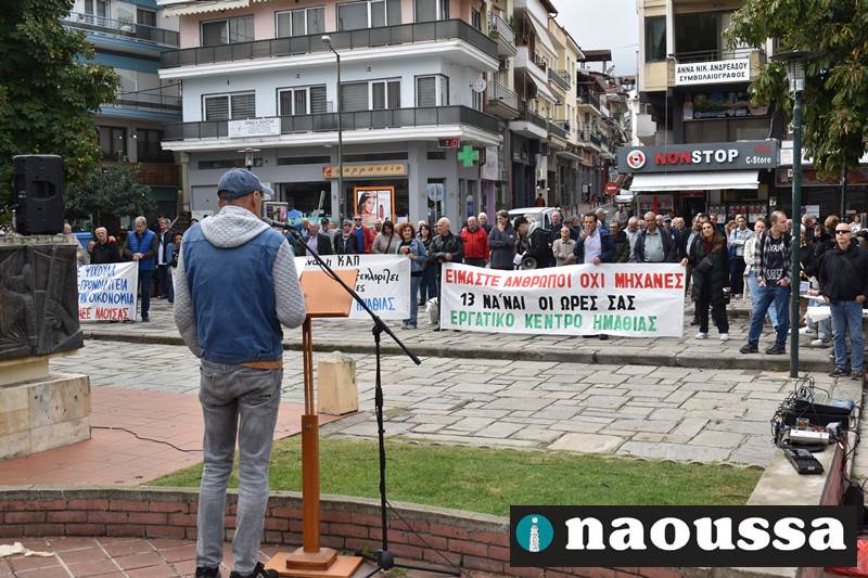 Όπως σε όλη την Ελλάδα έτσι και στη Νάουσα πραγματοποιήθηκε το πρωί της Τετάρτης 1 Οκτωβρίου η απεργιακή συγκέντρωση των σωματείων στο πλαίσιο της πανελλαδικής κινητοποίησης ενάντια στο νομοσχέδιο που, όπως καταγγέλλουν, «νομιμοποιεί τον εργασιακό μεσαίωνα» και ανοίγει το δρόμο για 13ωρη δουλειά και καθεστώς γενικευμένης ευελιξίας.
