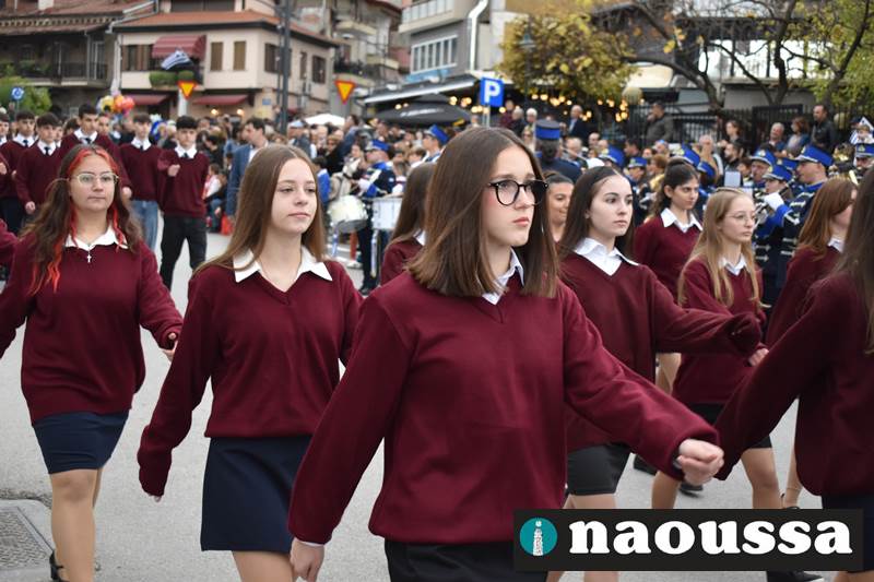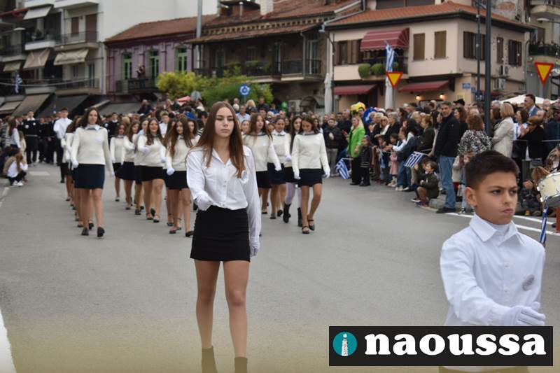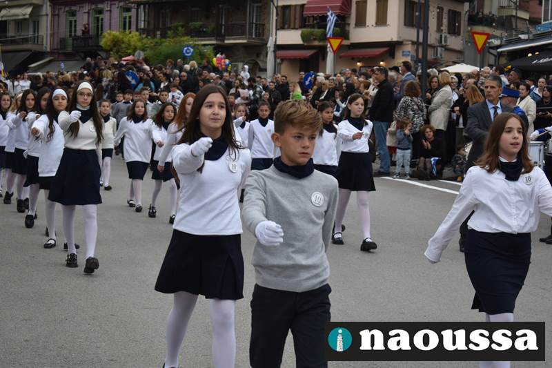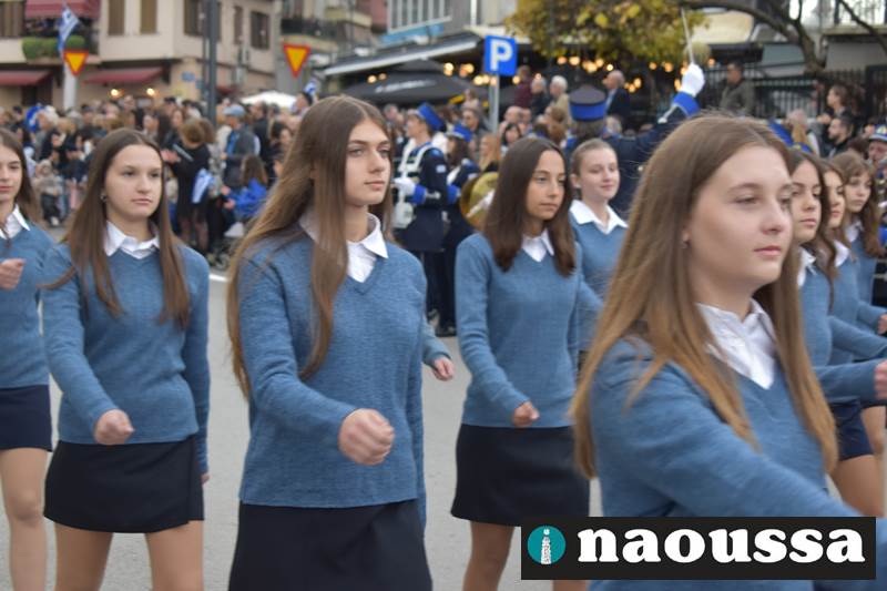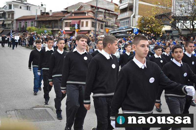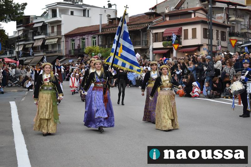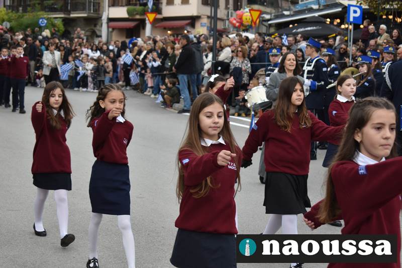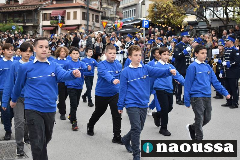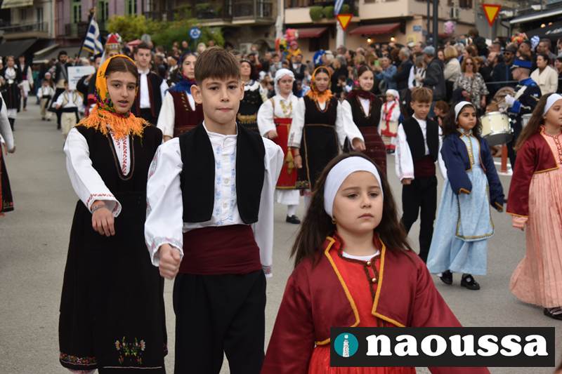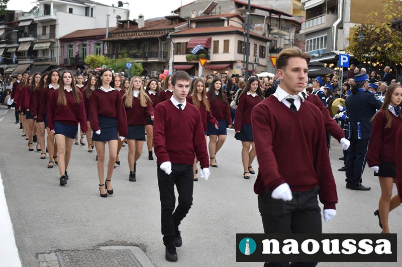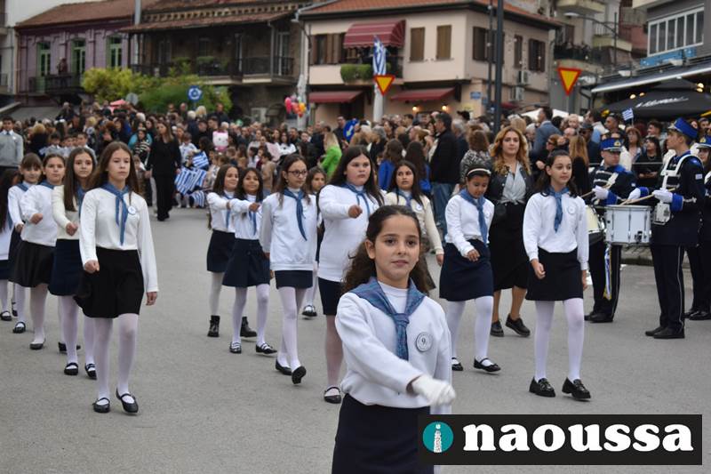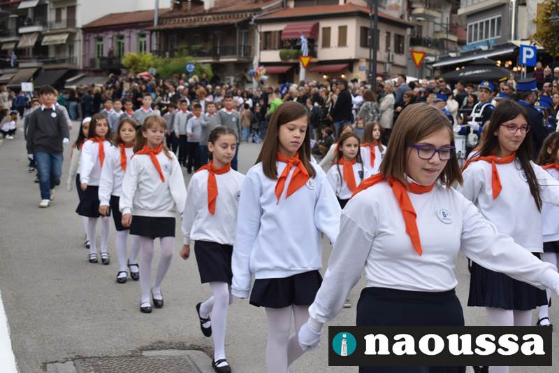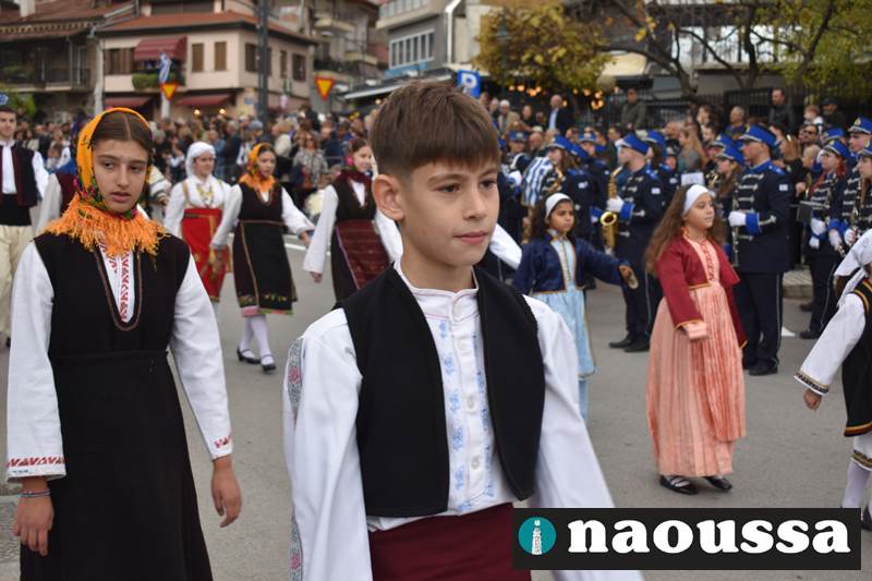 Μαθητές των δημοτικών, των γυμνασίων, των λυκείων αλλά και πολιτιστικοί σύλλογοι παρήλασαν καταχειροκροτούμενοι από τους κατοίκους της Νάουσας, τιμώντας τους ήρωες της 28ης Οκτωβρίου
