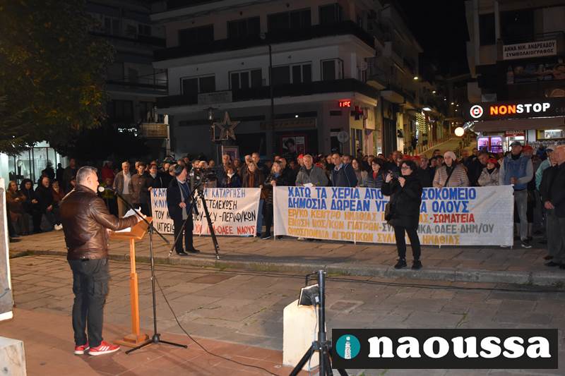 Στο συλλαλητήριο που διοργάνωσε το Εργατικό Κέντρο Ημαθίας και στήριξαν μεταξύ άλλων τα σωματεία: Ένωση Ιατρών Νομού Ημαθίας - Ιδιωτικών Υπαλλήλων – Βαρβαρέσου- Τροφίμων- Οικοδόμων- Συνταξιούχων ΙΚΑ και ΟΑΕΕ Νάουσας – Ενωτική Ομοσπονδία Αγροτικών Συλλόγων Νομού Ημαθίας – Αγροτικός Σύλλογος Νάουσας « Μαρίνος Αντύπας» χαιρετισμούς έκαναν: Η μικρή μαθήτρια Δέσποινα, ο Παναγιώτης Χατζησάββας, πρόεδρος του συλλόγου εκπαιδευτικών πρωτοβάθμιας Ημαθίας, ο Σούλης Ανδεόπουλος, πρόεδρος των συνταξιούχων ΙΚΑ Βέροιας, ο Τάκης Τσουλάκος πρόεδρος της Ενωτικής Ομοσπονδία Ημαθίας , ο Ηλίας Κοτσεκίδης πρόεδρος του σωματείου συνταξιούχων ΟΑΕΕ Νάουσας, ο Μάντσος Νίκος μέλος της αγωνιστικής συσπείρωσης εμπόρων-αντιπρόεδρος του εμπορικού συλλόγου Νάουσας, η Γρατσιάνου Ευαγγελία, νοσηλεύτρια του νοσοκομείου Βέροια, εκλεγμένη με την αγνωστική συσπείρωση. Την κεντρική ομιλία έκανε ο πρόεδρος του Εργατικού Κέντρου Ημαθίας κ. Νίκος Νατζμέ. Τα βασικά αιτήματα τους ήταν: