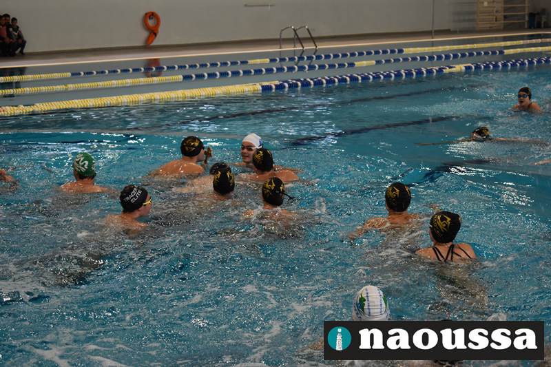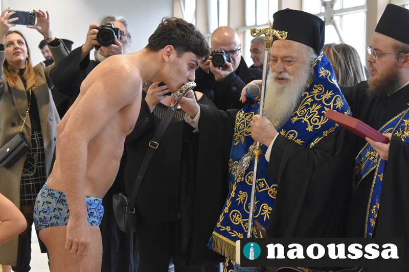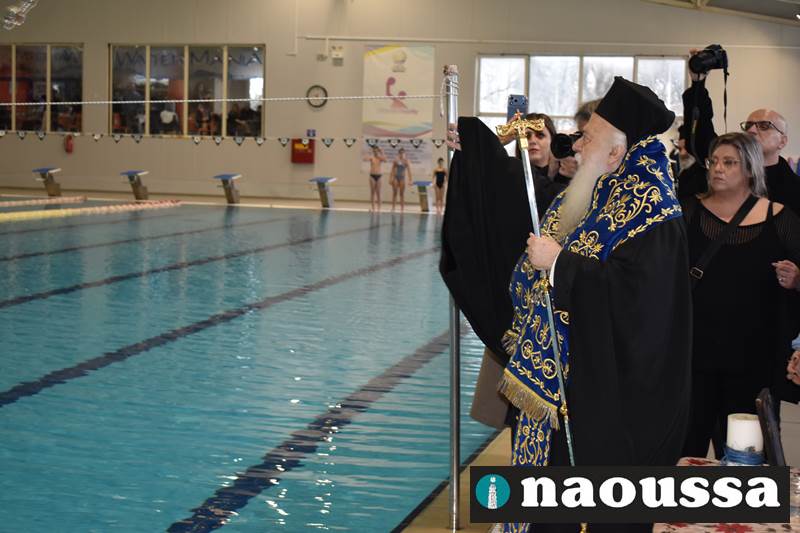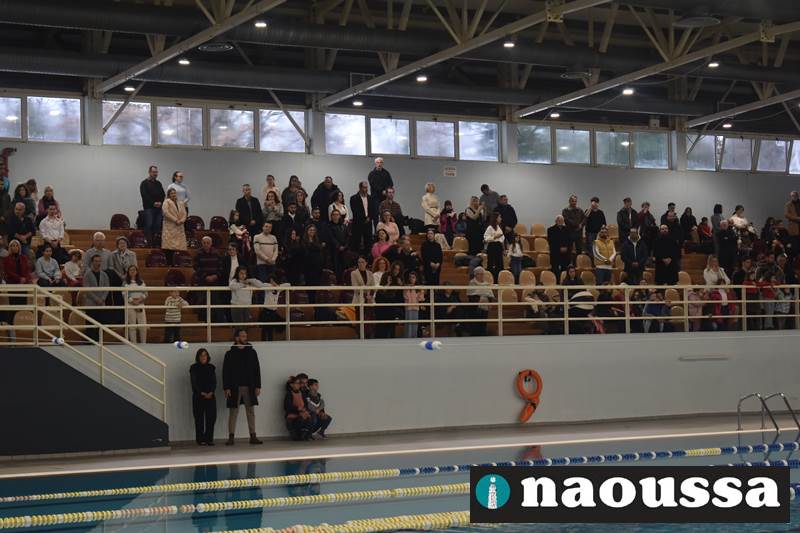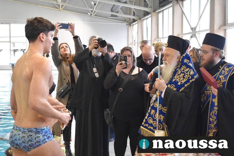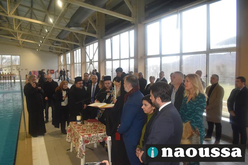 Μετά το πέρας του Αγιασμού των υδάτων στο ποτάμι της Αράπιτσας, ακολούθησε ο καθιερωμένος πλέον Αγιασμός των υδάτων στο κατάμεστο δημοτικό κολυμβητήριο Νάουσας.