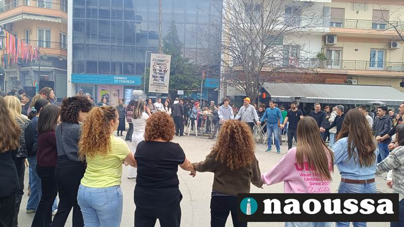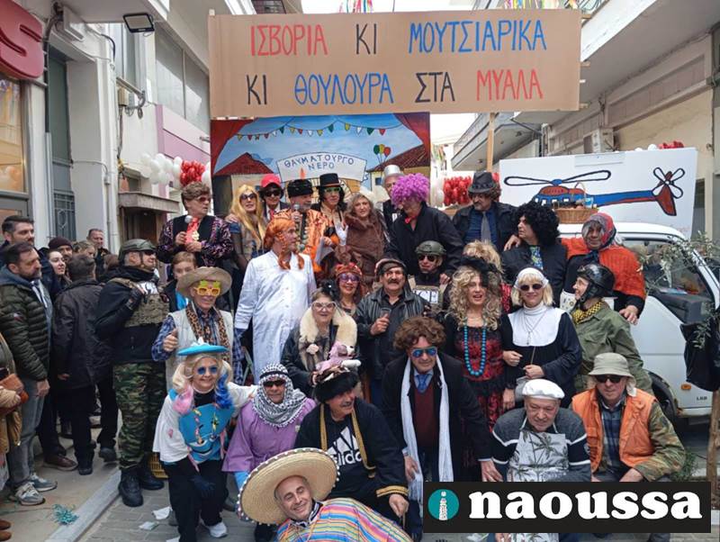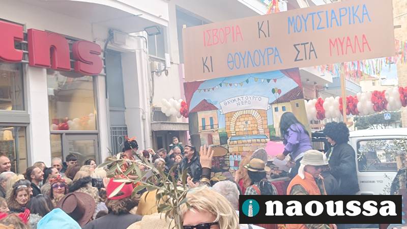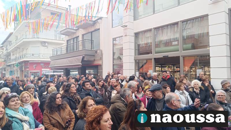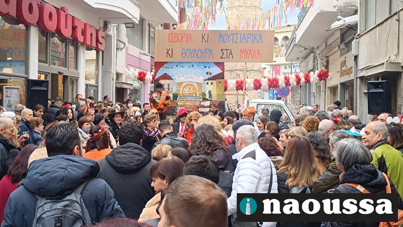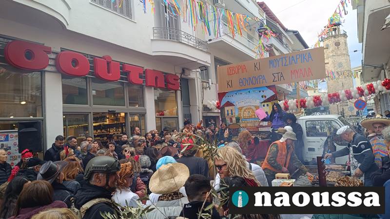 Το κέντρο της πόλης "πεζοδρομήθηκε", αφού οι δρόμοι του είναι πρακτικά απροσπέλαστοι για τα αυτοκίνητα. Στην οδό Δημ. Βλάχου, πραγματοποιήθηκε με μεγάλη επιτυχία το σατιρικό γλέντι με την "Ομάδα Ανταρτών" «ισβόρια και μουτσιαρικά και θολούρα στα μυαλά», που σχολίασε την τοπική και κεντρική πολιτική σκηνή με το γνωστό της ναουσαίικο ύφος. Ο κόσμος γέλασε και χειροκρότησε θερμά τους συντελεστές του... ετήσιου αποκριάτικου σίριαλ, που, για άλλη μια φορά, που χόρεψε με την ορχήστρα του Βαγγέλη Ψαθά.