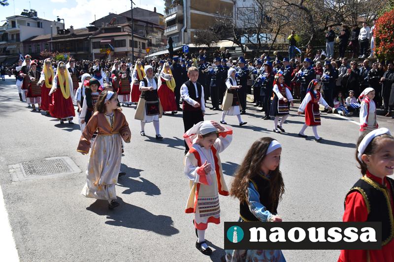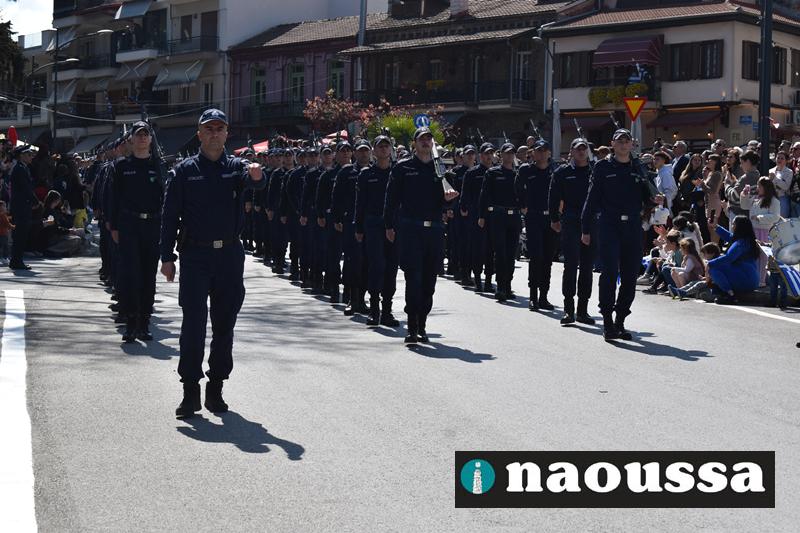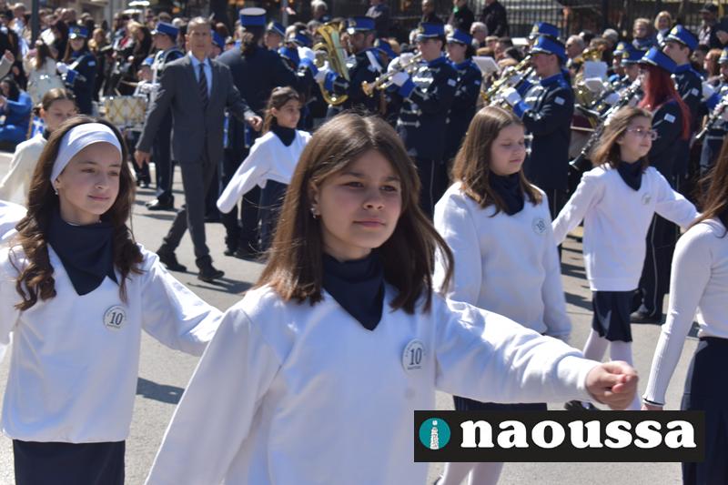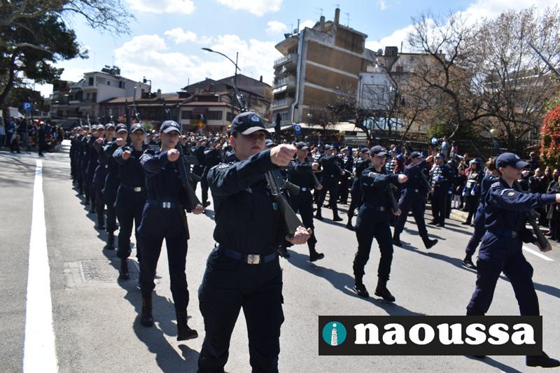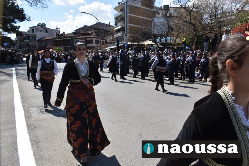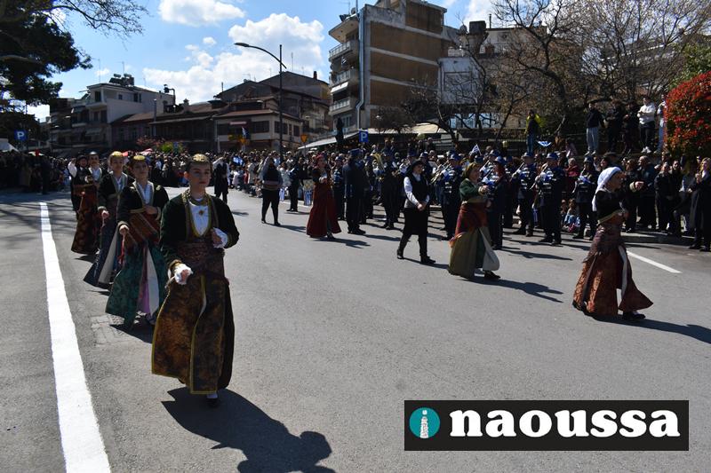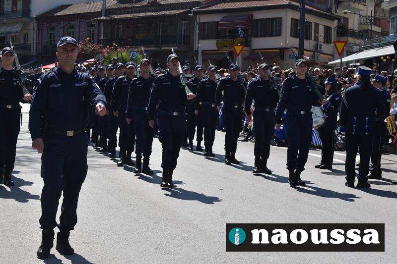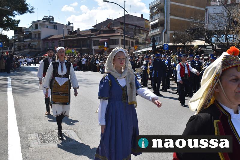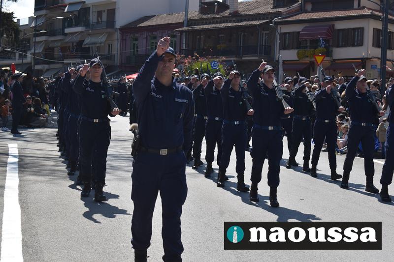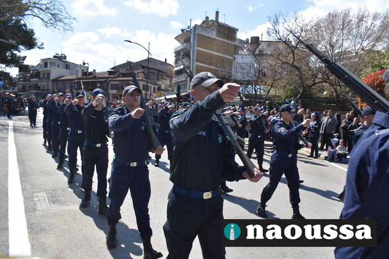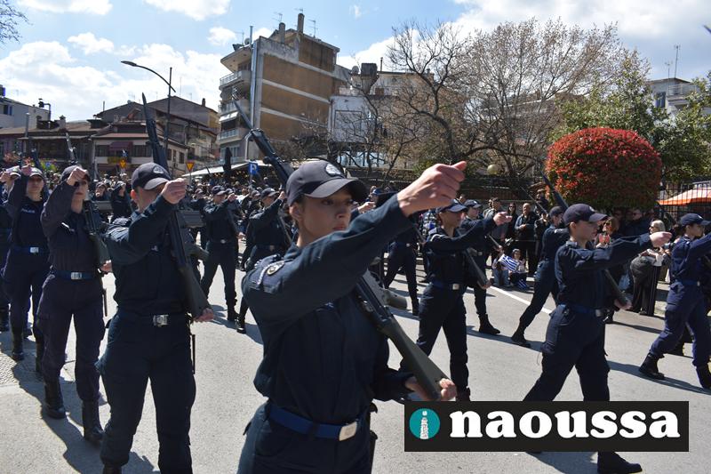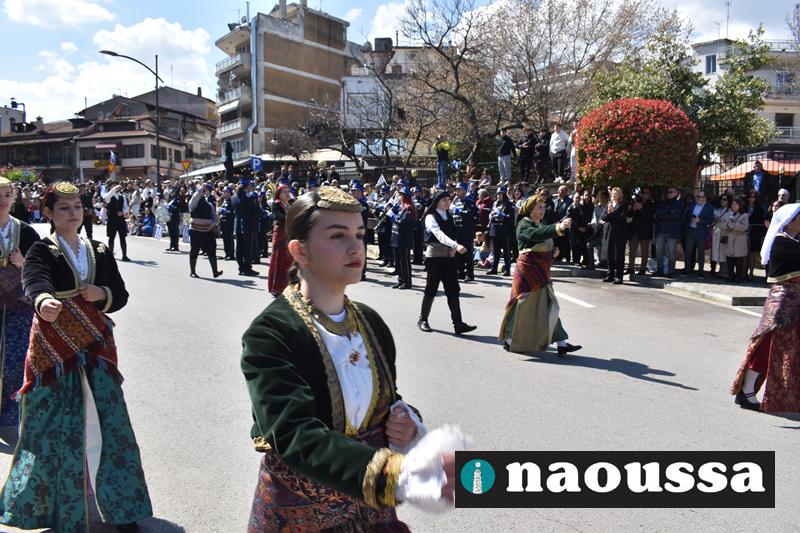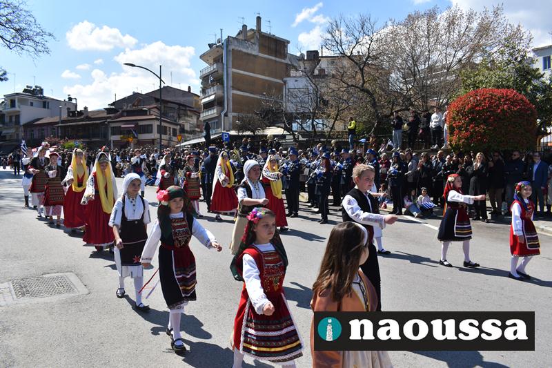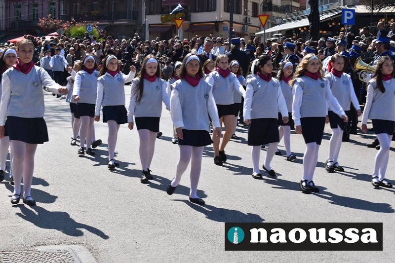 Τα μέλη των πολιτιστικών, οι μαθητές των σχολείων, οι σπουδαστές της σχολής Αστυφυλάκων και άνδρες της Β΄Μοίρας Καταδρομών παρήλασαν καταχειροκροτούμενοι από τους κατοίκους της Νάουσας.