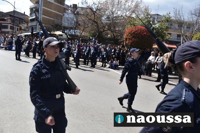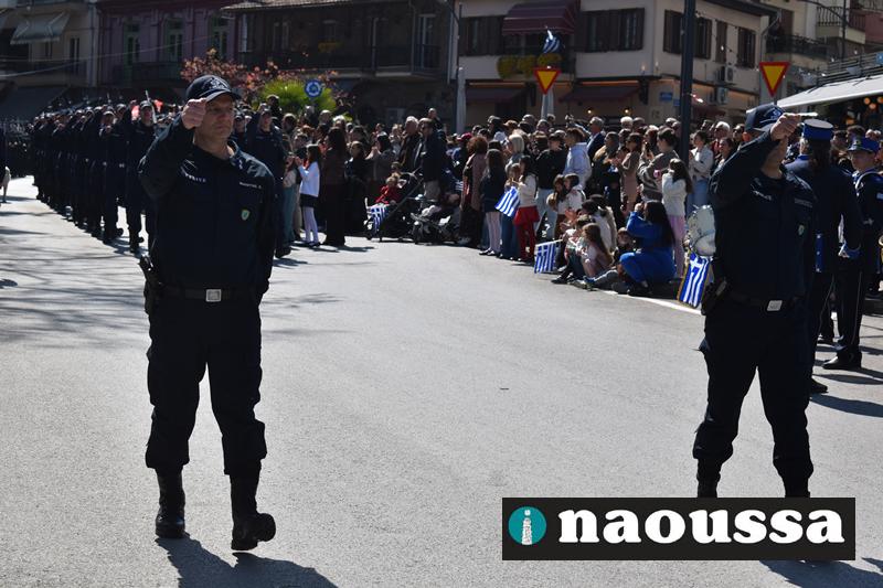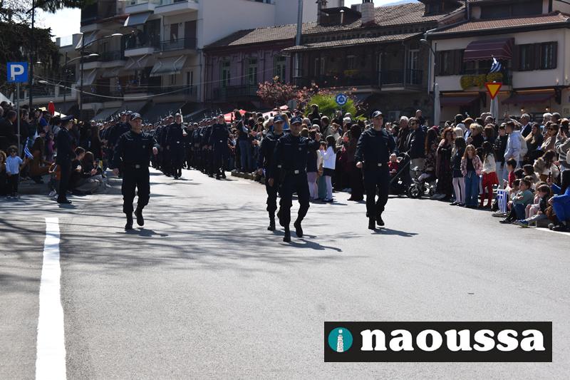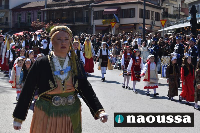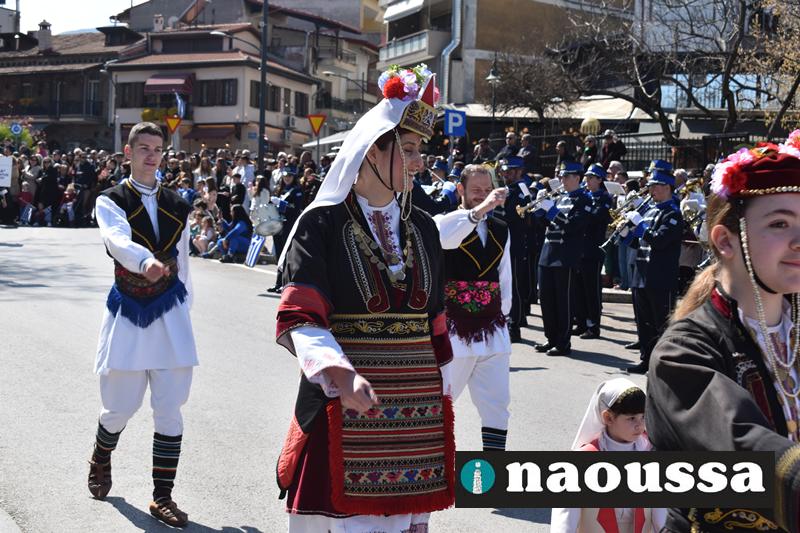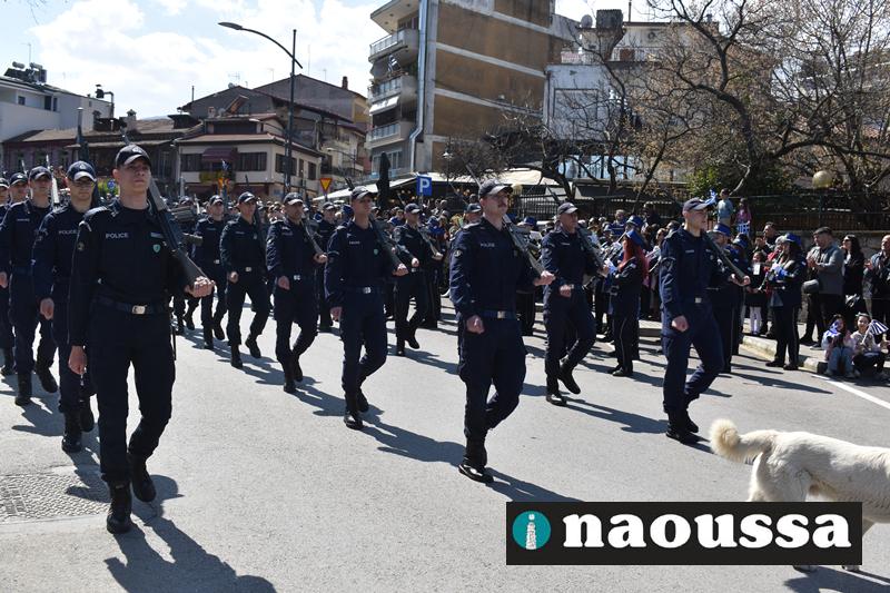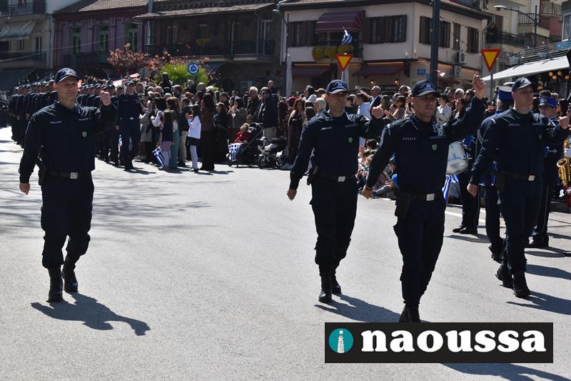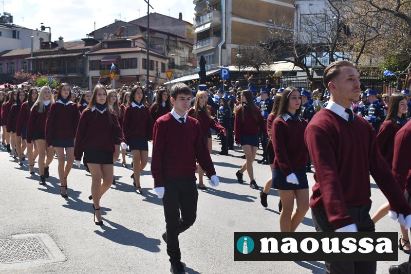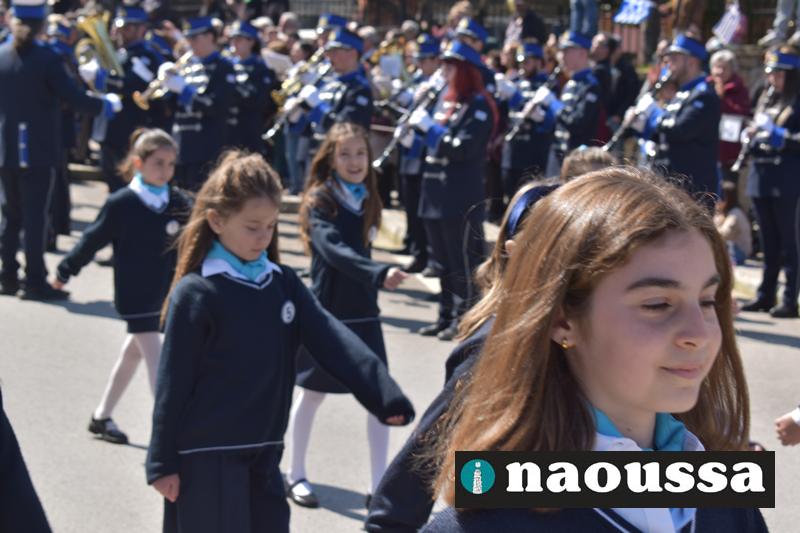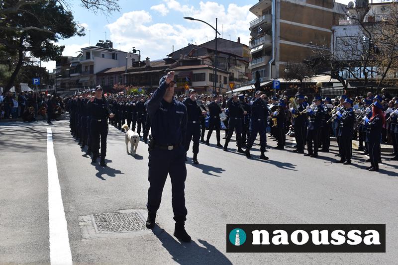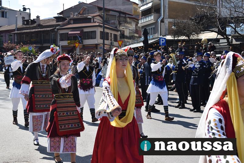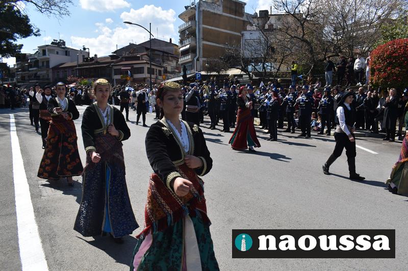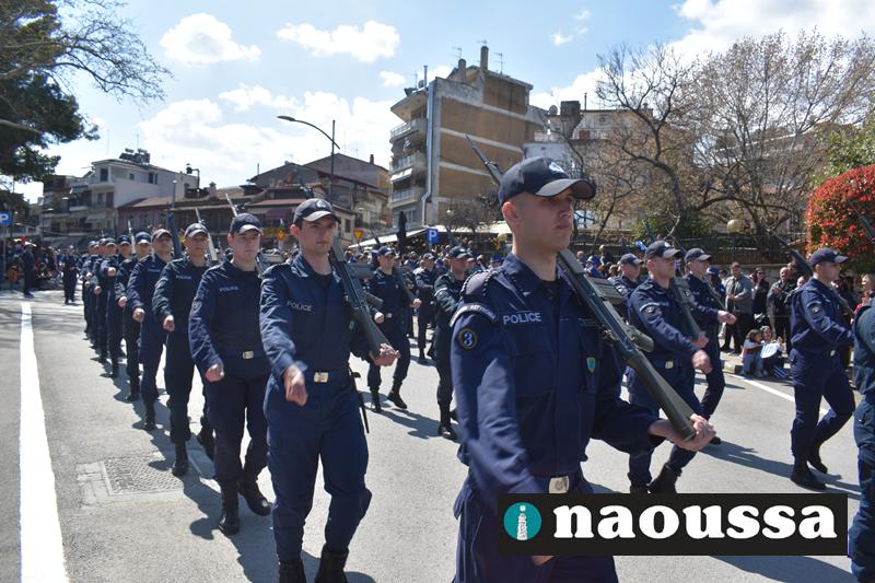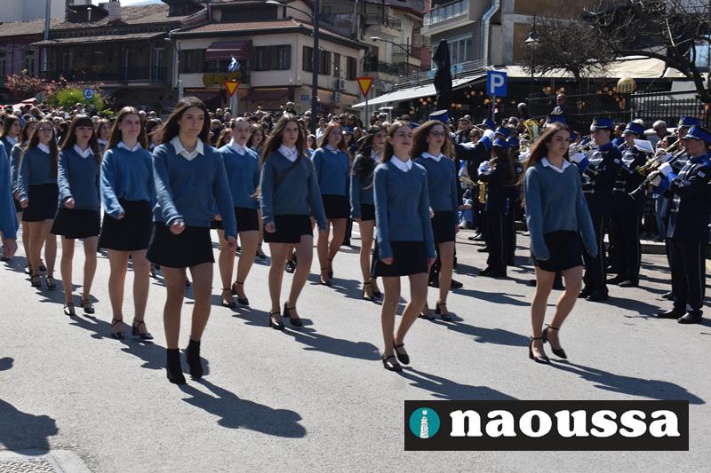 Τα μέλη των πολιτιστικών, οι μαθητές των σχολείων, οι σπουδαστές της σχολής Αστυφυλάκων και άνδρες της Β΄Μοίρας Καταδρομών παρήλασαν καταχειροκροτούμενοι από τους κατοίκους της Νάουσας.