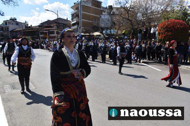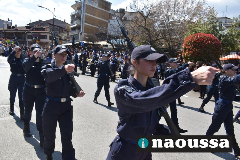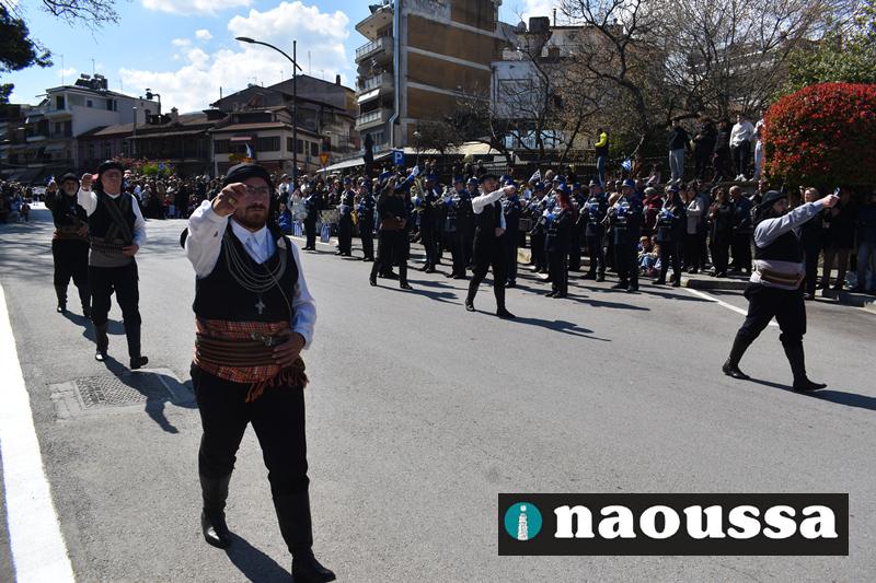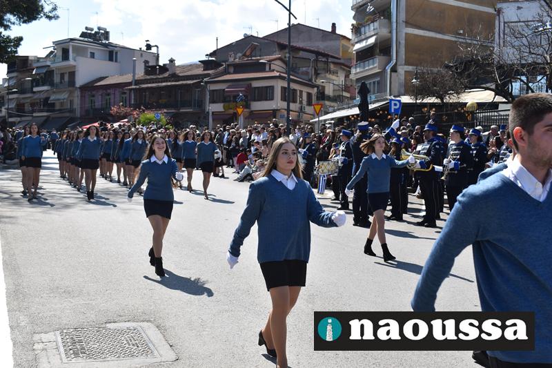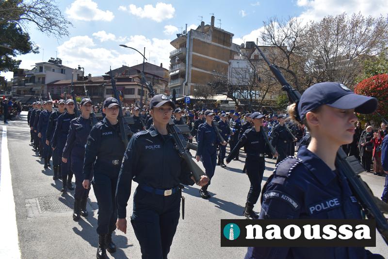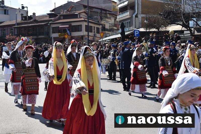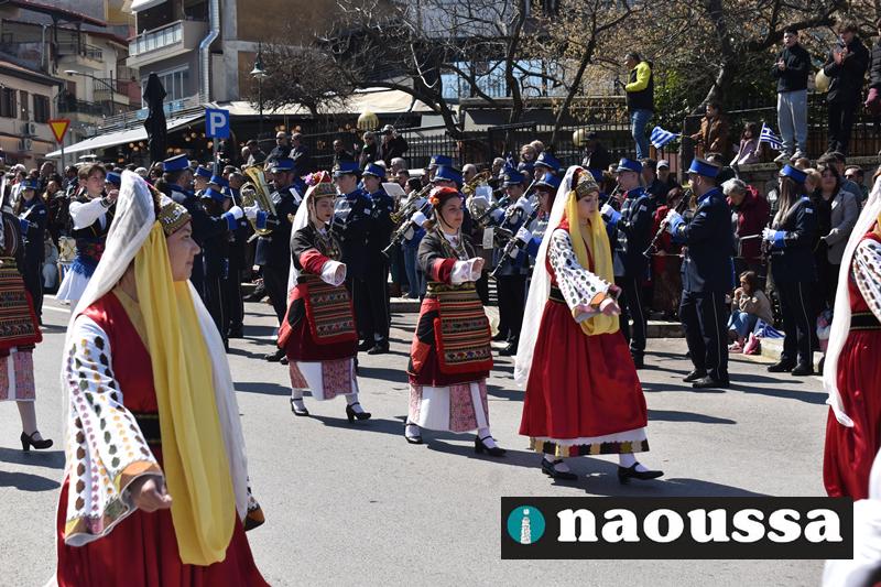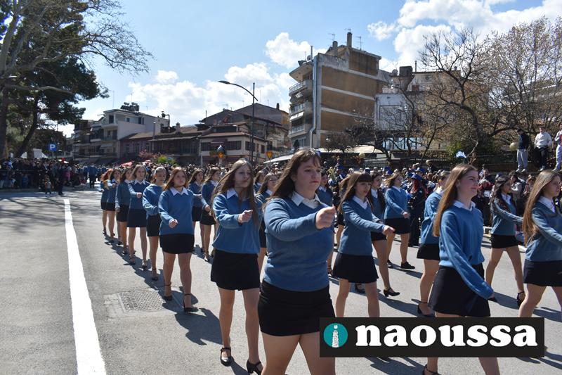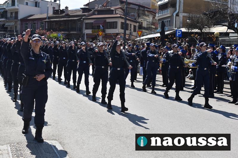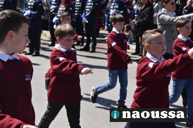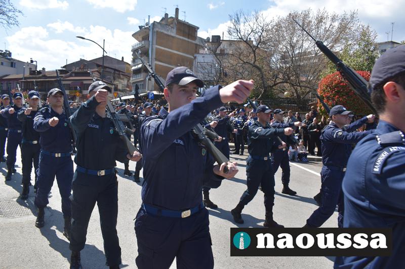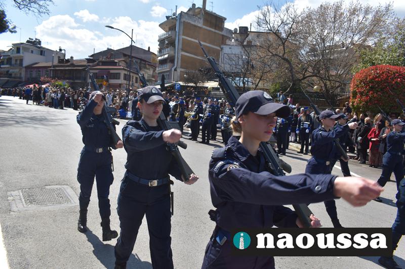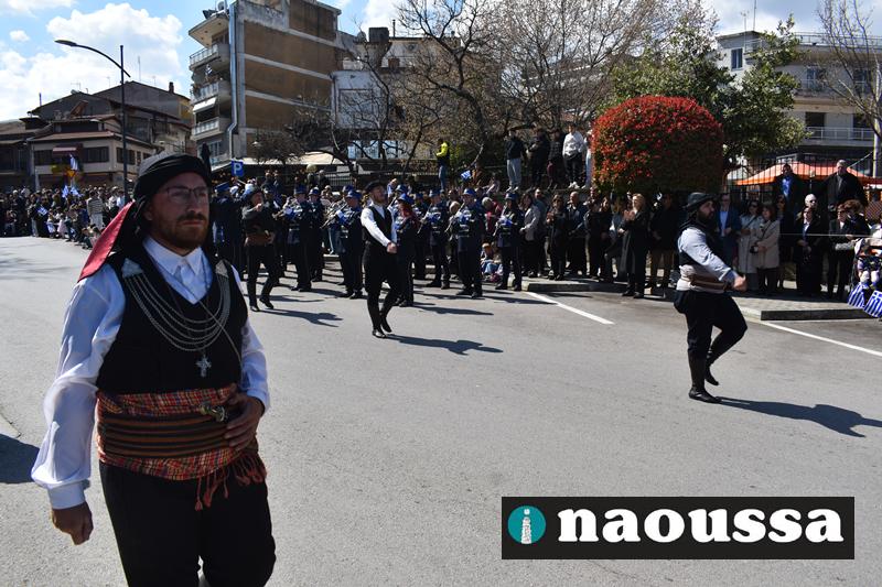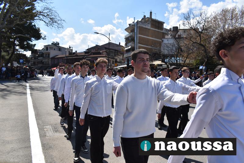 Τα μέλη των πολιτιστικών, οι μαθητές των σχολείων, οι σπουδαστές της σχολής Αστυφυλάκων και άνδρες της Β΄Μοίρας Καταδρομών παρήλασαν καταχειροκροτούμενοι από τους κατοίκους της Νάουσας.