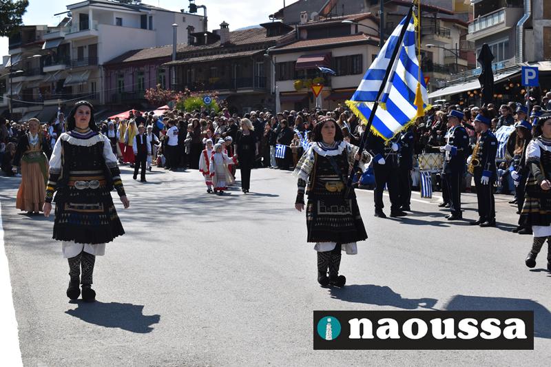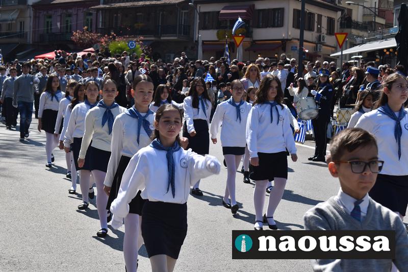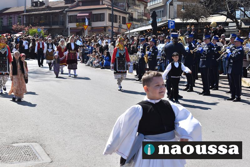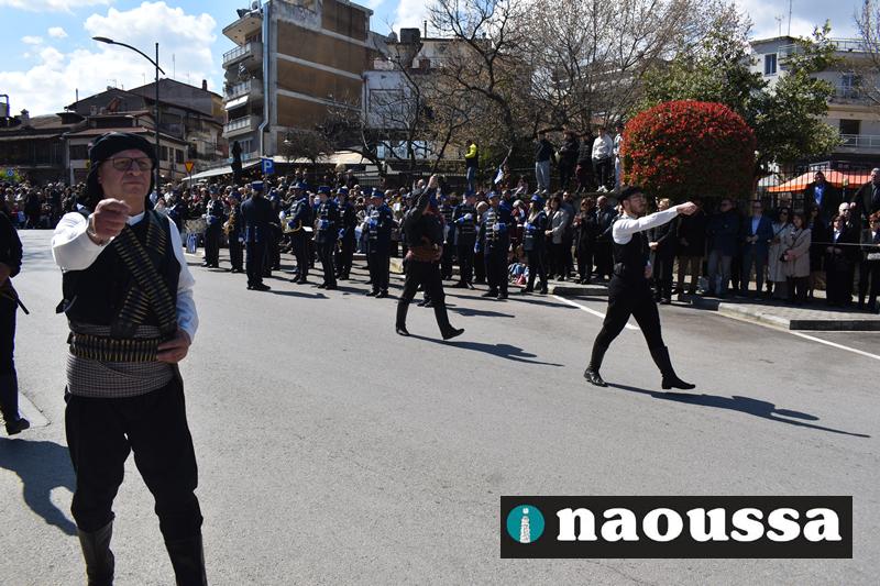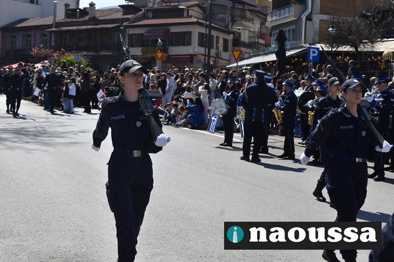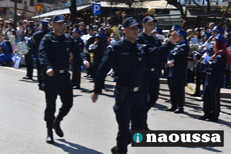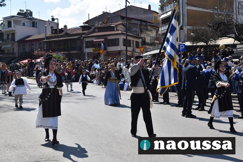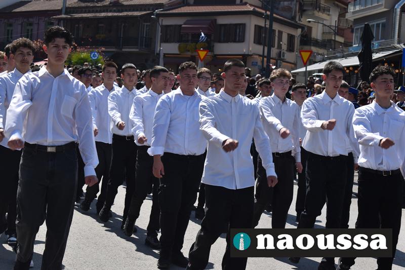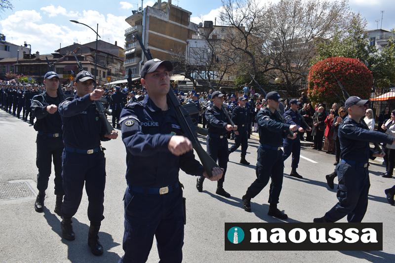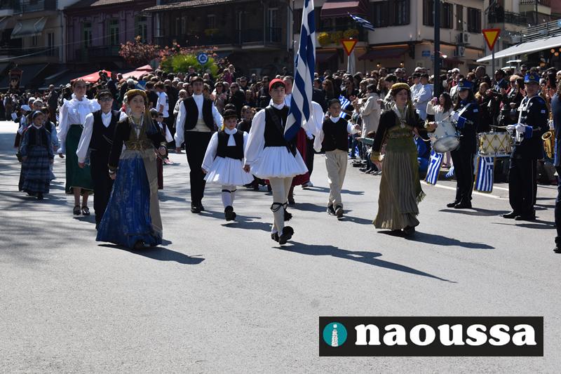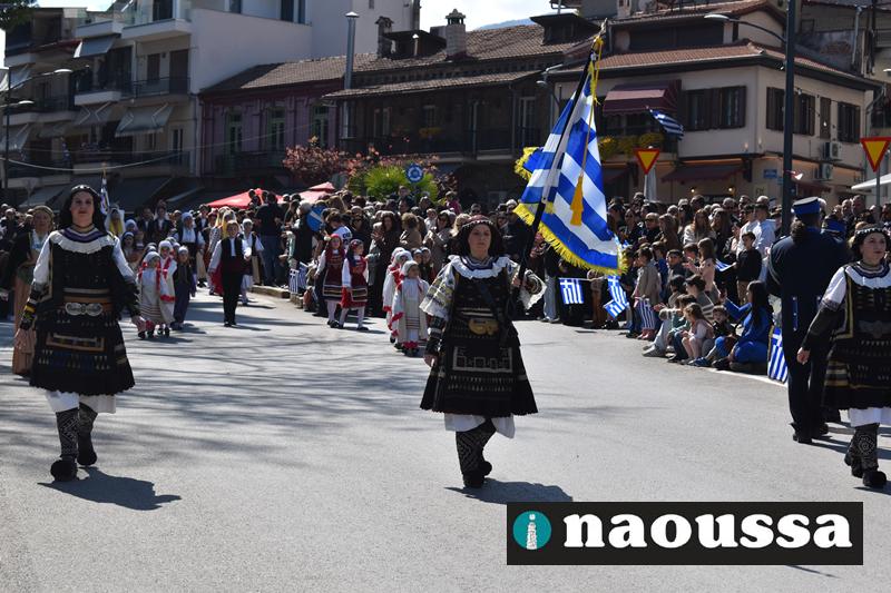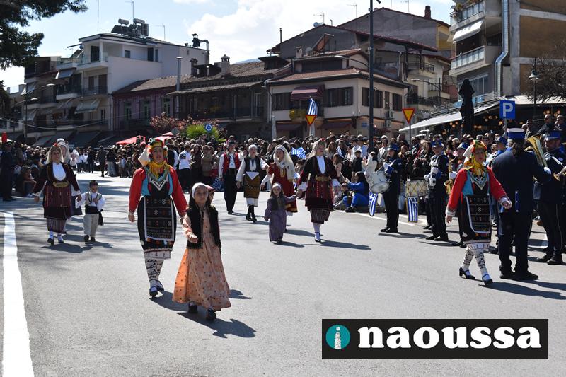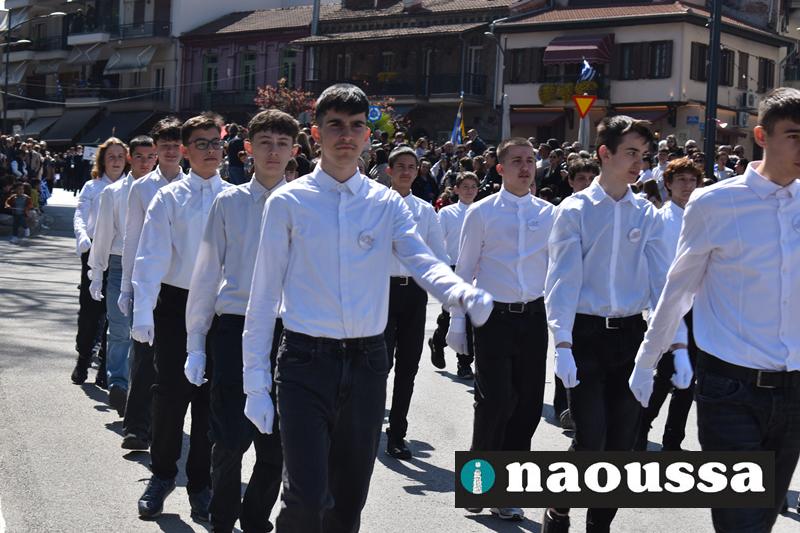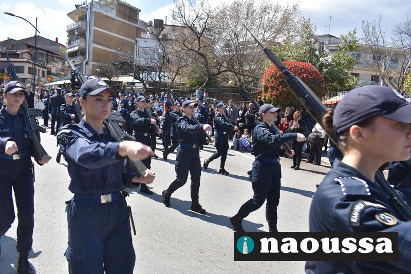 Τα μέλη των πολιτιστικών, οι μαθητές των σχολείων, οι σπουδαστές της σχολής Αστυφυλάκων και άνδρες της Β΄Μοίρας Καταδρομών παρήλασαν καταχειροκροτούμενοι από τους κατοίκους της Νάουσας.