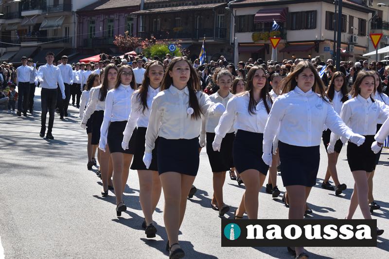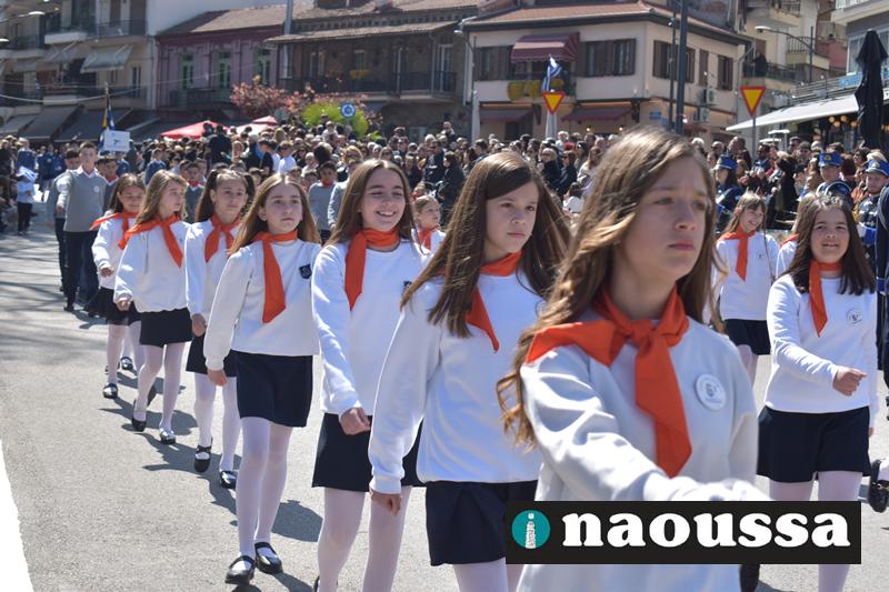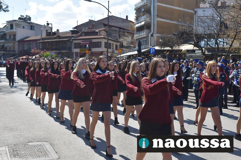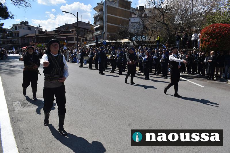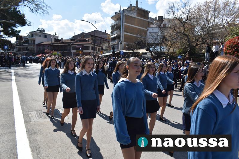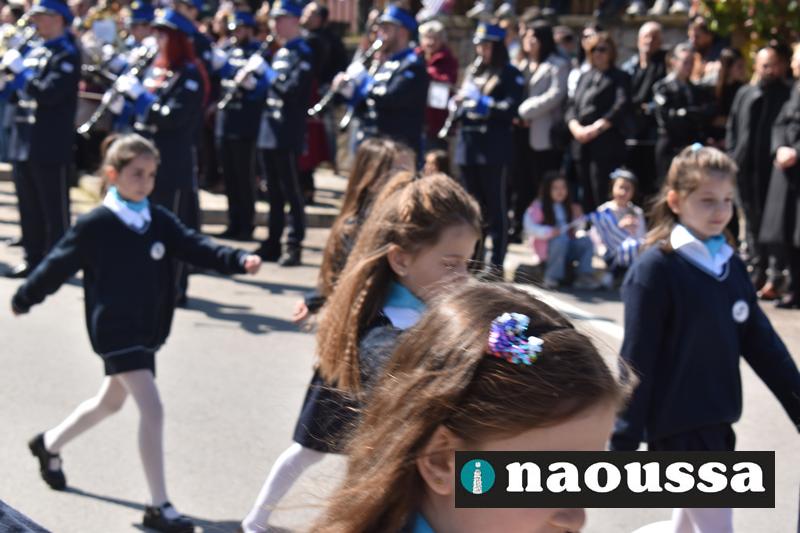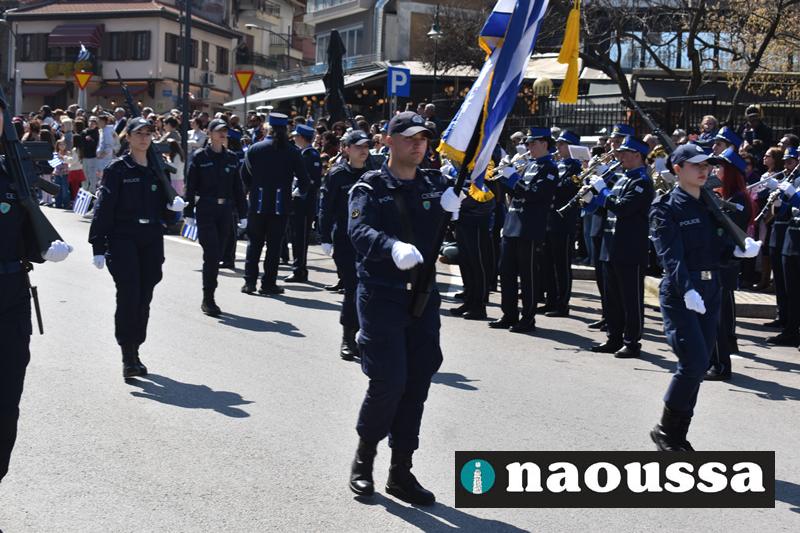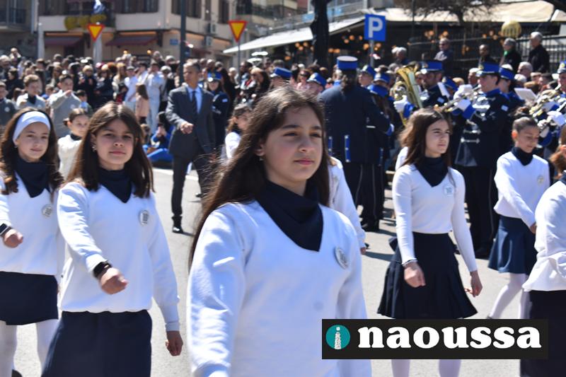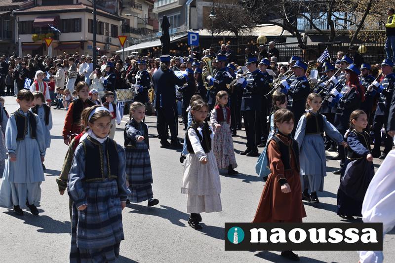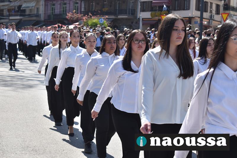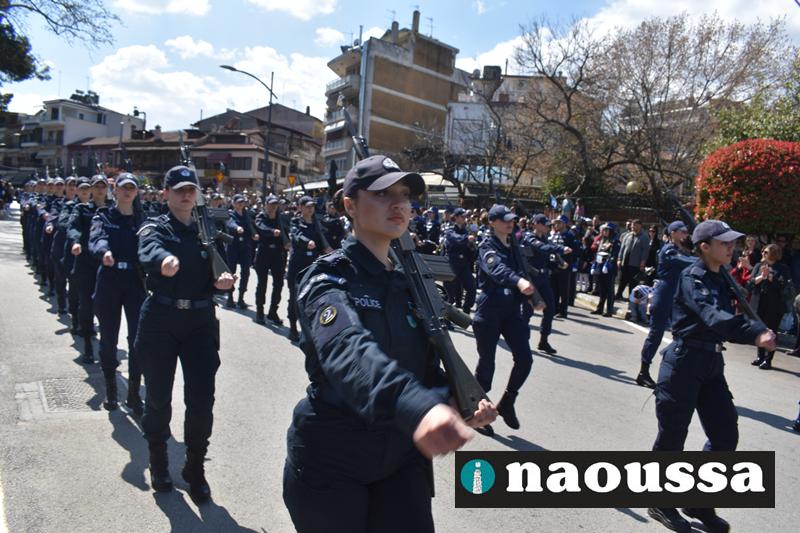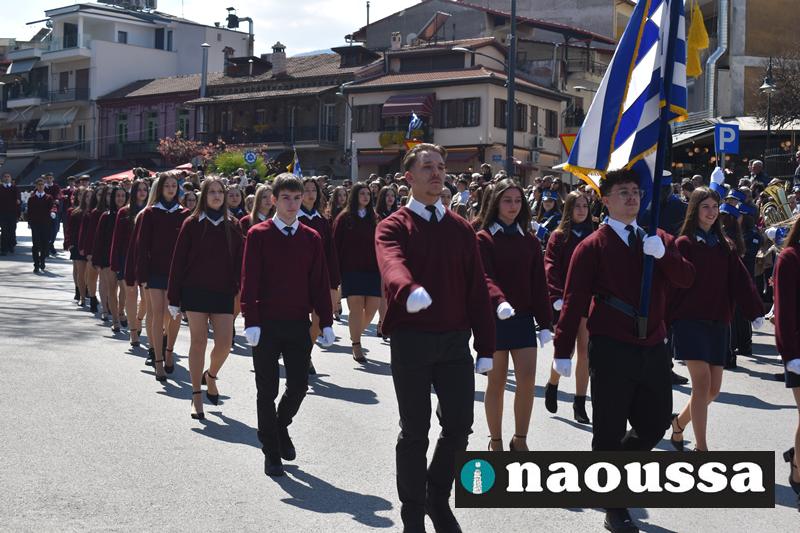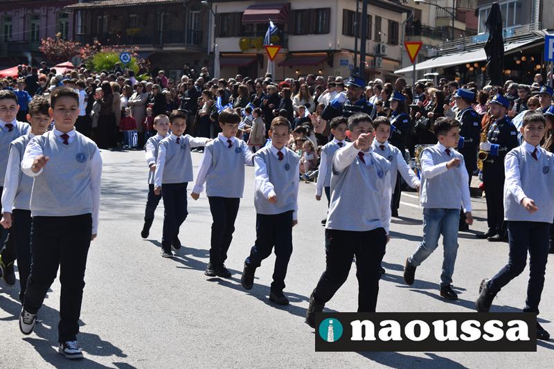 Τα μέλη των πολιτιστικών, οι μαθητές των σχολείων, οι σπουδαστές της σχολής Αστυφυλάκων και άνδρες της Β΄Μοίρας Καταδρομών παρήλασαν καταχειροκροτούμενοι από τους κατοίκους της Νάουσας.