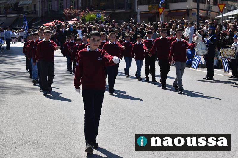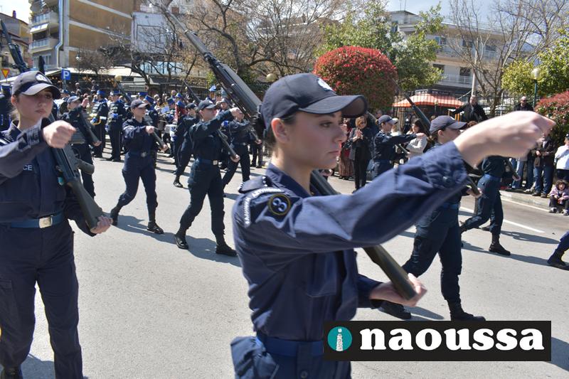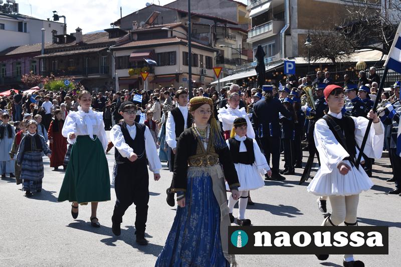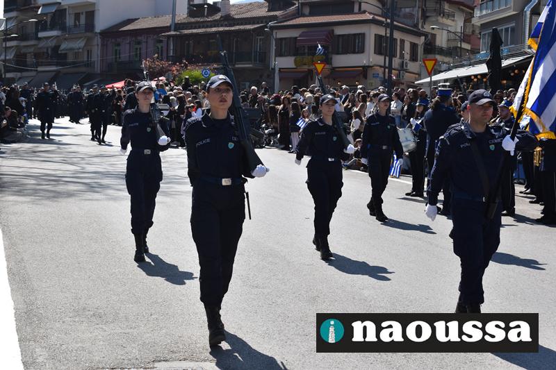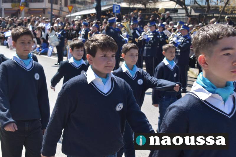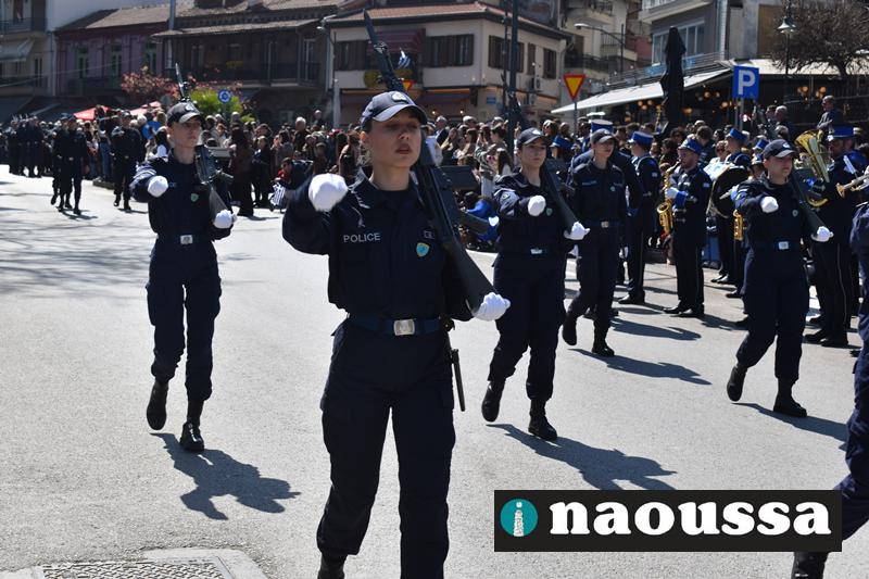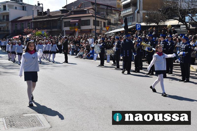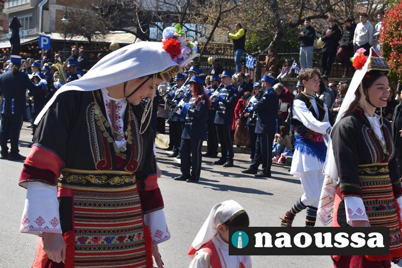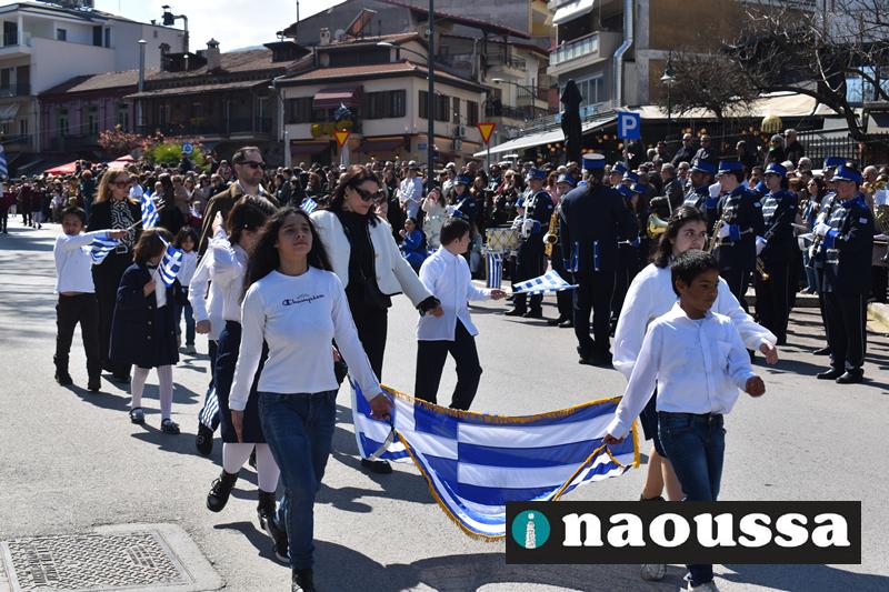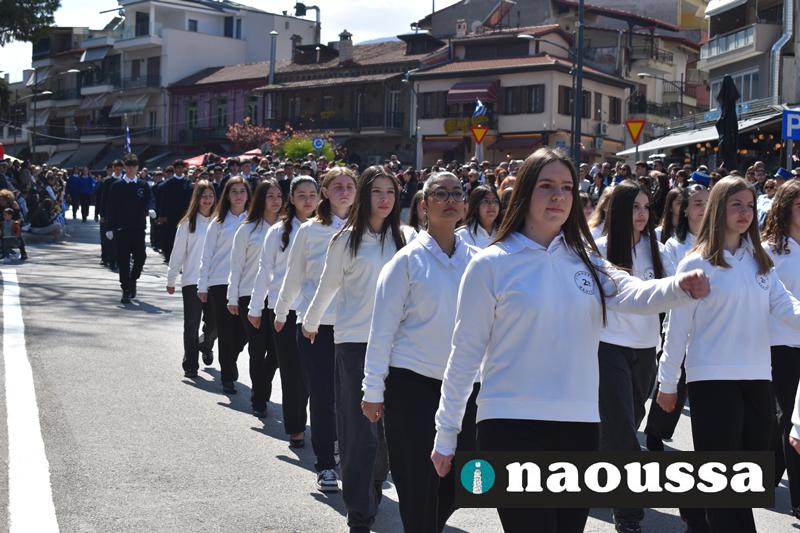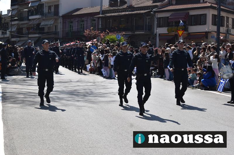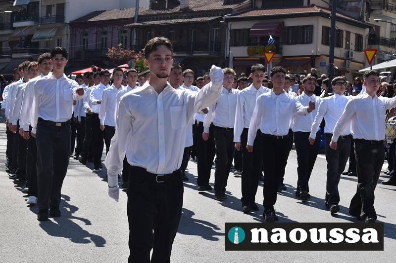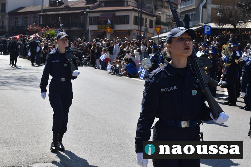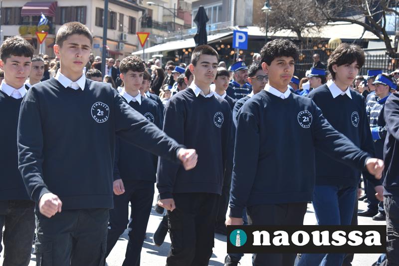 Τα μέλη των πολιτιστικών, οι μαθητές των σχολείων, οι σπουδαστές της σχολής Αστυφυλάκων και άνδρες της Β΄Μοίρας Καταδρομών παρήλασαν καταχειροκροτούμενοι από τους κατοίκους της Νάουσας.