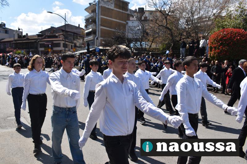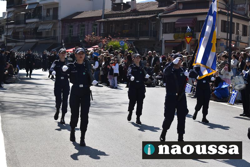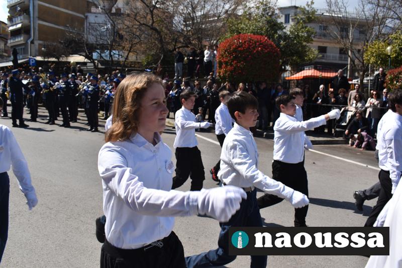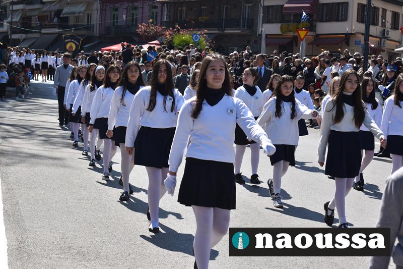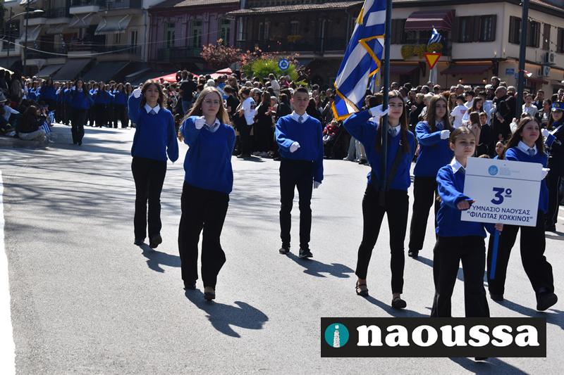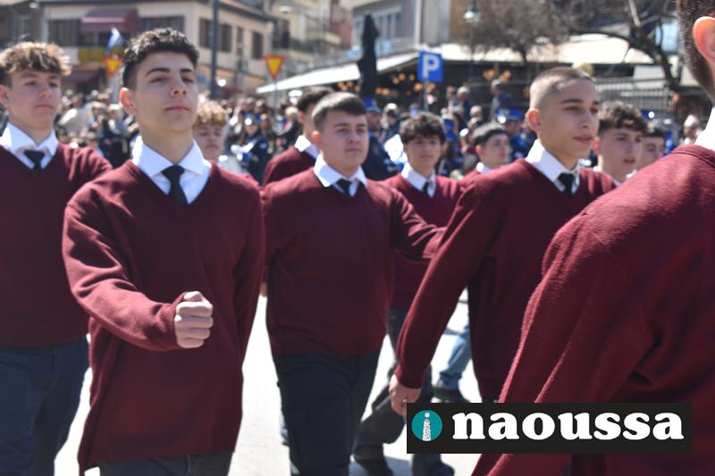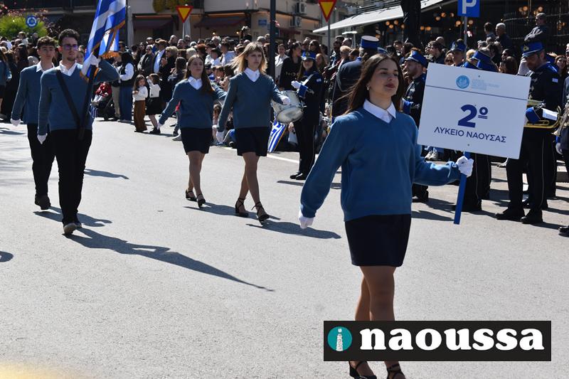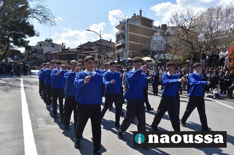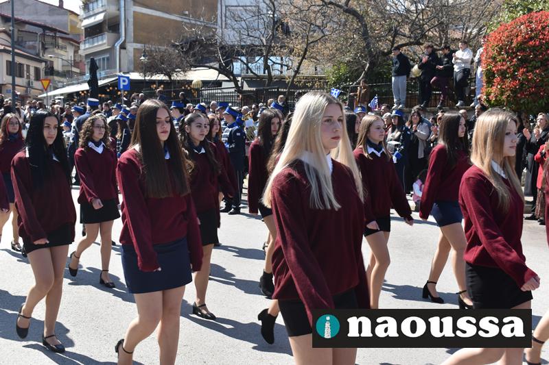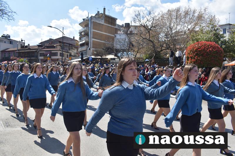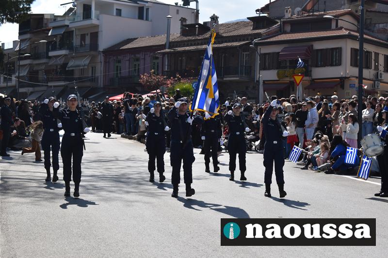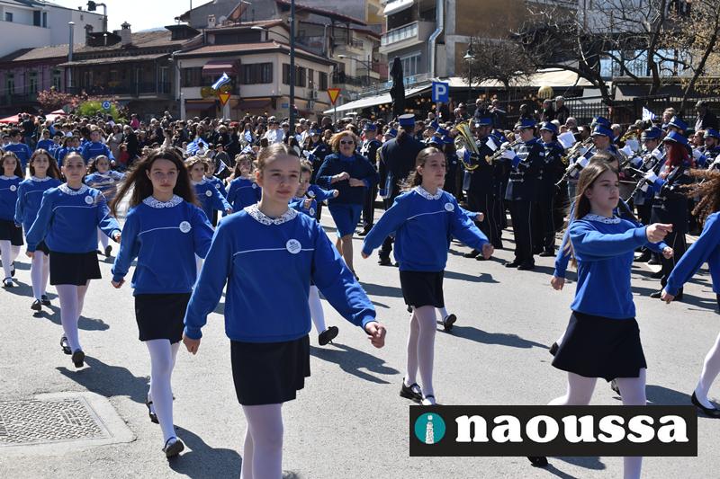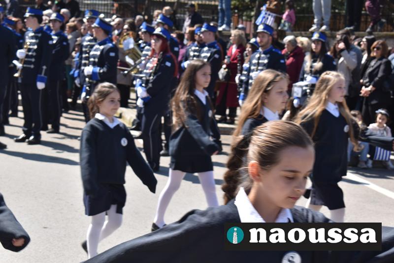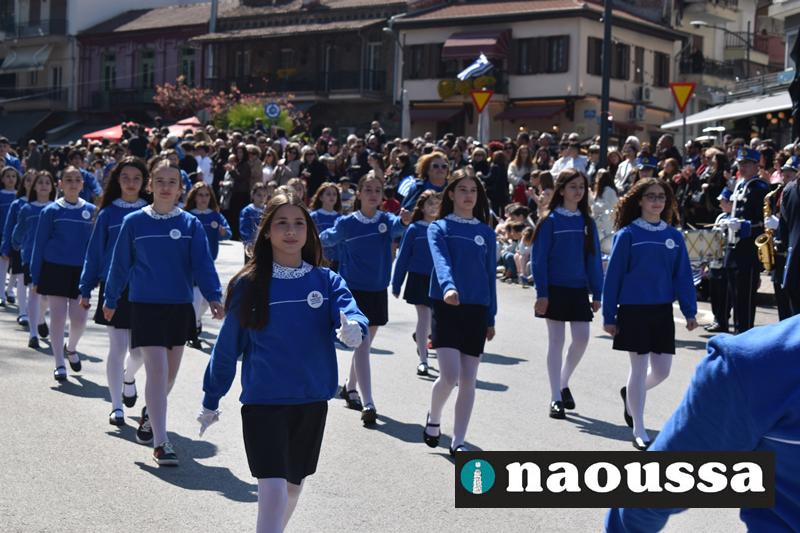 Τα μέλη των πολιτιστικών, οι μαθητές των σχολείων, οι σπουδαστές της σχολής Αστυφυλάκων και άνδρες της Β΄Μοίρας Καταδρομών παρήλασαν καταχειροκροτούμενοι από τους κατοίκους της Νάουσας.