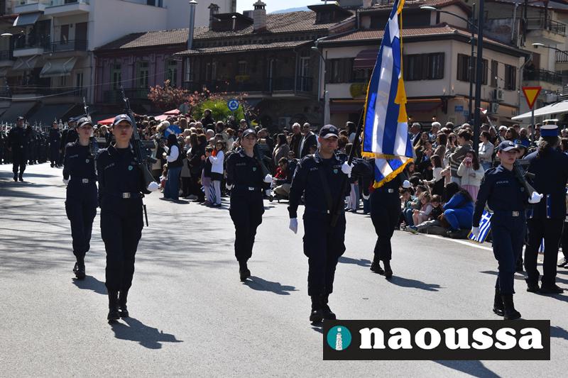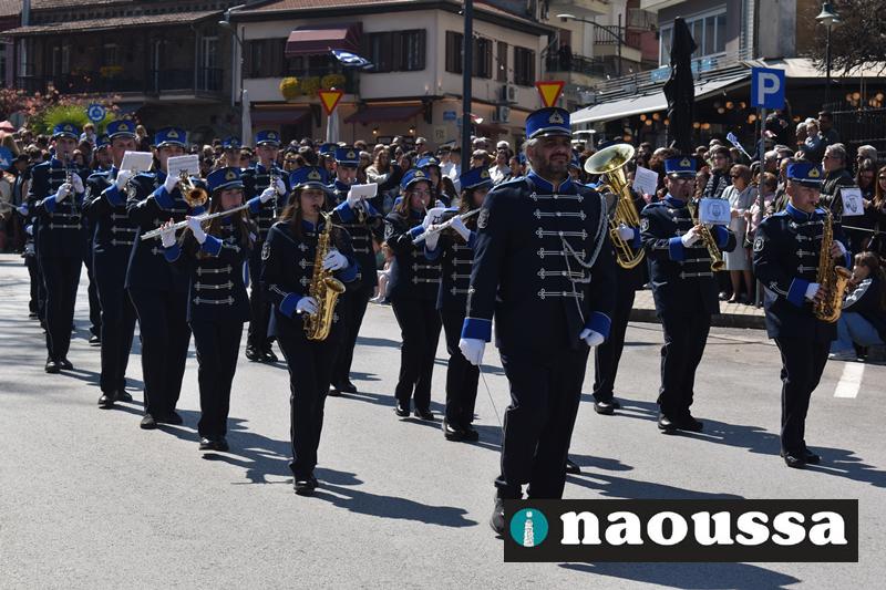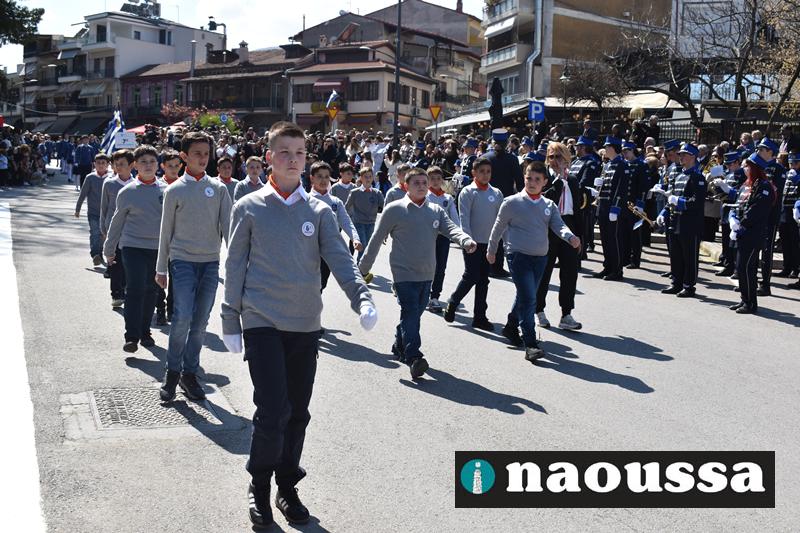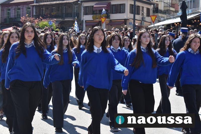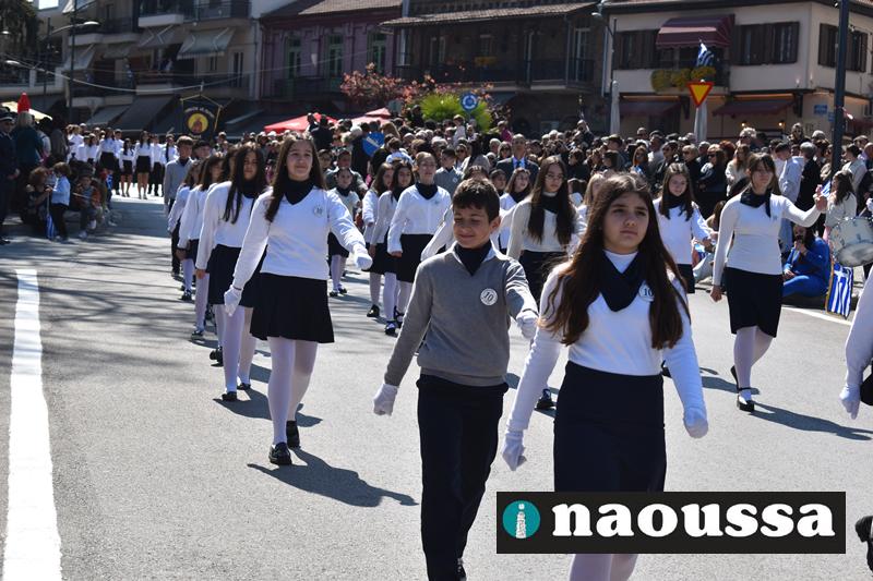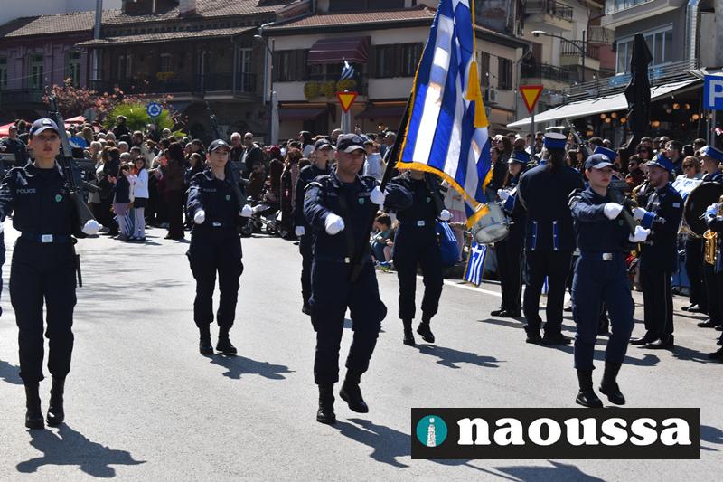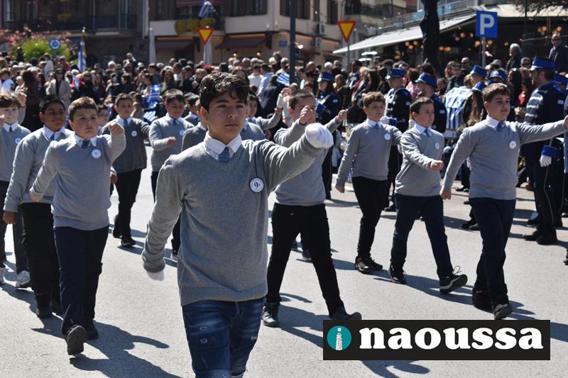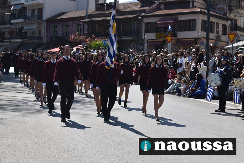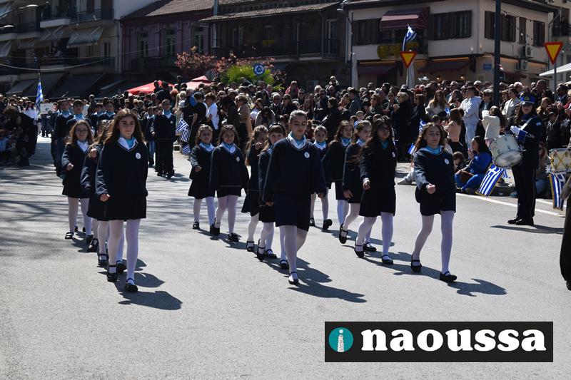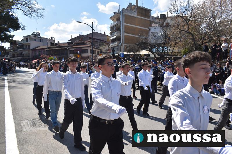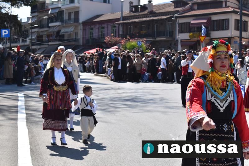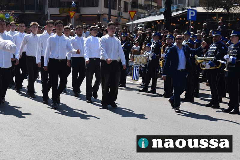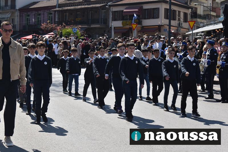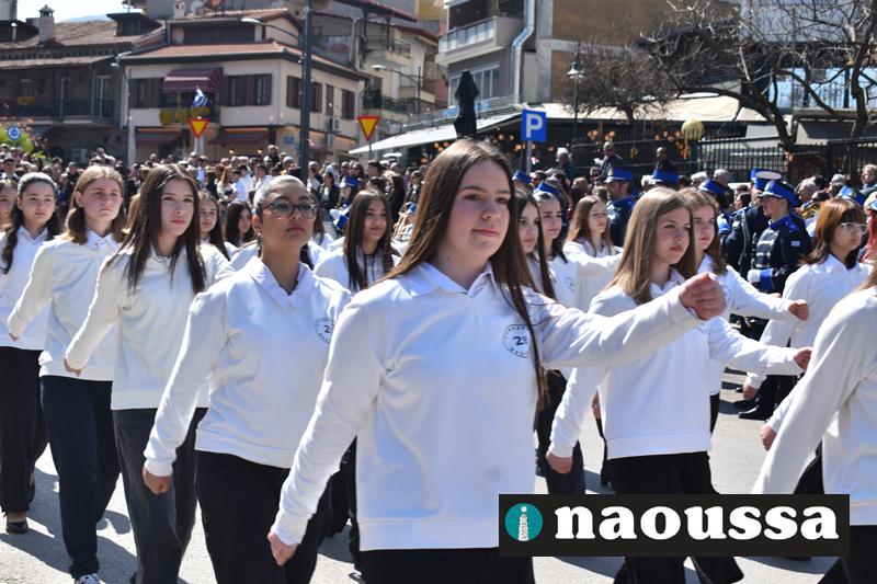 Τα μέλη των πολιτιστικών, οι μαθητές των σχολείων, οι σπουδαστές της σχολής Αστυφυλάκων και άνδρες της Β΄Μοίρας Καταδρομών παρήλασαν καταχειροκροτούμενοι από τους κατοίκους της Νάουσας.
