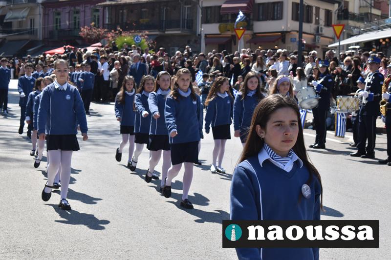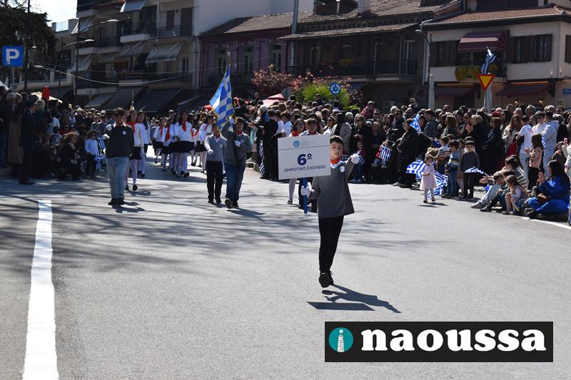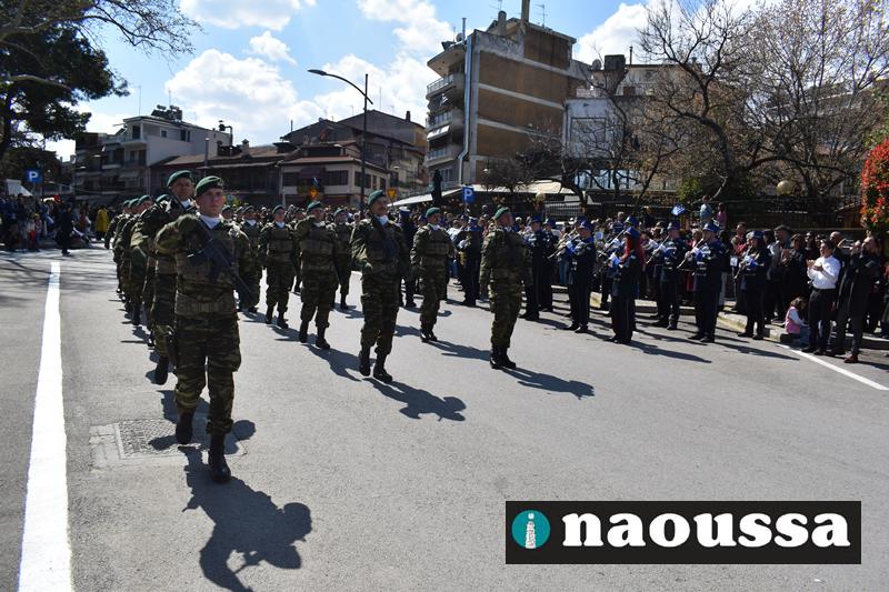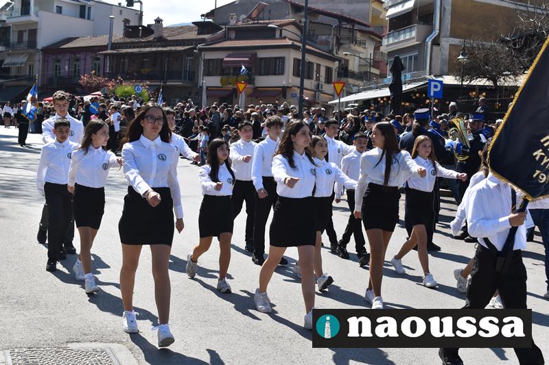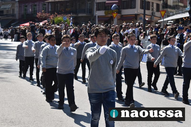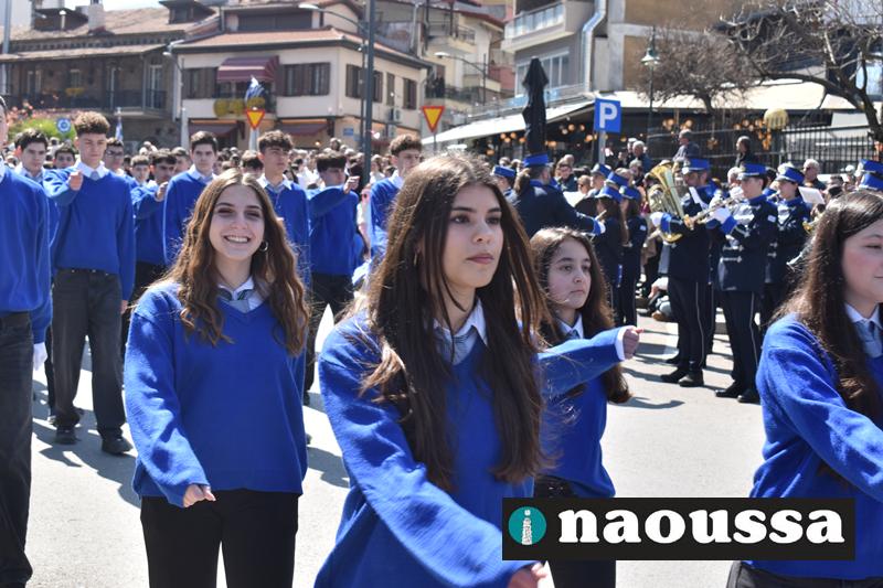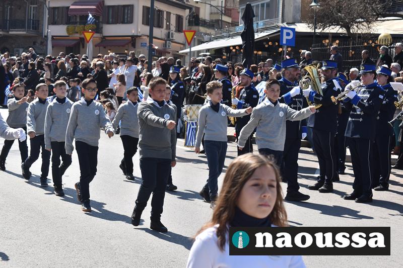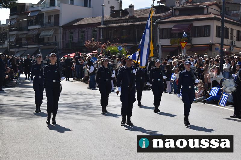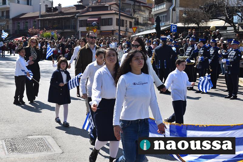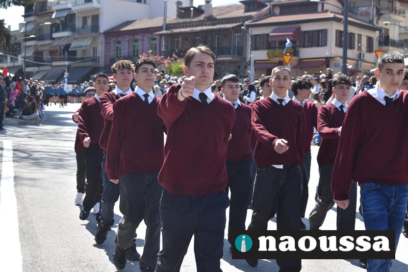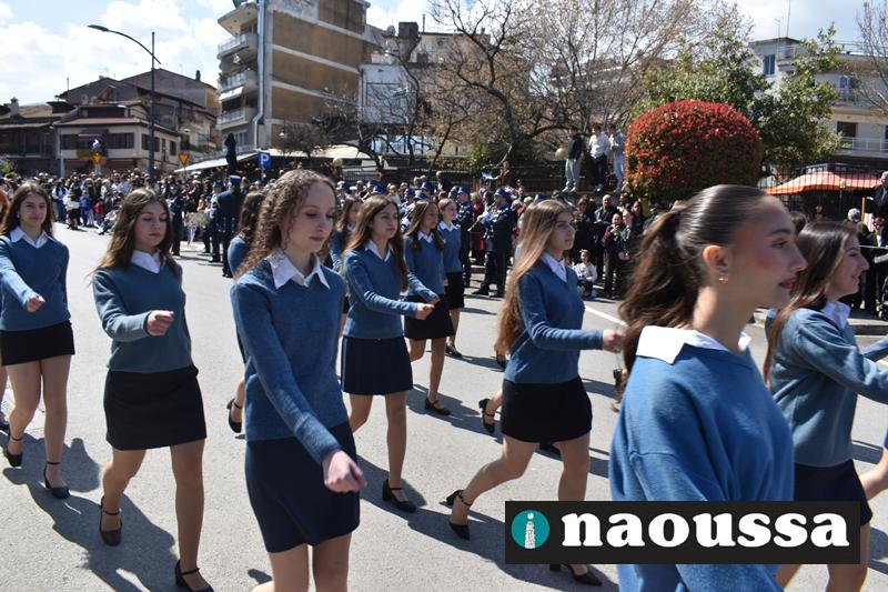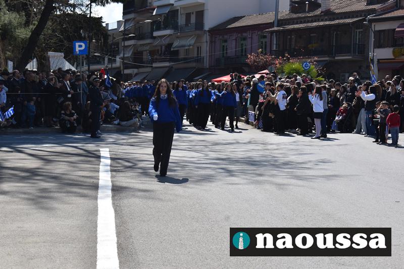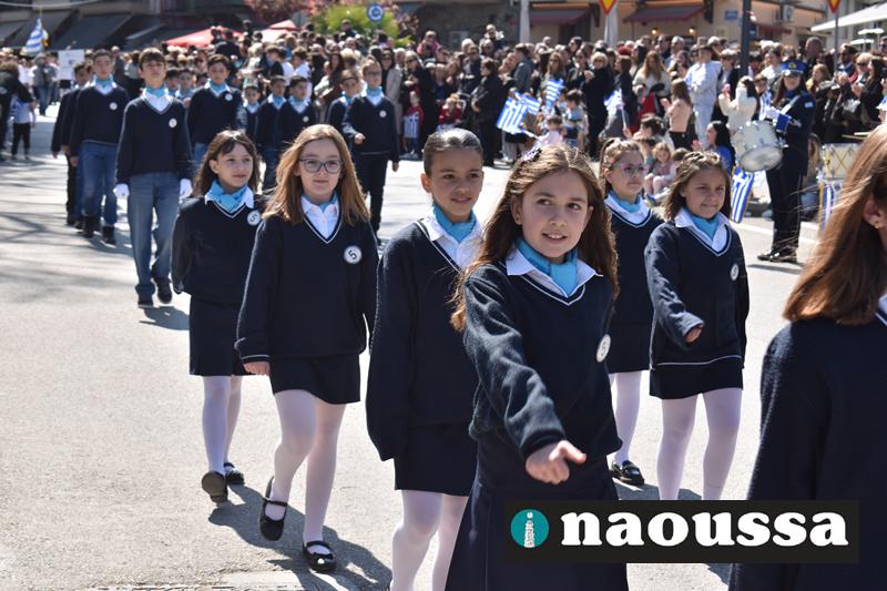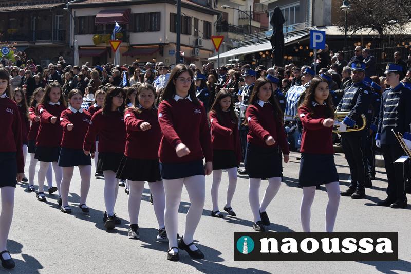 Τα μέλη των πολιτιστικών, οι μαθητές των σχολείων, οι σπουδαστές της σχολής Αστυφυλάκων και άνδρες της Β΄Μοίρας Καταδρομών παρήλασαν καταχειροκροτούμενοι από τους κατοίκους της Νάουσας.