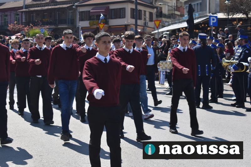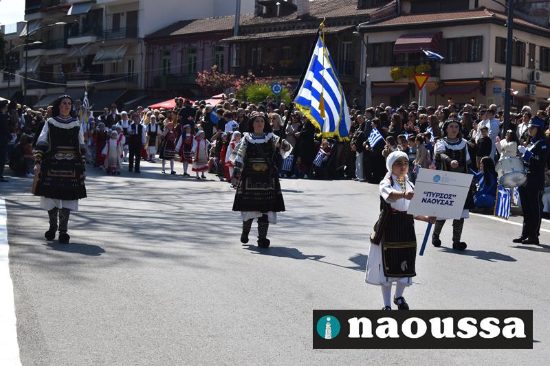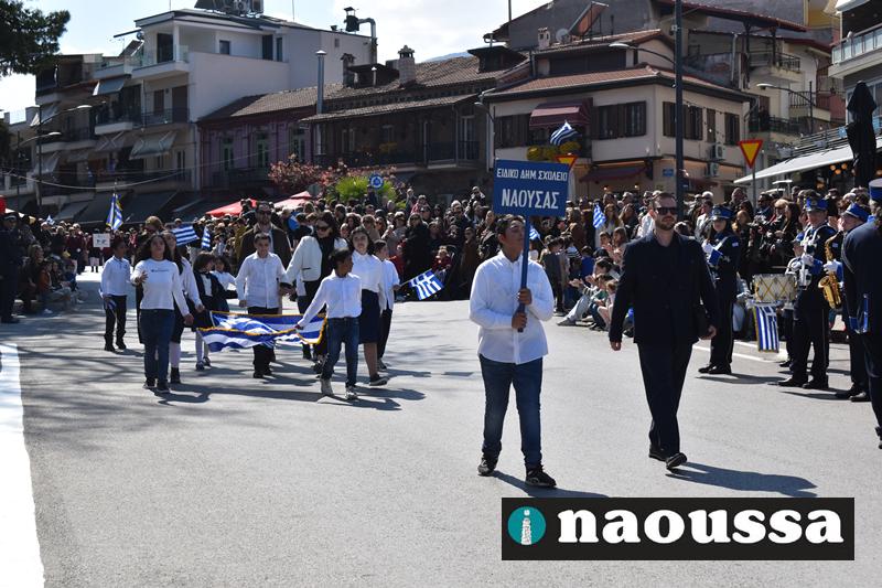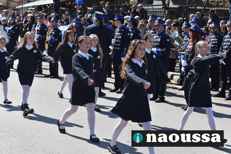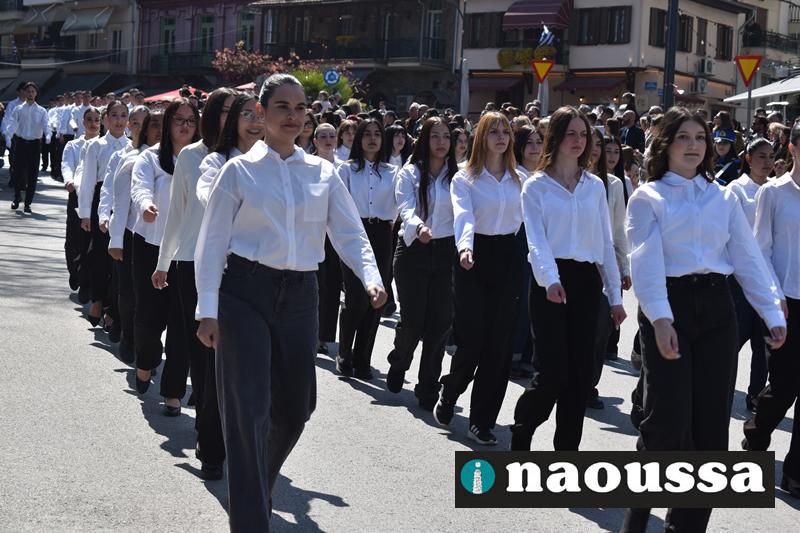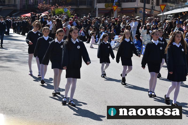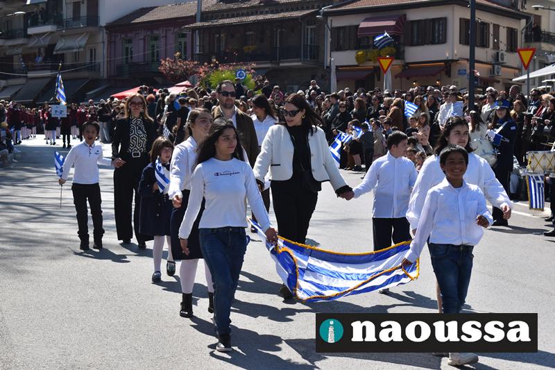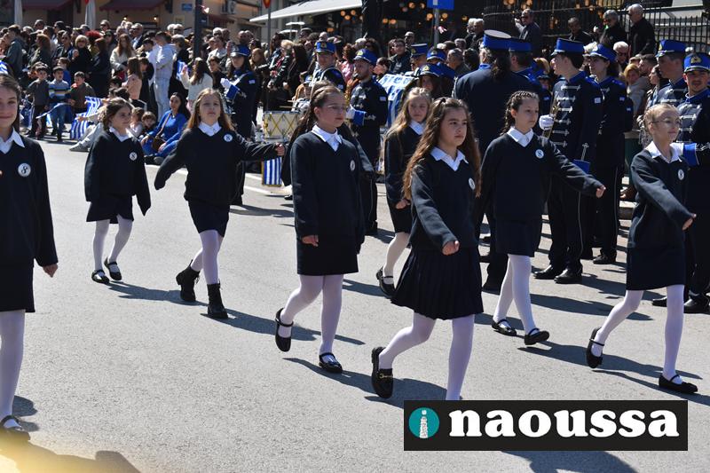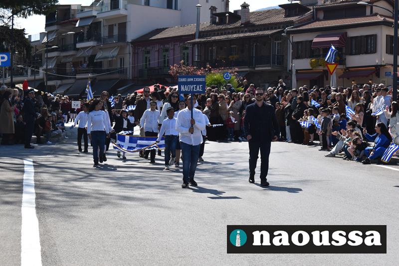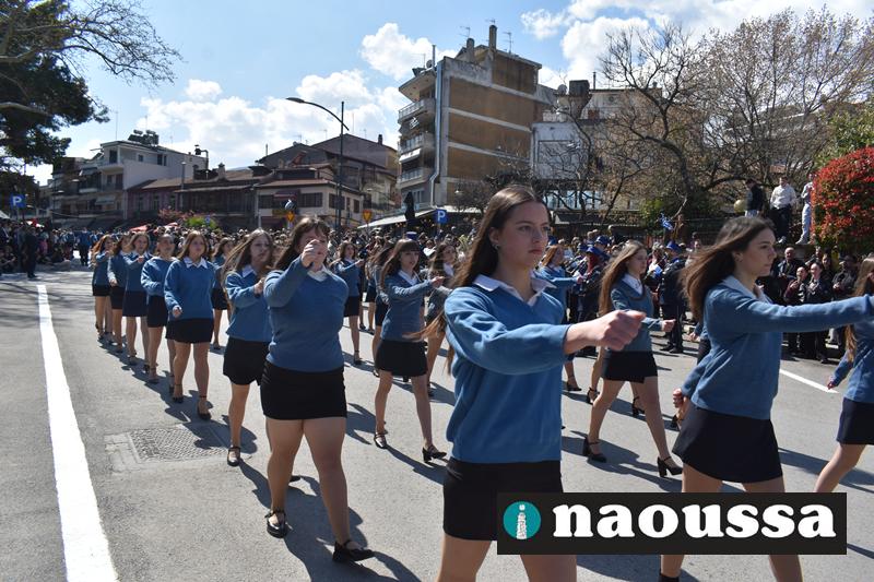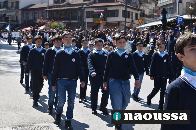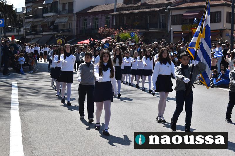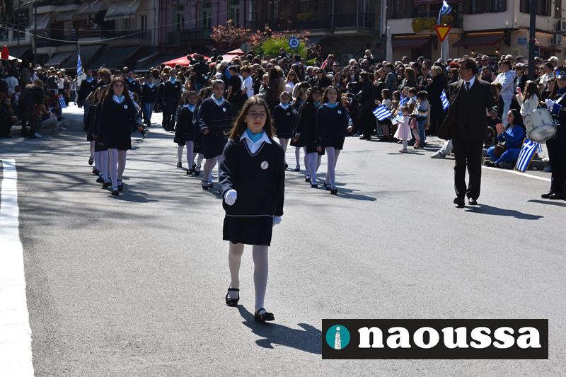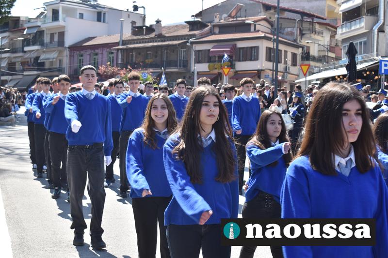 Τα μέλη των πολιτιστικών, οι μαθητές των σχολείων, οι σπουδαστές της σχολής Αστυφυλάκων και άνδρες της Β΄Μοίρας Καταδρομών παρήλασαν καταχειροκροτούμενοι από τους κατοίκους της Νάουσας.