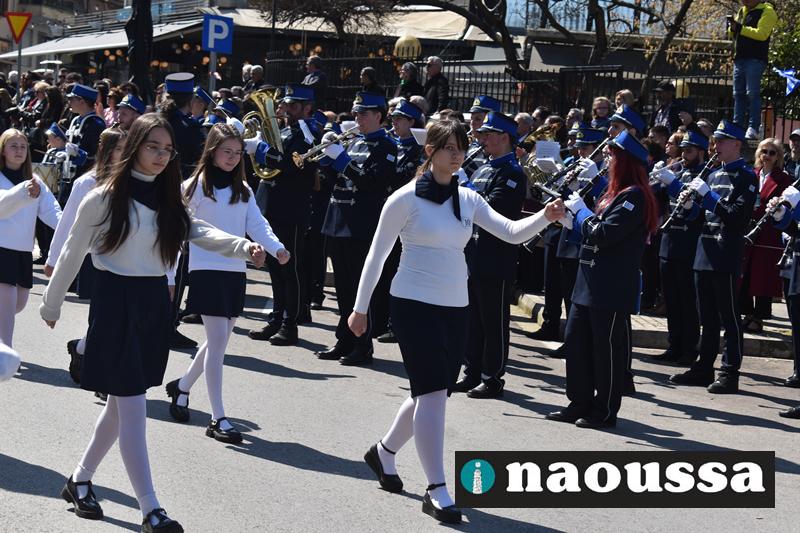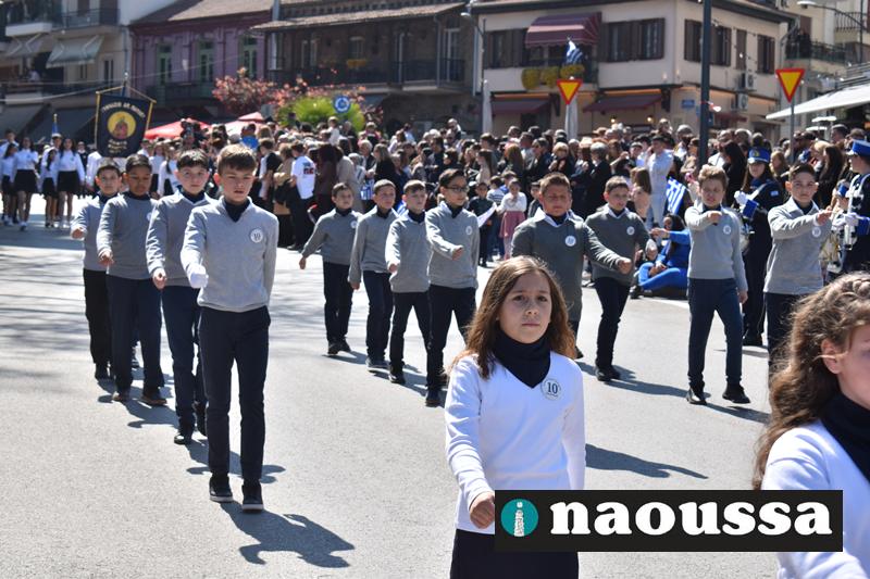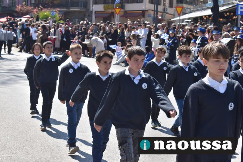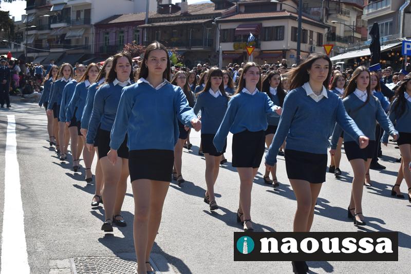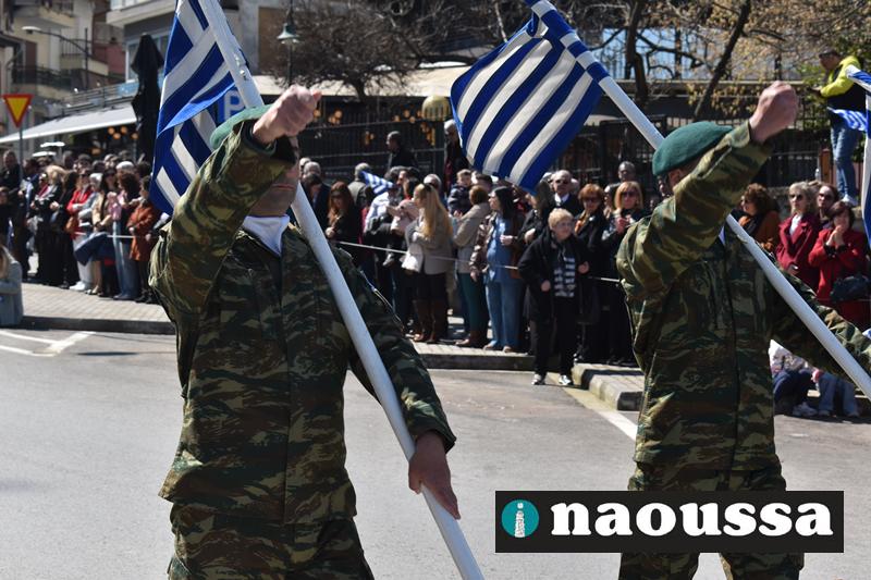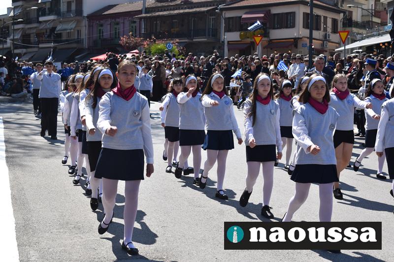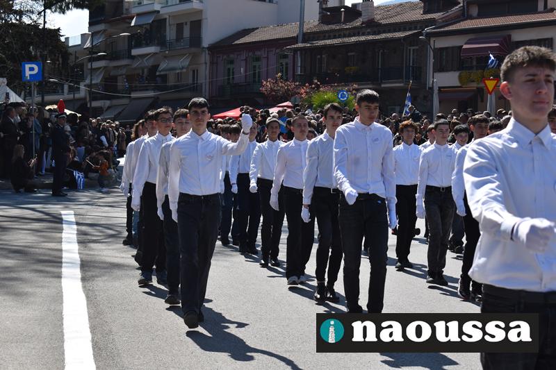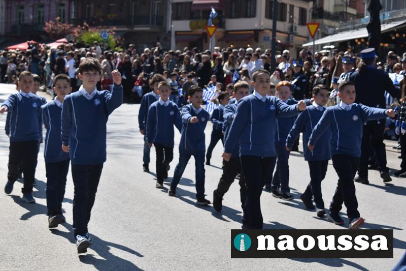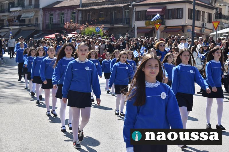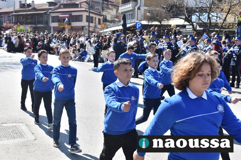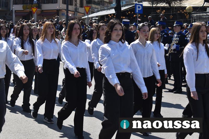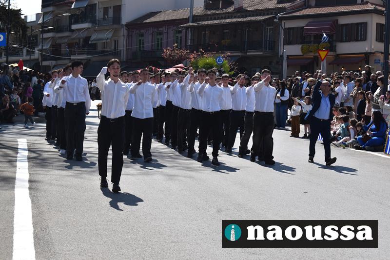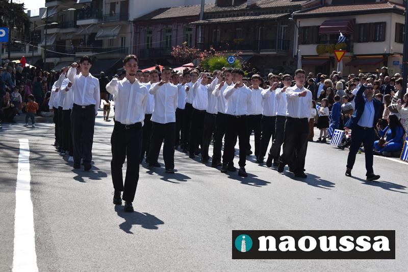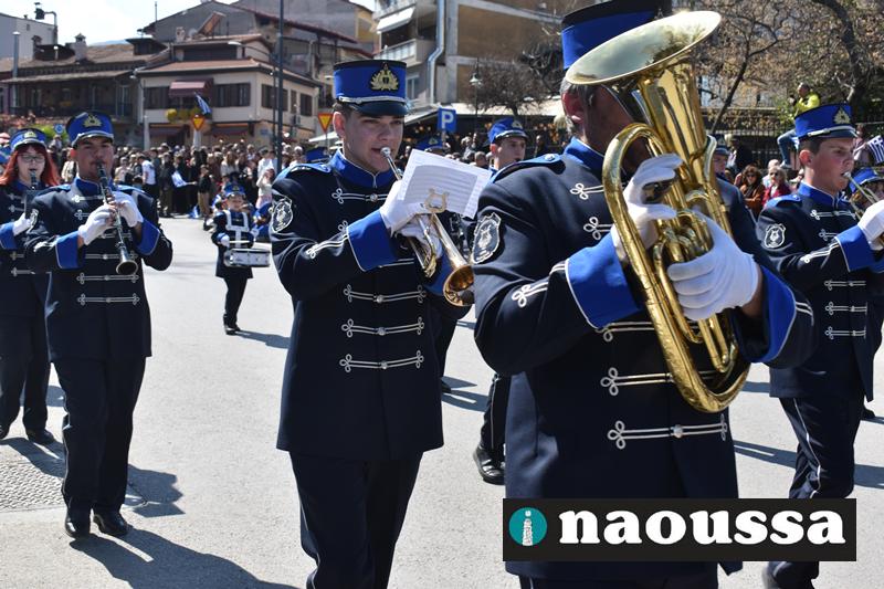 Τα μέλη των πολιτιστικών, οι μαθητές των σχολείων, οι σπουδαστές της σχολής Αστυφυλάκων και άνδρες της Β΄Μοίρας Καταδρομών παρήλασαν καταχειροκροτούμενοι από τους κατοίκους της Νάουσας.