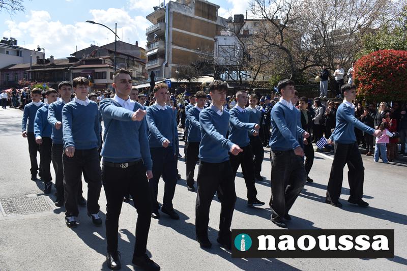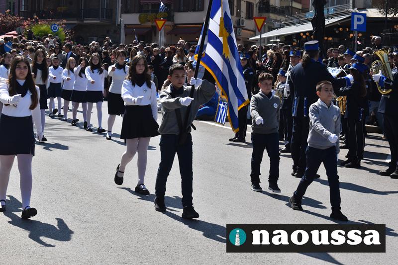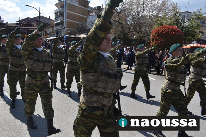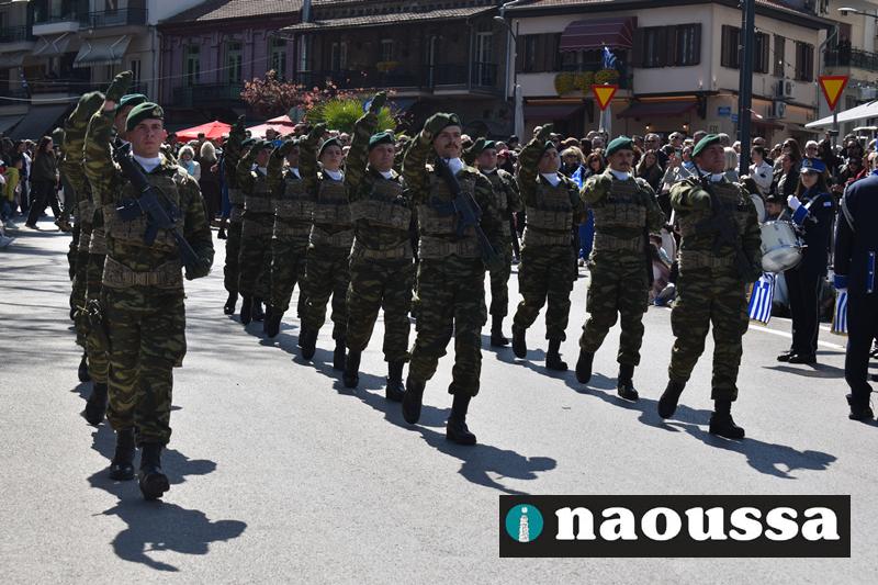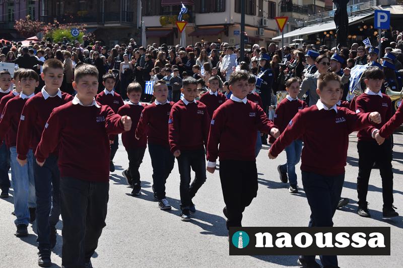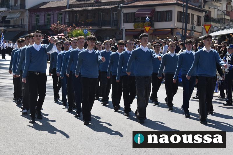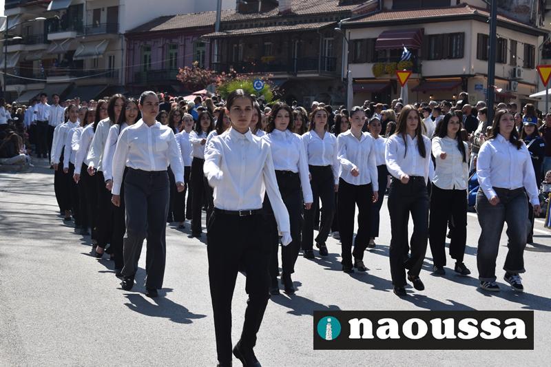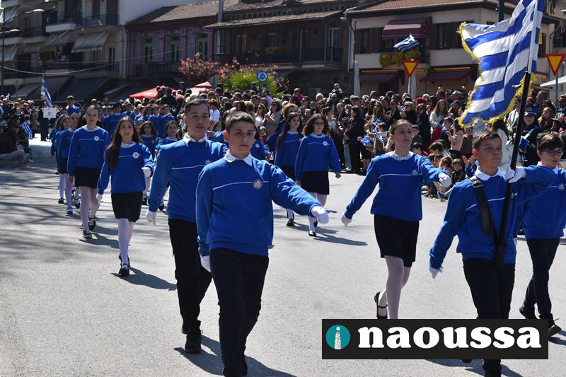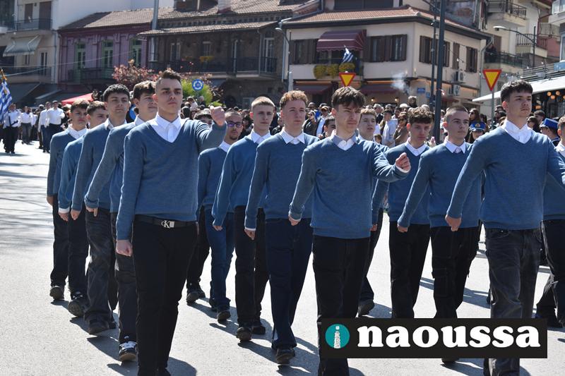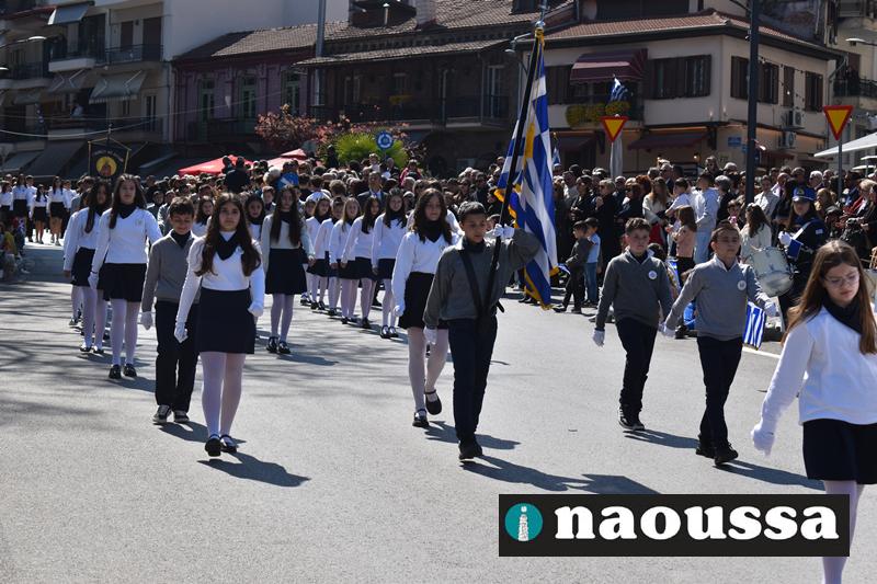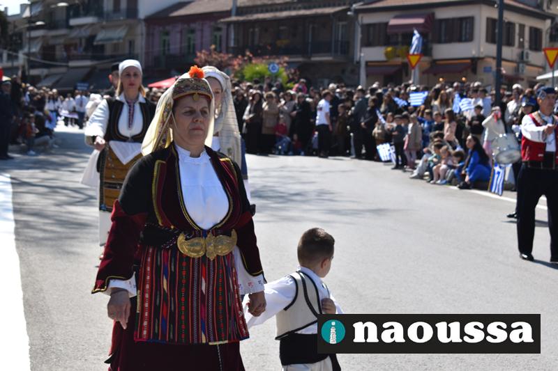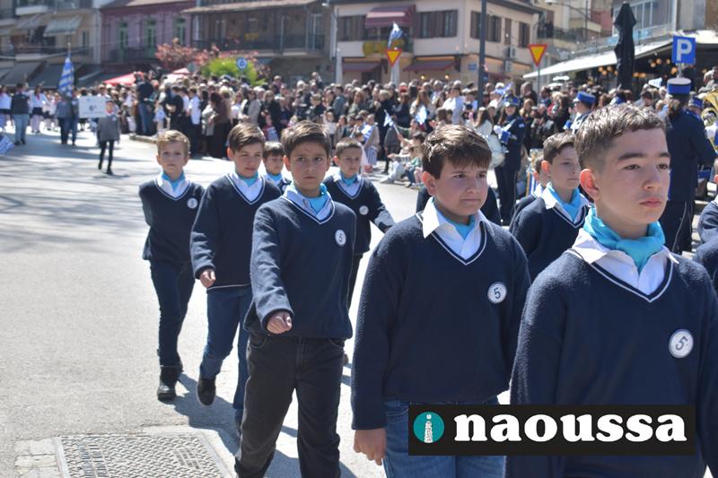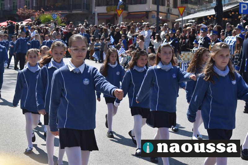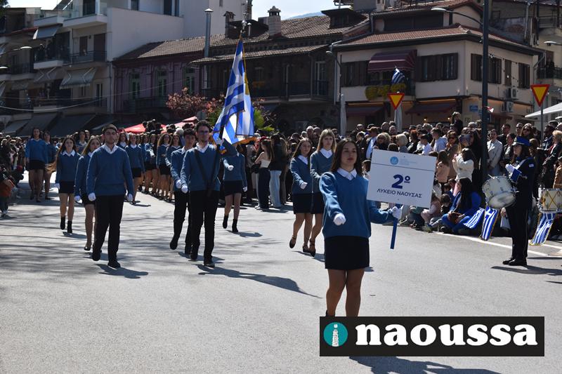 Τα μέλη των πολιτιστικών, οι μαθητές των σχολείων, οι σπουδαστές της σχολής Αστυφυλάκων και άνδρες της Β΄Μοίρας Καταδρομών παρήλασαν καταχειροκροτούμενοι από τους κατοίκους της Νάουσας.