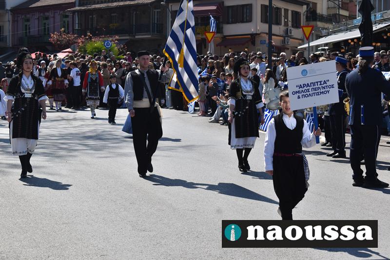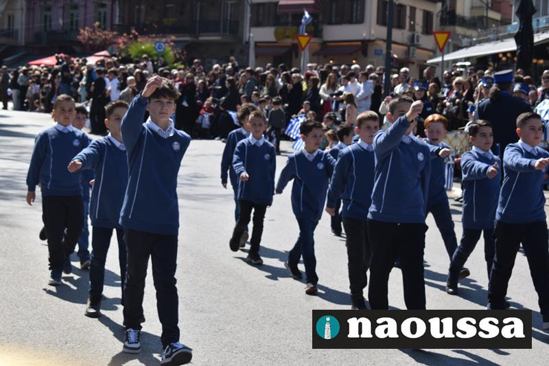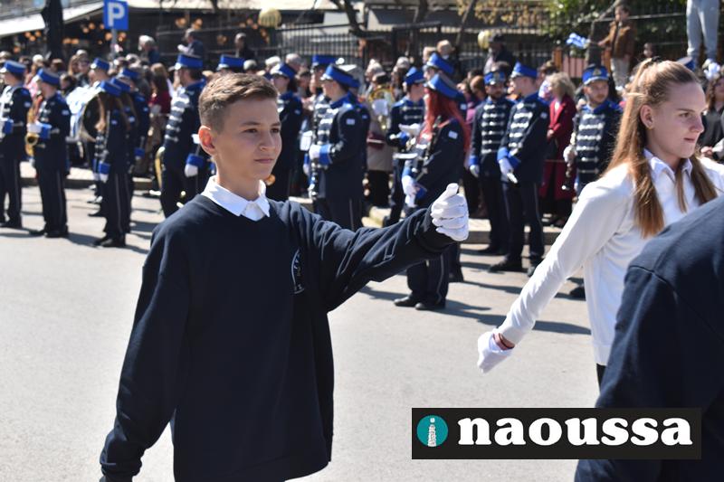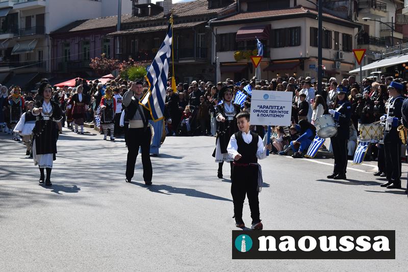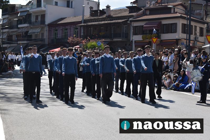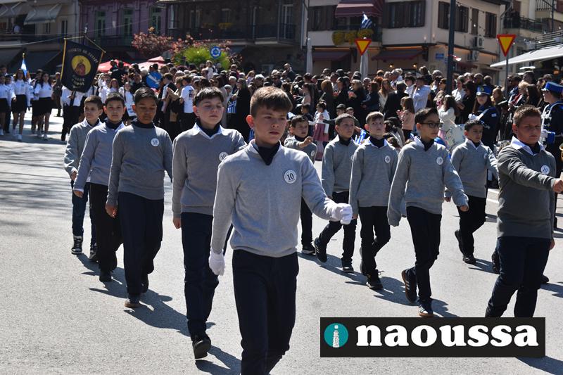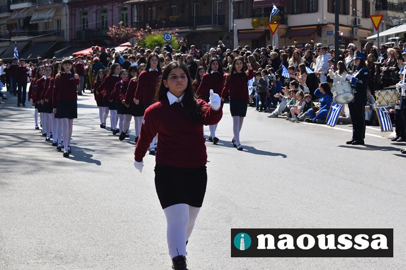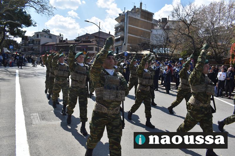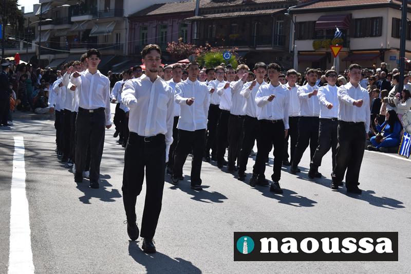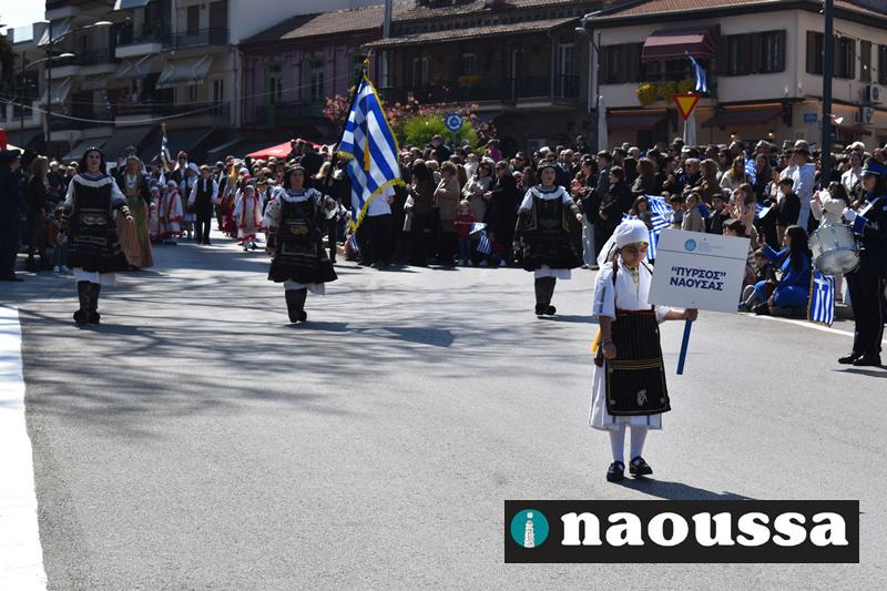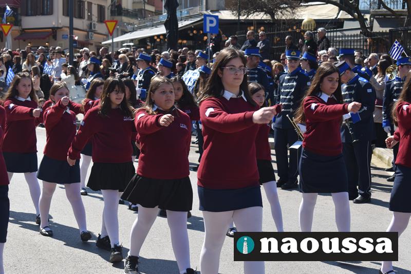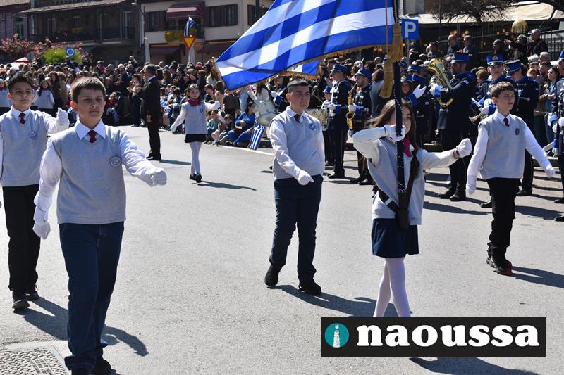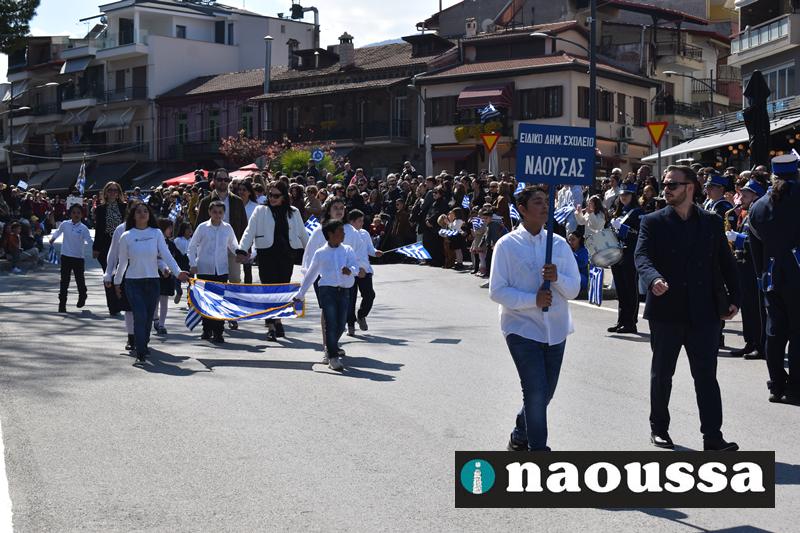 Τα μέλη των πολιτιστικών, οι μαθητές των σχολείων, οι σπουδαστές της σχολής Αστυφυλάκων και άνδρες της Β΄Μοίρας Καταδρομών παρήλασαν καταχειροκροτούμενοι από τους κατοίκους της Νάουσας.
