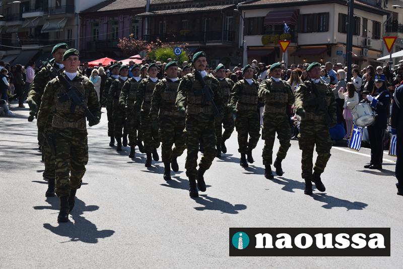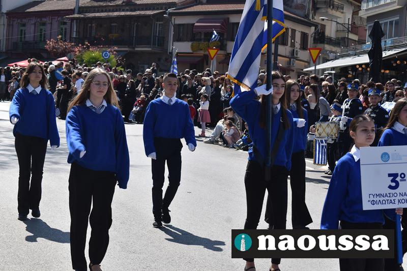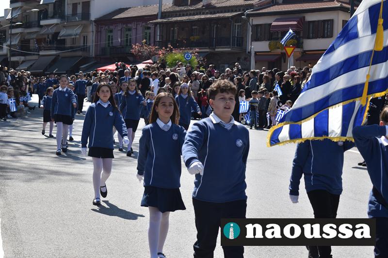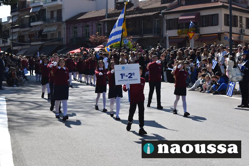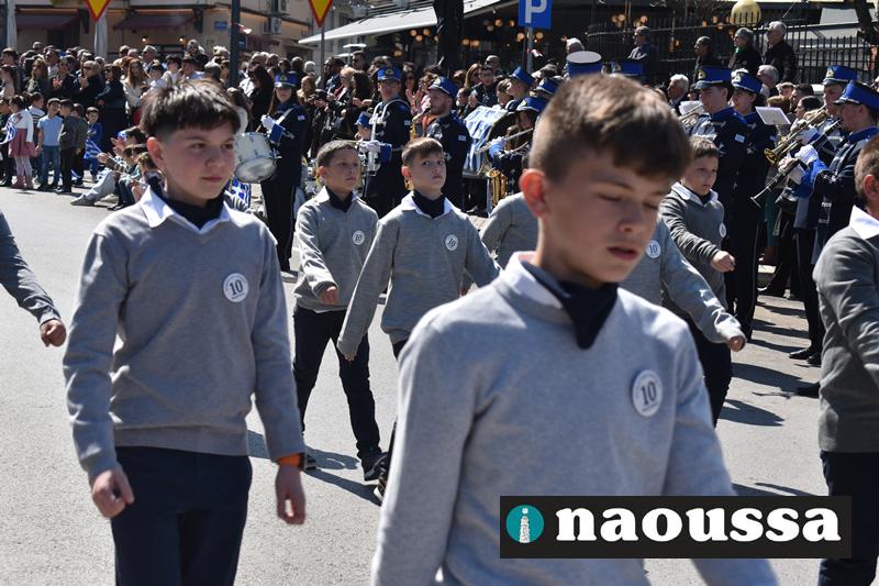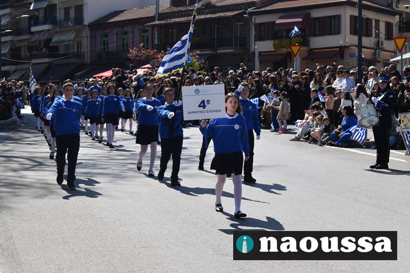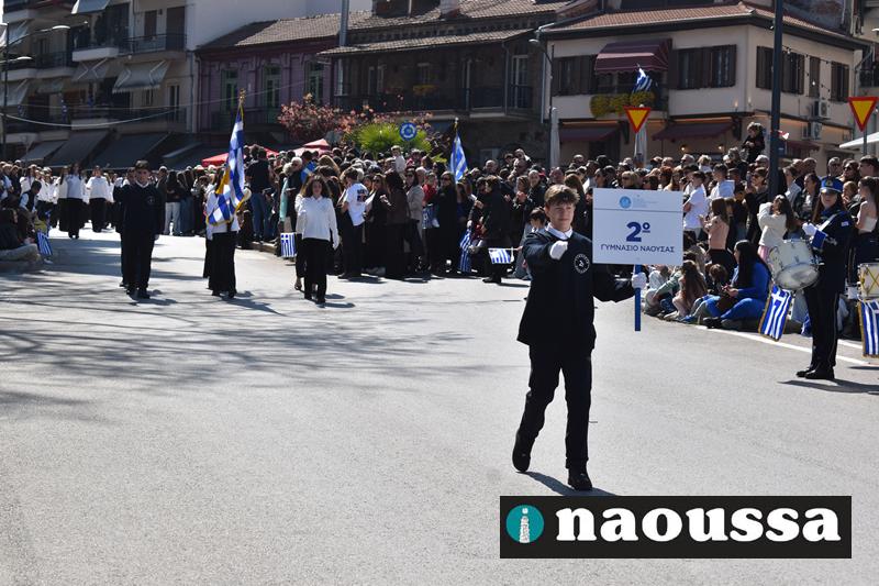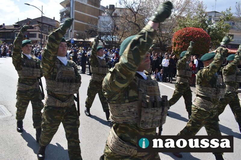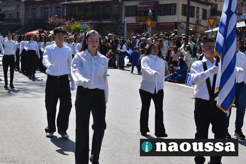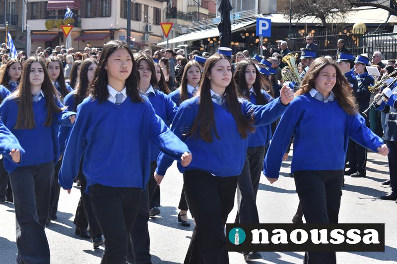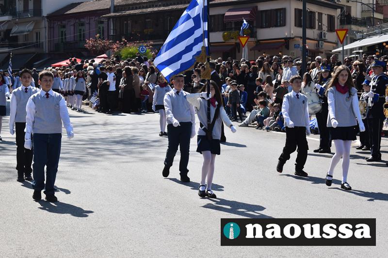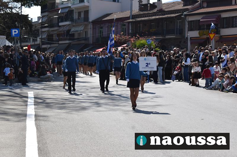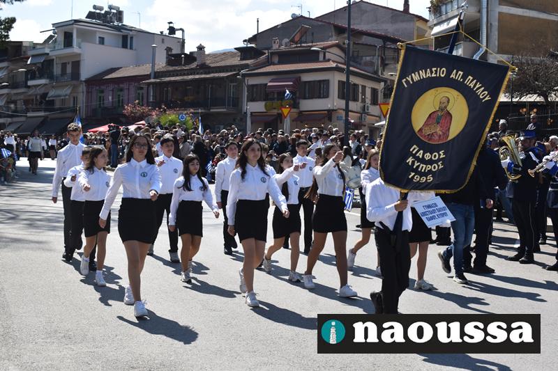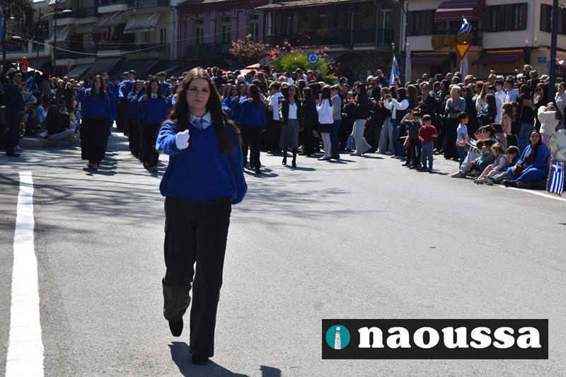Τα μέλη των πολιτιστικών, οι μαθητές των σχολείων, οι σπουδαστές της σχολής Αστυφυλάκων και άνδρες της Β΄Μοίρας Καταδρομών παρήλασαν καταχειροκροτούμενοι από τους κατοίκους της Νάουσας.