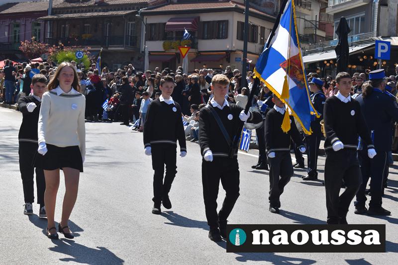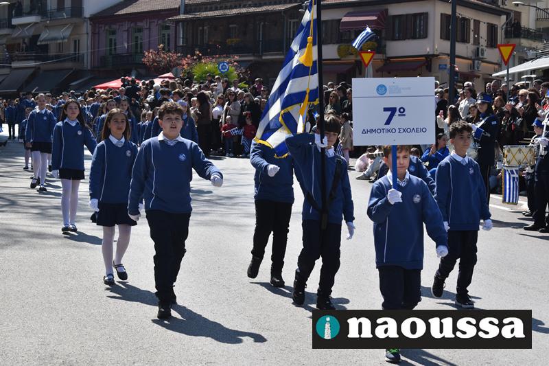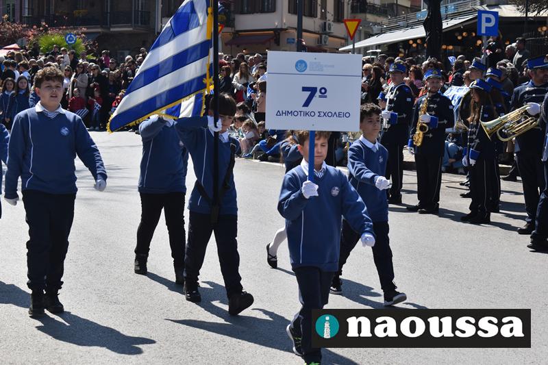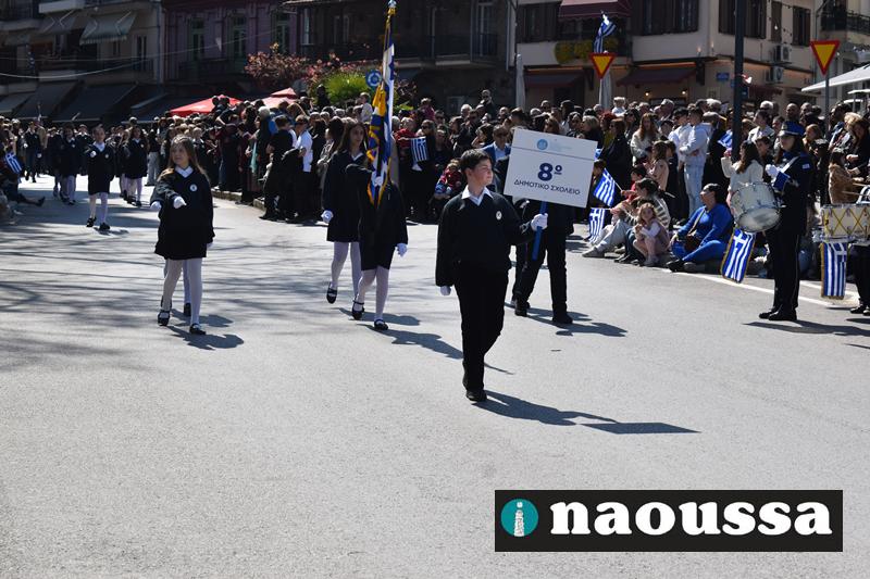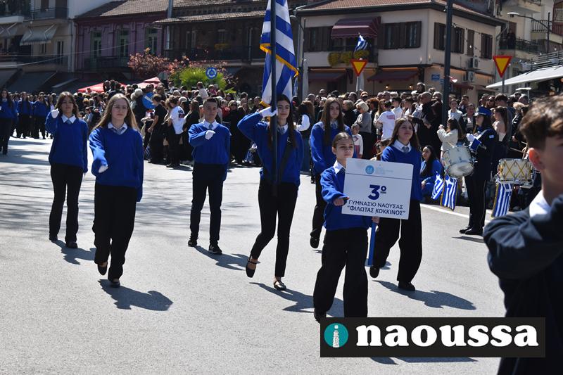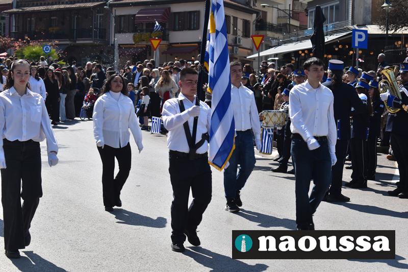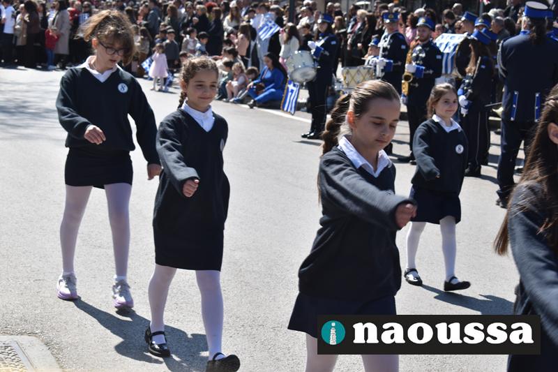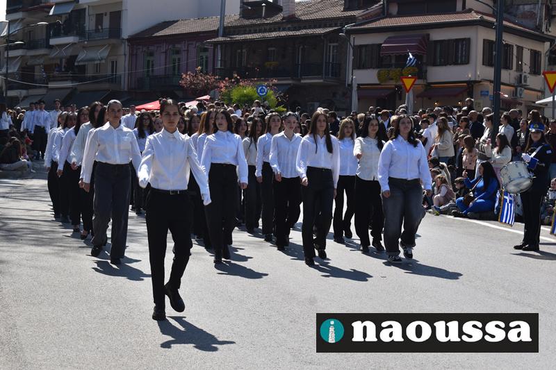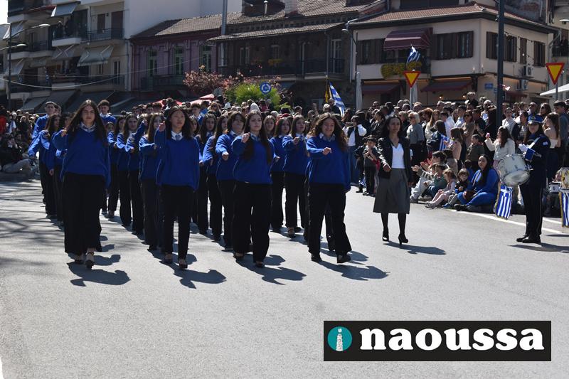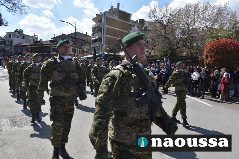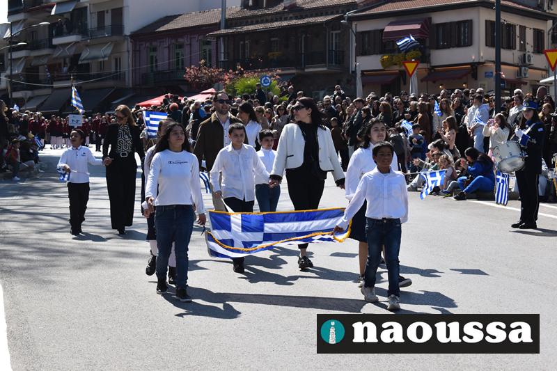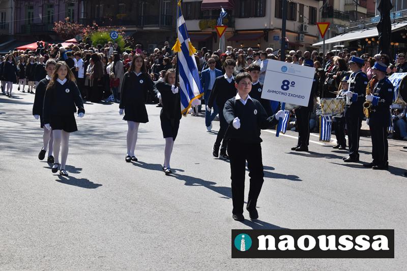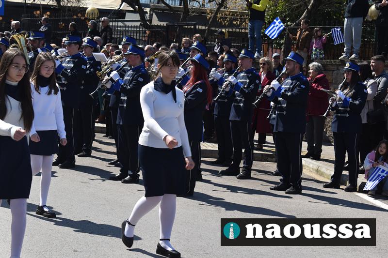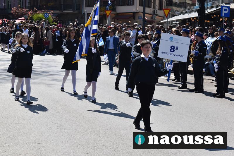 Τα μέλη των πολιτιστικών, οι μαθητές των σχολείων, οι σπουδαστές της σχολής Αστυφυλάκων και άνδρες της Β΄Μοίρας Καταδρομών παρήλασαν καταχειροκροτούμενοι από τους κατοίκους της Νάουσας.