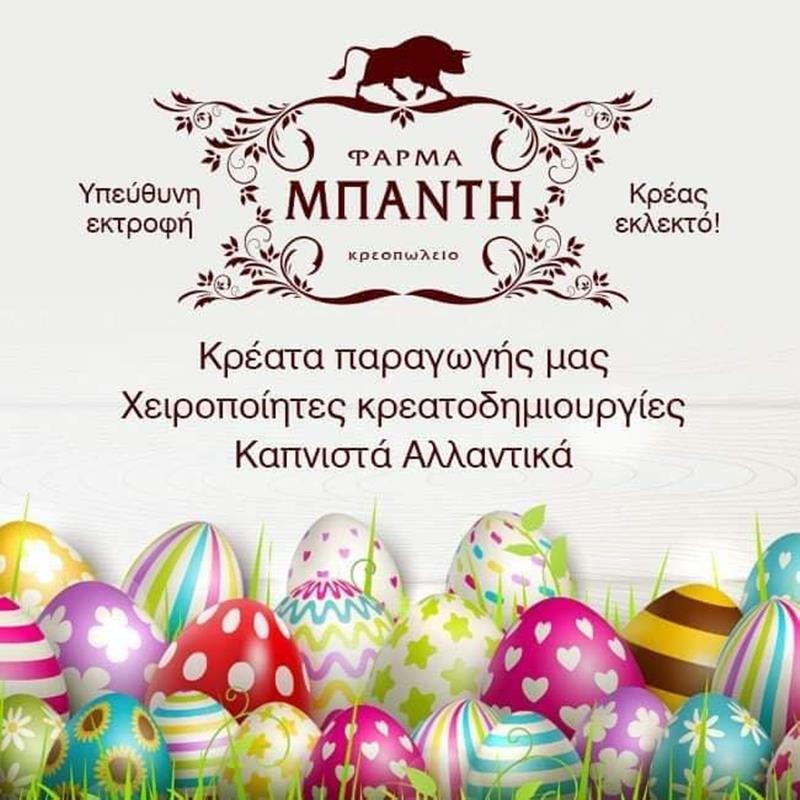 Στο κρεοπωλείο Φάρμα Μπαντή ΚΑΙ φέτος το Πάσχα θα βρείτε ανώτερης ποιότητος ΕΛΛΗΝΙΚΑ κρέατα, για να απολαύσετε το εορταστικό τραπέζι που έρχεται. Ευχαριστήστε εσάς, την οικογένειά σας και τους καλεσμένους σας!