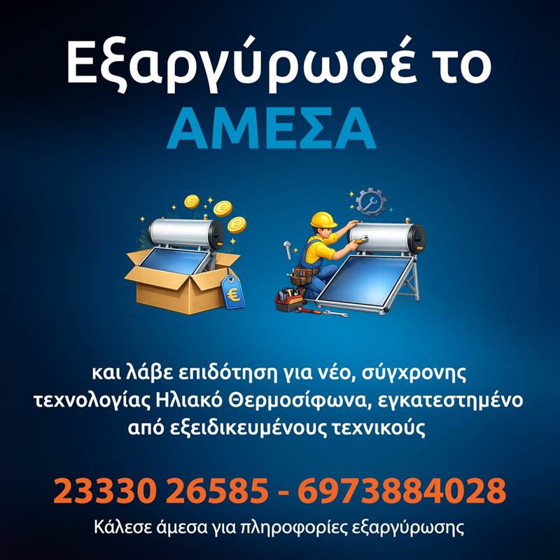 Επικοινώνησε άμεσα στα τηλέφωνα 6973 884028 και 23330 26585 για να εξαργυρώσεις το voucher για το Πρόγραμμα «Αλλάζω σύστημα θέρμανσης και θερμοσίφωνα» και να λάβεις επιδότηση για νέο, σύγχρονης τεχνολογίας Ηλιακό Θερμοσίφωνα, εγκατεστημένο από εξειδικευμένους τεχνικούς!