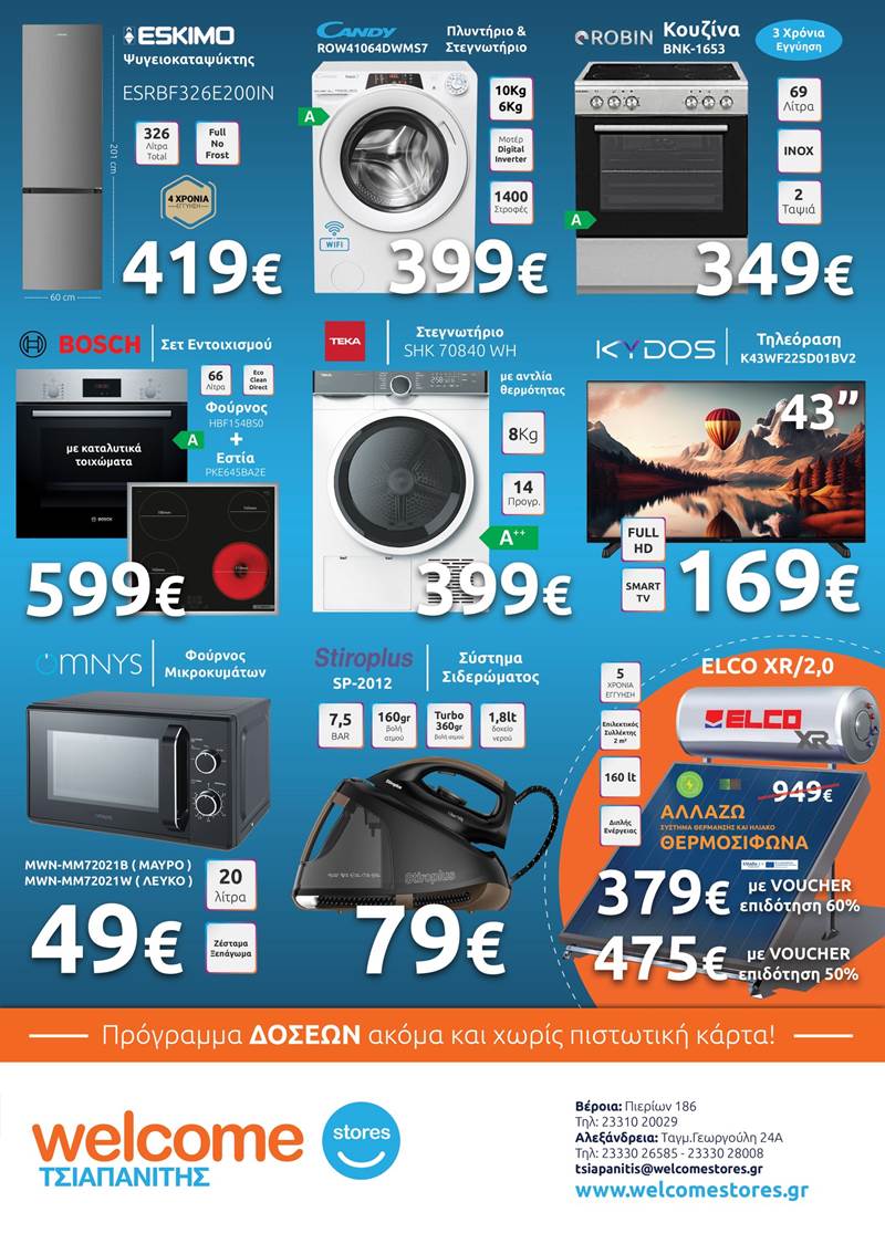 Στα καταστήματα Welcome Stores Τσιαπανίτης σε Αλεξάνδρεια και Βέροια θα βρεις επίσης κορυφαία μοντέλα σε Ηλιακούς Θερμοσίφωνες τους οποίους μπορείς να αγοράσεις μέσω του προγράμματος «Αλλάζω σύστημα θέρμανσης και θερμοσίφωνα» με επιδότηση έως και 60%.