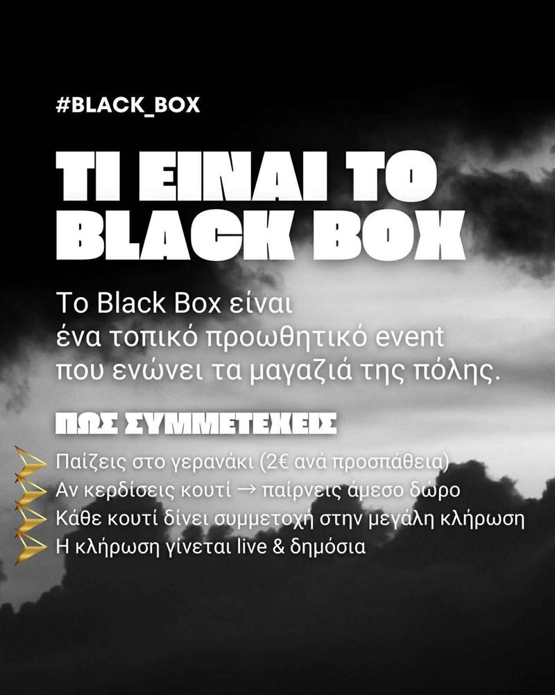 Το Black Box περιλαμβάνει 150 μαύρα κουτιά, τα οποία κρύβουν δώρα από τοπικά καταστήματα της πόλης. Οι συμμετέχοντες μπορούν να δοκιμάσουν την τύχη τους σε ειδικό γερανάκι, με κάθε επιτυχημένη προσπάθεια να προσφέρει άμεσο δώρο, καθώς και συμμετοχή στη μεγάλη κλήρωση.