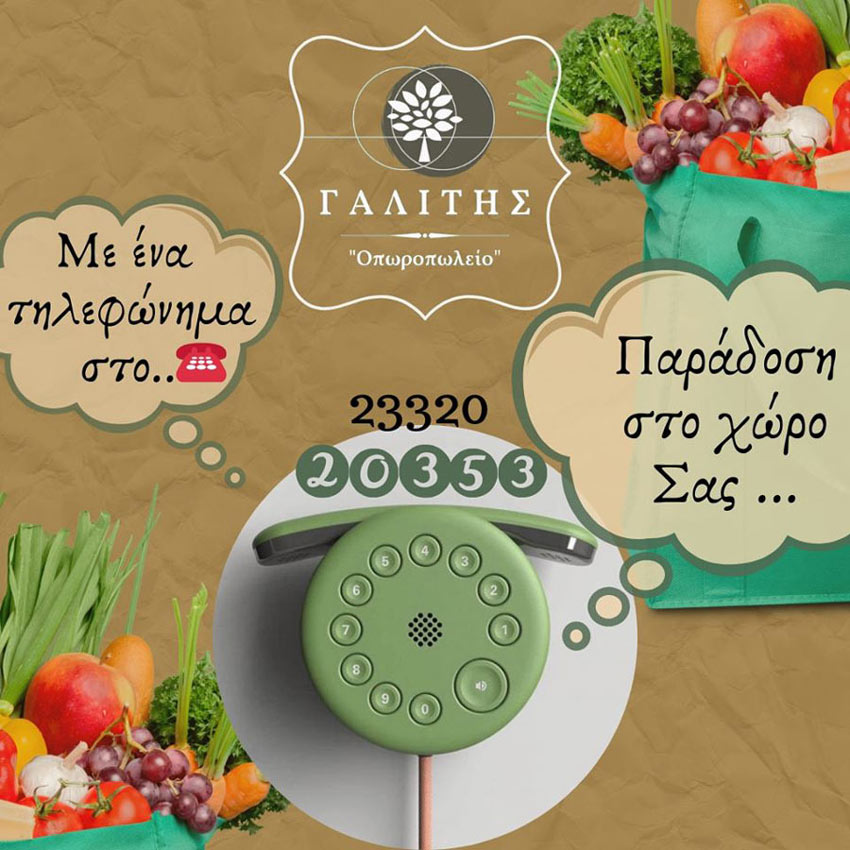 Τηλεφωνώντας μας στο 2332020353 κάνε την παραγγελία σας για τα φρέσκα λαχανικά και τα προϊόντα μαναβικής και άμεσα τα παραλαμβάνετε στην πόρτα σας, πάντα με την υπογραφή άριστης ποιότητας του Oπωροπωλείου «Γαλίτης».