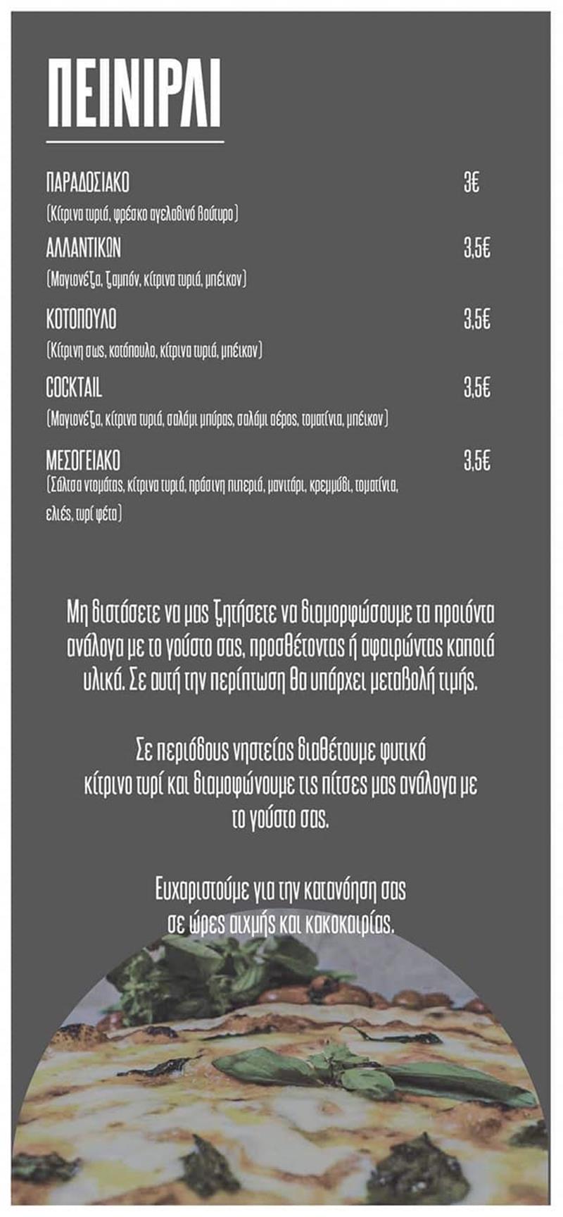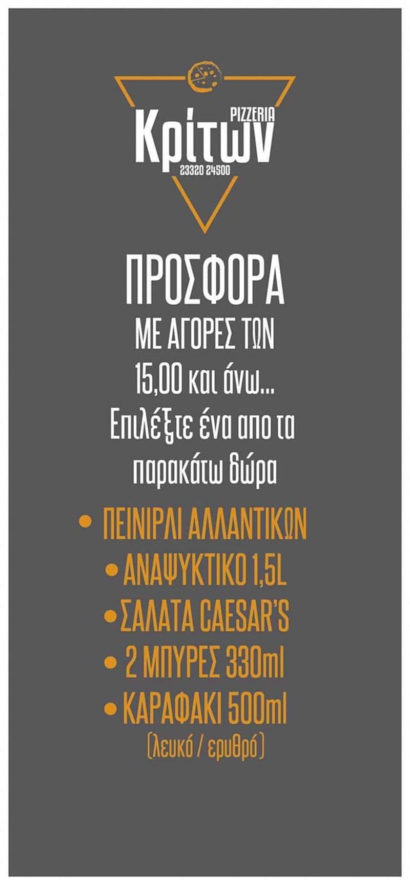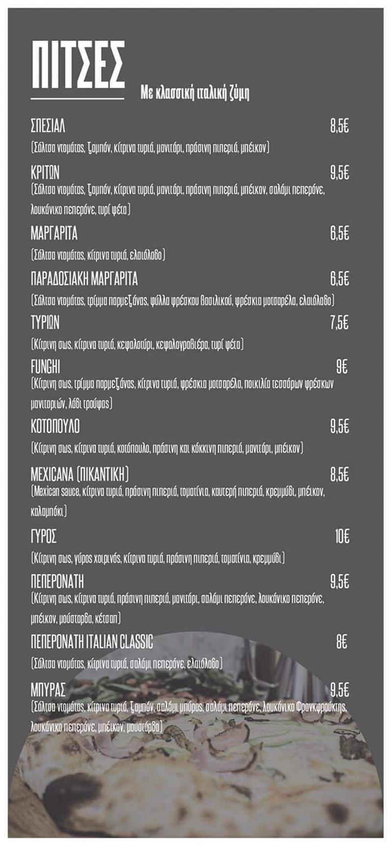 Το menu της «Pizzeria Κρίτων» χαρακτηρίζεται τόσο από τη ευρεία γκάμα επιλογών πίτσας της όσο και από τις προσεχτικά επιλεγμένες πρώτες ύλες.