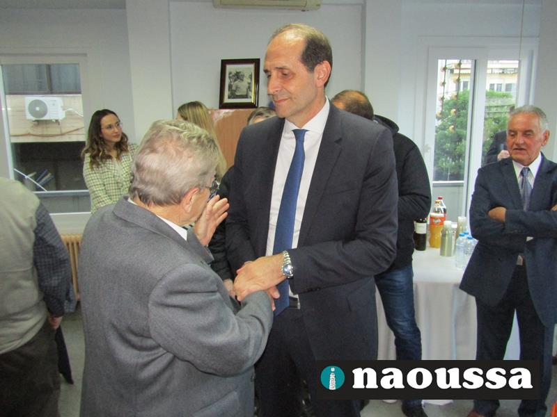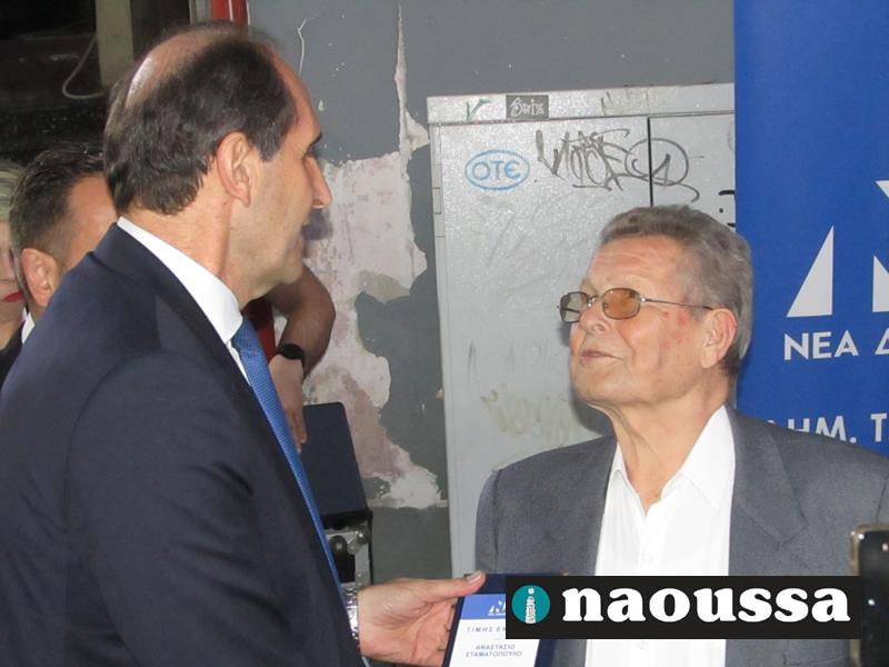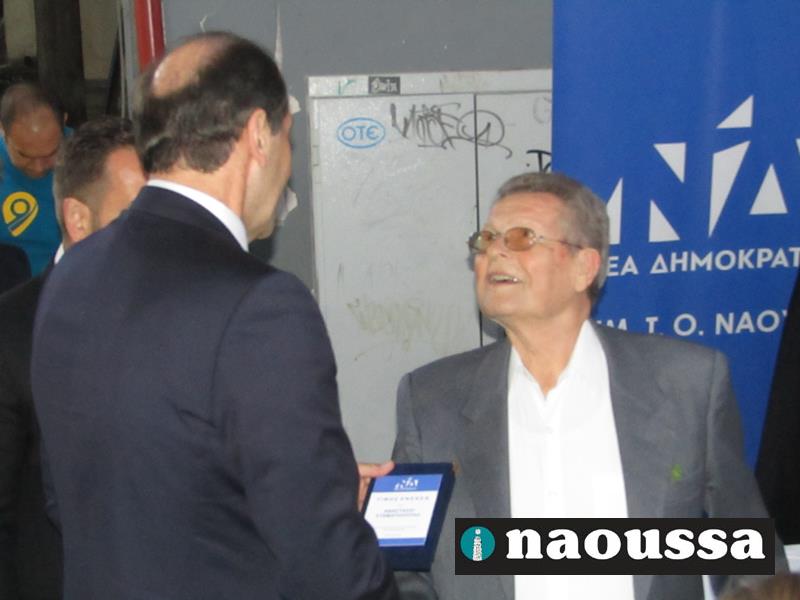 Ο υφυπουργός κ. Βεσυρόπουλος απένειμε, εκ μέρους της ΔΗΜ.Τ.Ο. Νάουσας, τιμητική πλακέτα στον κ. Αναστάσιο Σταματόπουλο, που ήταν ο πρώτος πρόεδρος της τοπικής οργάνωσης.