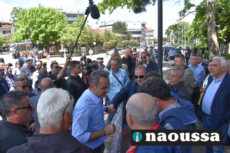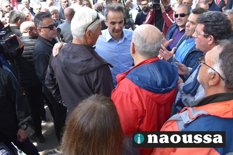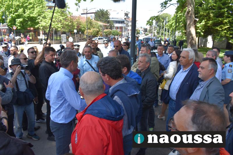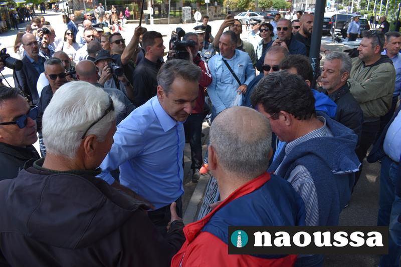 Ζήτησαν, μάλιστα, να μιλήσουν μαζί του για να του εκθέσουν τα προβλήματα και τα αιτήματά τους. Λίγο πριν φύγει από τη Νάουσα ο κ. Μητσοτάκης πλησίασε τους εργαζόμενους και συνομίλησε μαζί τους. Στον διάλογο που είχε με τους κυρίους Σάκη Τσίτση και Παναγιώτη Κουτσουπιά, ανέφερε πως γνωρίζει το πρόβλημα και τα αιτήματά τους και πως σύντομα θα υπάρξει επικοινωνία μαζί τους από το γραφείο του.