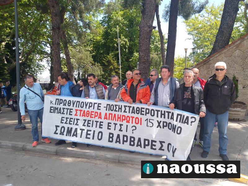 Με πανό και συνθήματα υποδέχθηκαν τον πρωθυπουργό κ. Κυριάκο Μητσοτάκη οι εργαζόμενοι της βιομηχανίας «Βαρβαρέσος», που παρέμειναν στην είσοδο του δημοτικού πάρκου καθ’ όλη την διάρκεια της επίσκεψής του στη Νάουσα.