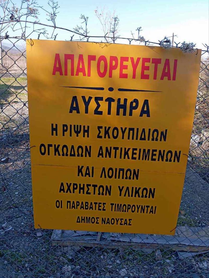 Ο Δήμος Ηρωικής Πόλεως Νάουσας επισημαίνει πως απαγορεύεται αυστηρά η ρίψη σκουπιδιών, ογκωδών απορριμμάτων και μπαζών στην περιοχή, όπως και το πλύσιμο ιδιωτικών αυτοκινήτων και φορτηγών. Οι παραβάτες θα τιμωρούνται με πρόστιμο.