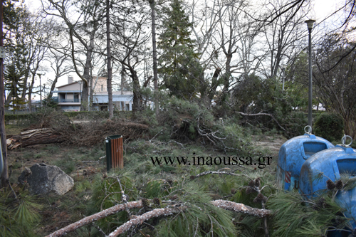 Τρομακτική είναι η εικόνα στην είσοδο του δημοτικού πάρκου Νάουσας από τα πεσμένα δέντρα και τα κλαδιά που έφυγαν λόγω των δυνατών ανέμων.