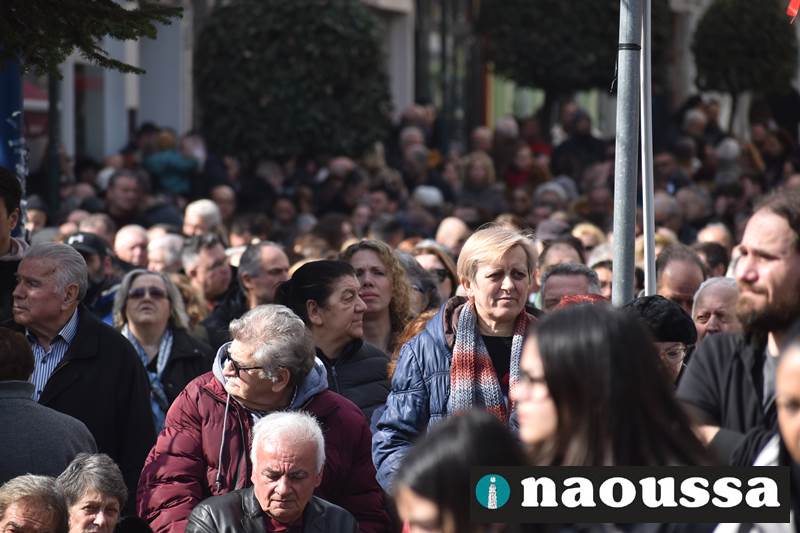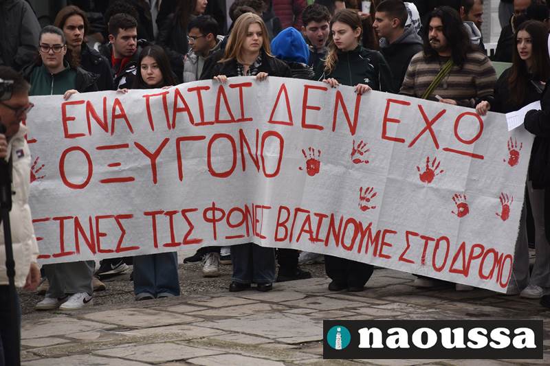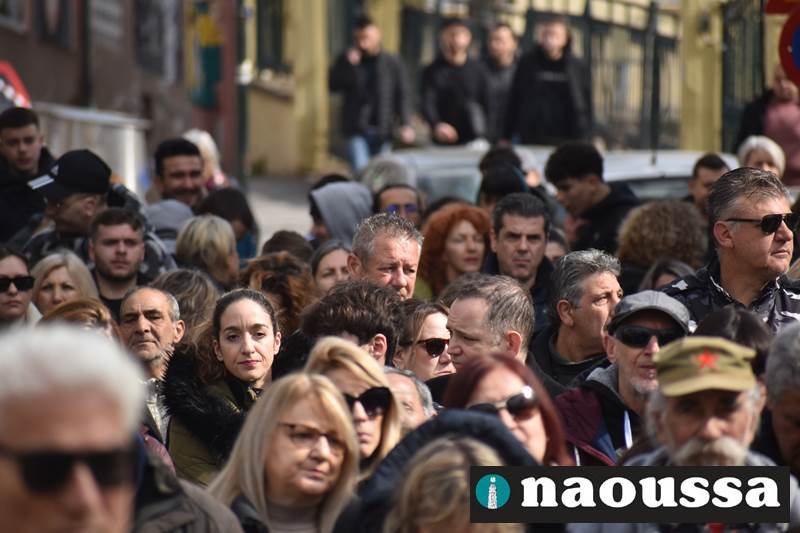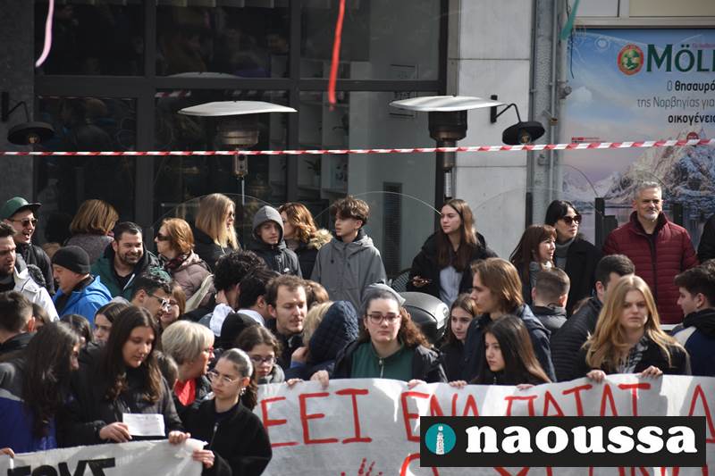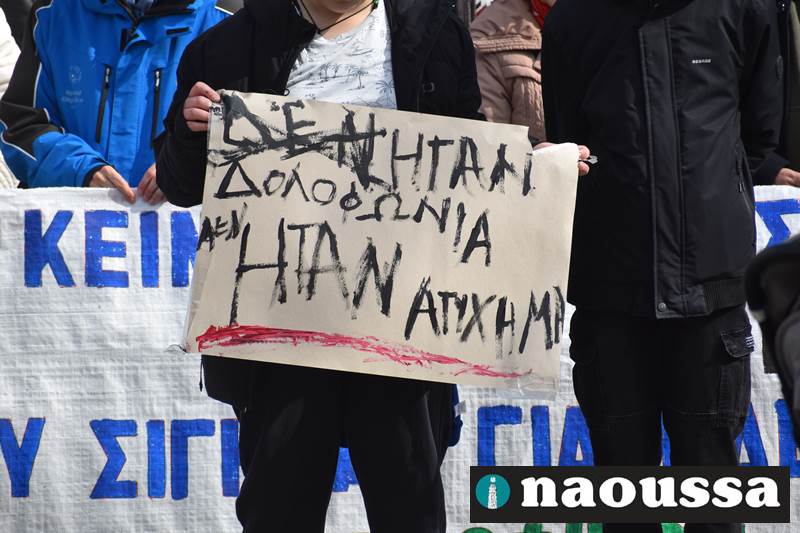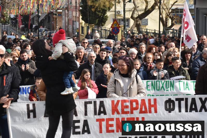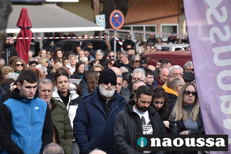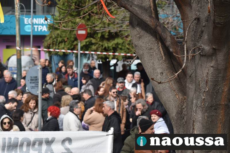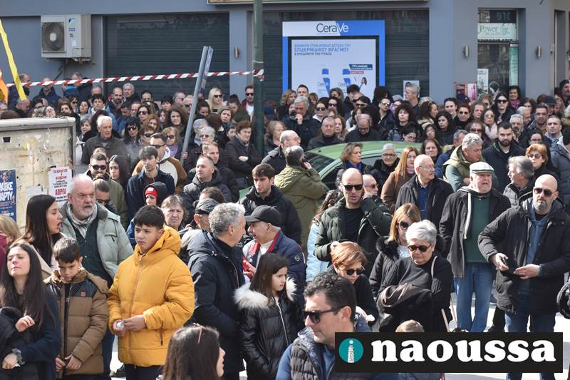 Χιλιάδες κάτοικοι του δήμου Νάουσας διαδήλωσαν το πρωί της Παρασκευής ζητώντας δικαιοσύνη για το έγκλημα των Τεμπών.