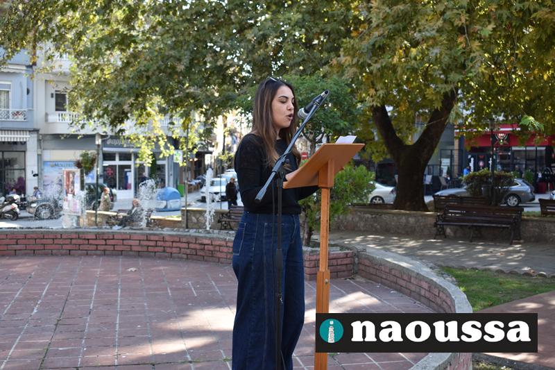 Χαιρετισμό απηύθυνε η Ελισάνθη Κωστοπούλου, μέλος της προσωρινής διοίκησης του Σωματείου Επισιτισμού Τουρισμού Ημαθίας, ενώ την κεντρική ομιλία έκανε η Μαριάννα Παπαδοπούλου, πρόεδρος του Σωματείου Ιδιωτικών Υπαλλήλων Ημαθίας Πέλλας.