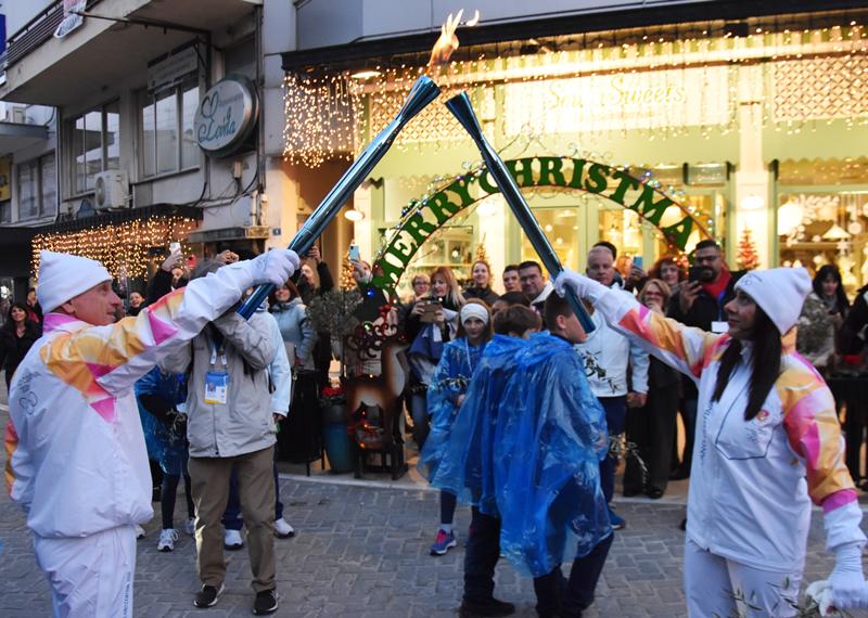 Η άφιξη της Ολυμπιακής Φλόγας στην Πλατεία Καρατάσου κορυφώθηκε με την τελετουργική αφή στον βωμό από τη Ναουσαία Πρωταθλήτρια Χιονοδρομίας – Olympian, Σοφία Ράλλη.