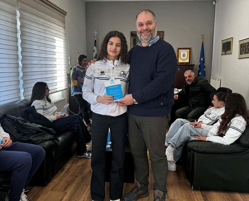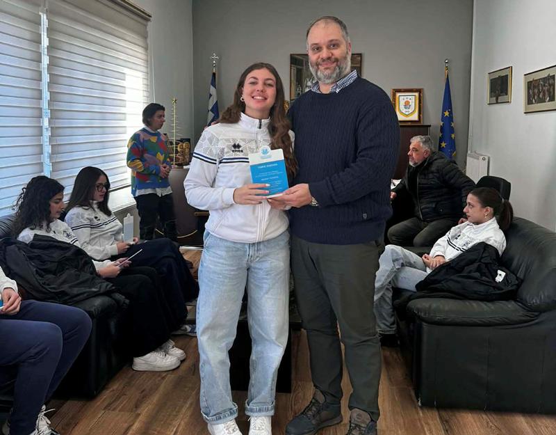 Ο Δήμαρχος συνεχάρη προσωπικά τους αθλητές για τις σημαντικές διακρίσεις τους και απένειμε αναμνηστικά βραβεία στην Αθηνά Τούμπα για την κατάκτηση της τρίτης θέσης στο Πανελλήνιο Πρωτάθλημα ανοιχτής θάλασσας, στην Κατερίνα Τύμη για την κατάκτηση τριών χρυσών μεταλλίων στους Πανελλήνιους αγώνες κολύμβησης, στον Κωνσταντίνο Σιπητάνο για την κατάκτηση της δεύτερης θέσης στους σχολικούς αγώνες κολύμβησης, στη Χριστίνα Μαυρίδου για την κατάκτηση της δεύτερης θέσης στους σχολικούς αγώνες κολύμβησης και στη Θωμαή Τζιώνα για την κατάκτηση της πρώτης θέσης στο Πανελλήνιο Πρωτάθλημα Διάθλου.