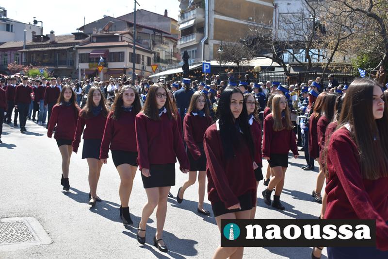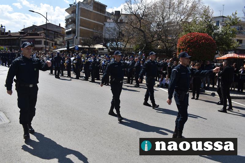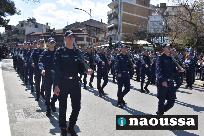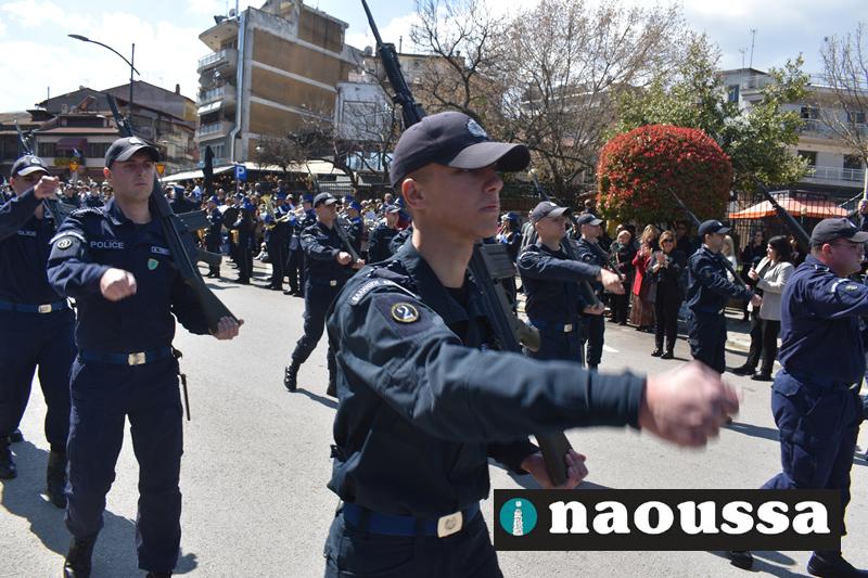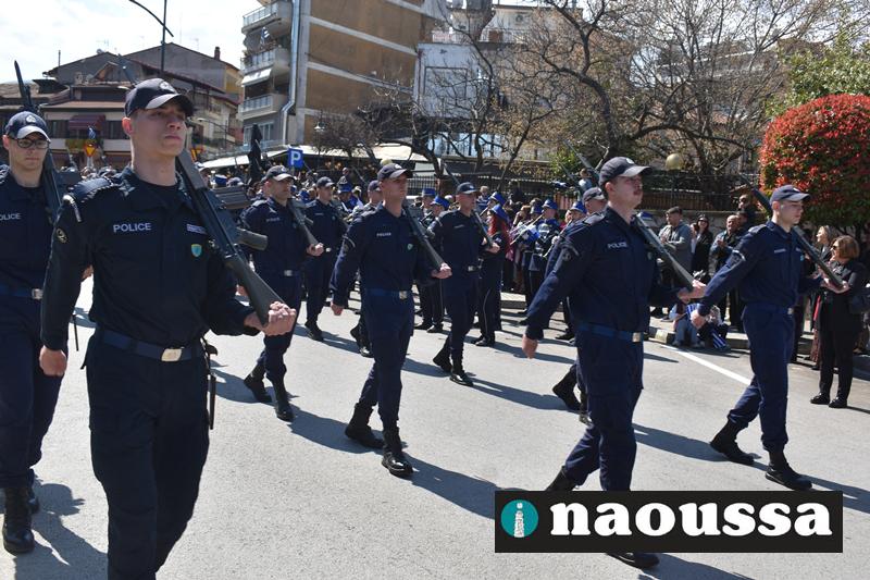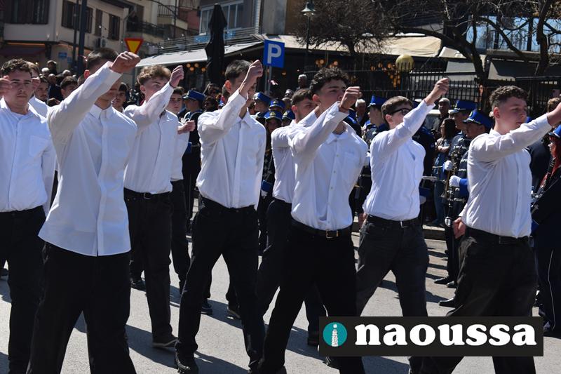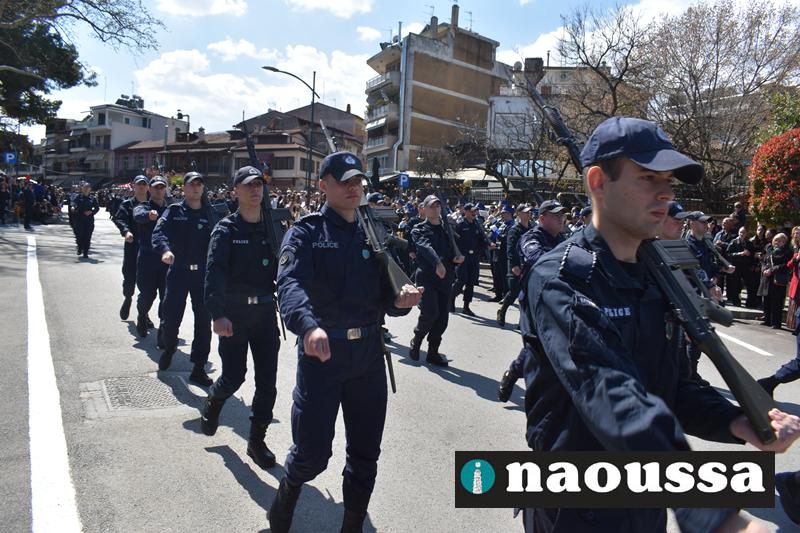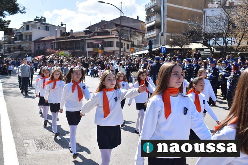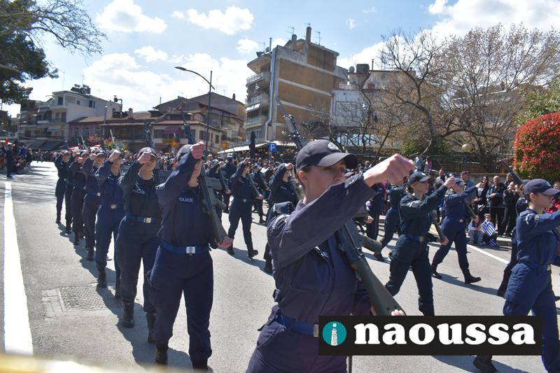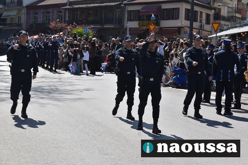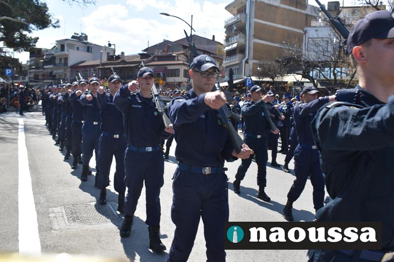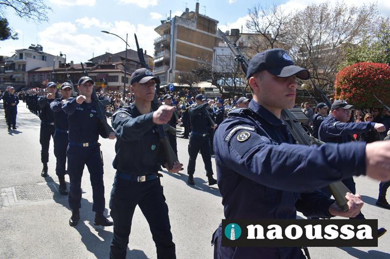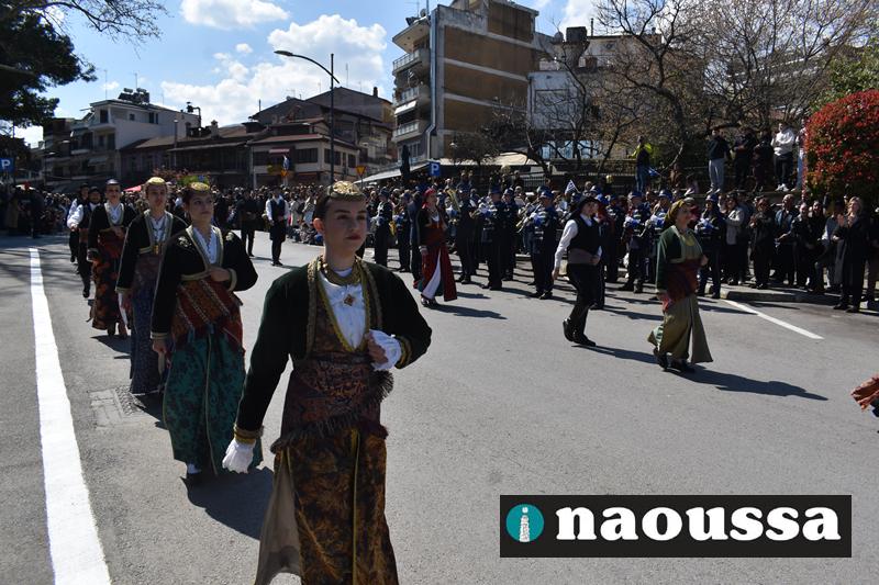 Τα μέλη των πολιτιστικών, οι μαθητές των σχολείων, οι σπουδαστές της σχολής Αστυφυλάκων και άνδρες της Β΄Μοίρας Καταδρομών παρήλασαν καταχειροκροτούμενοι από τους κατοίκους της Νάουσας.