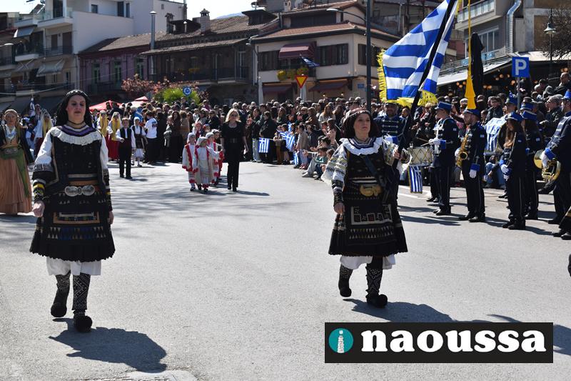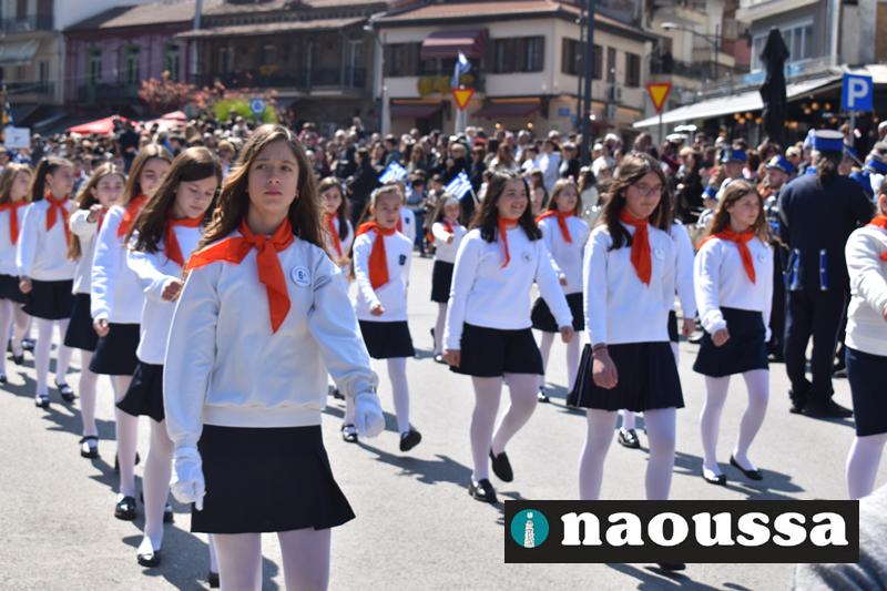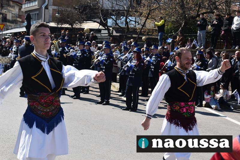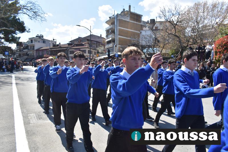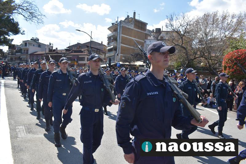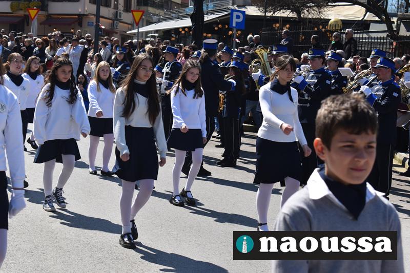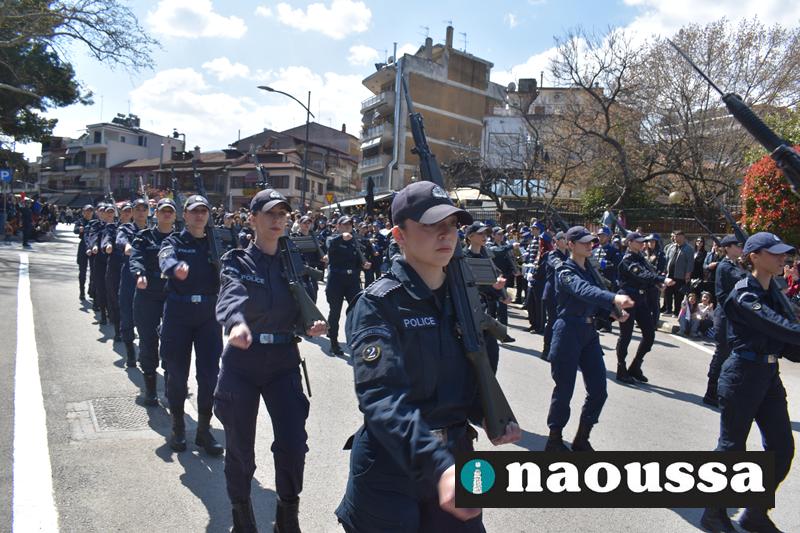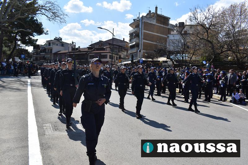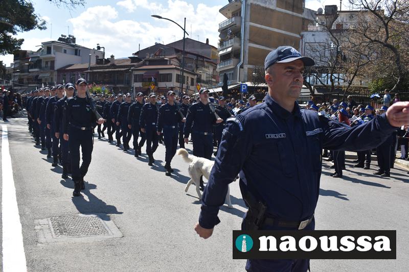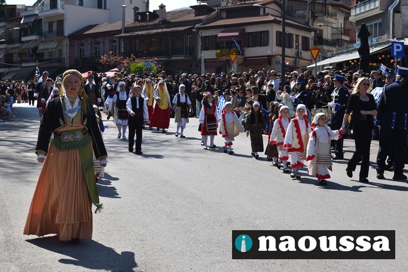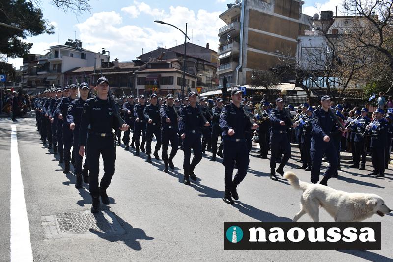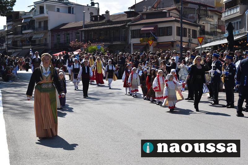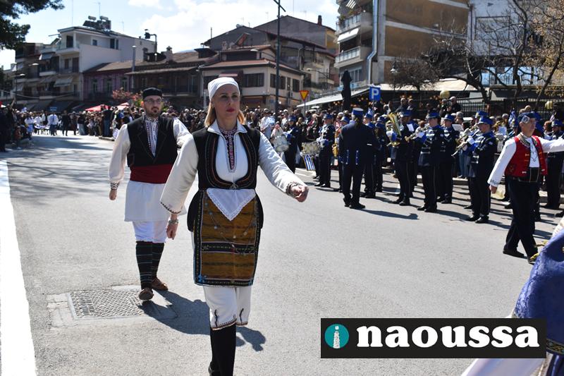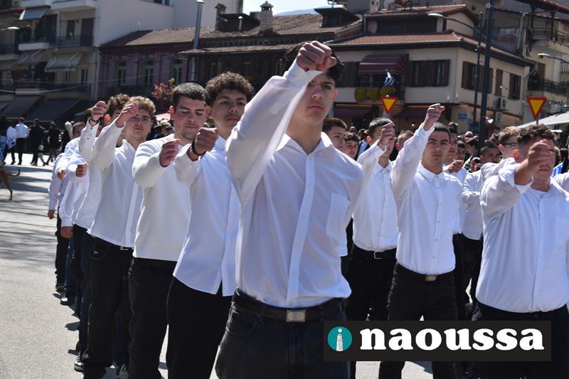 Τα μέλη των πολιτιστικών, οι μαθητές των σχολείων, οι σπουδαστές της σχολής Αστυφυλάκων και άνδρες της Β΄Μοίρας Καταδρομών παρήλασαν καταχειροκροτούμενοι από τους κατοίκους της Νάουσας.