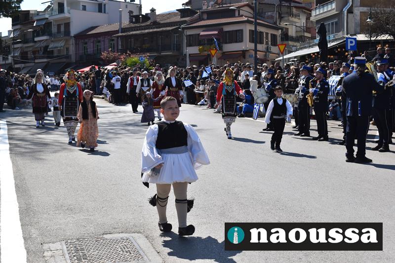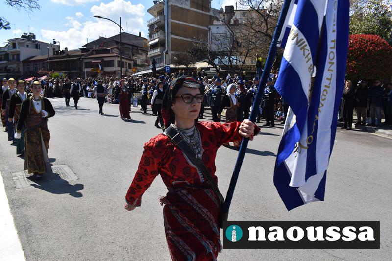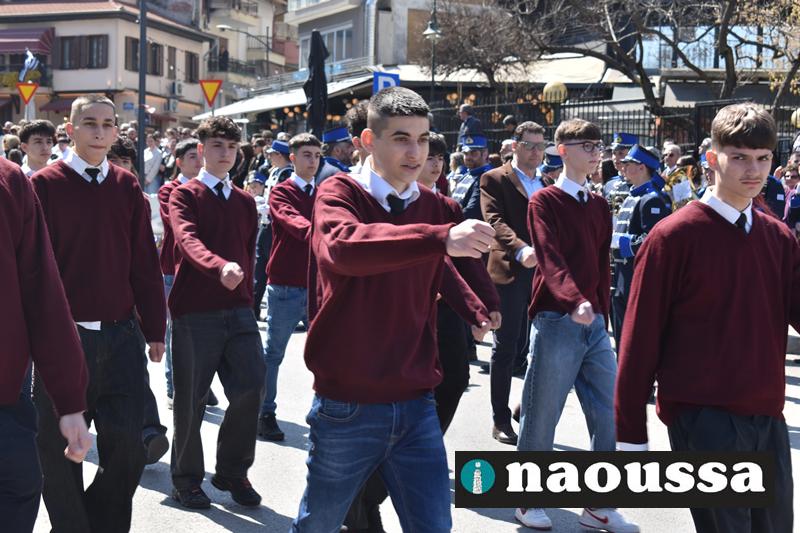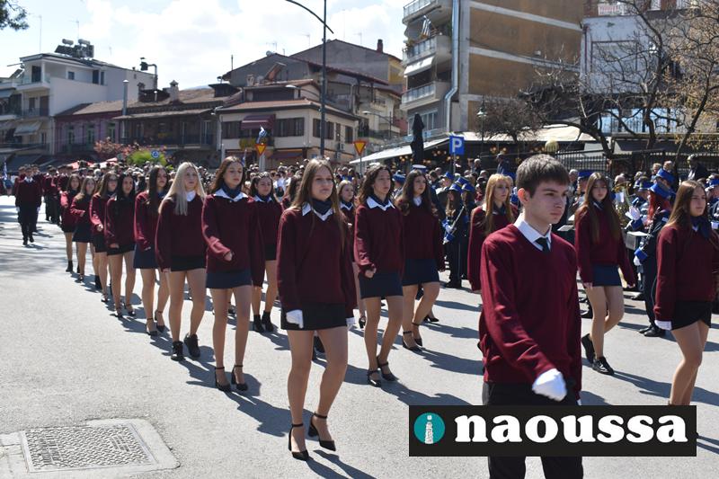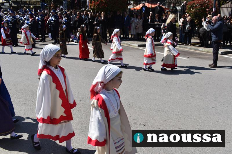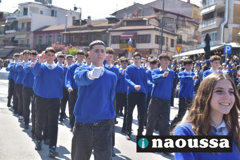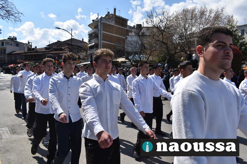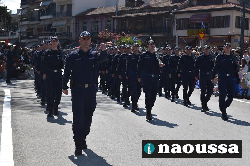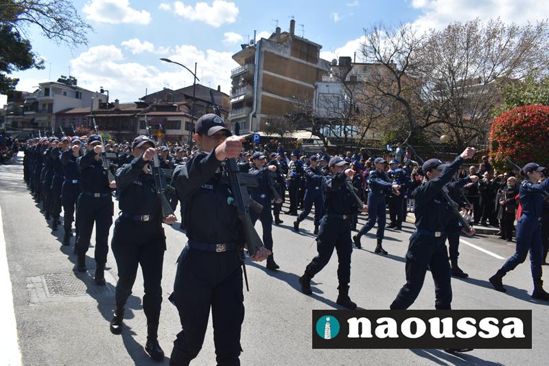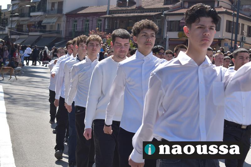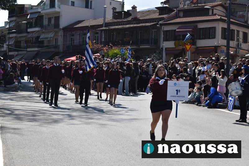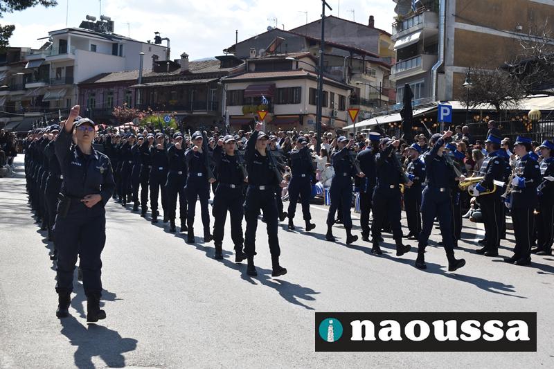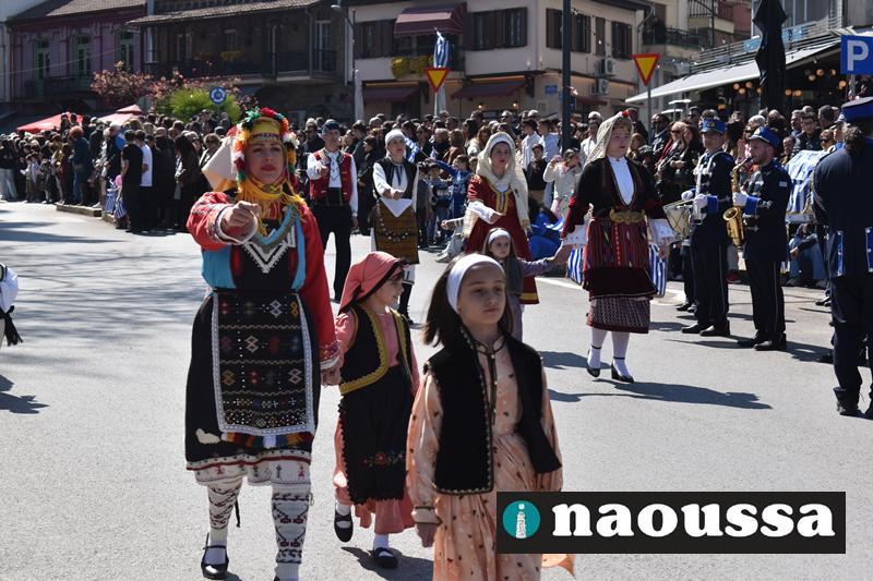 Τα μέλη των πολιτιστικών, οι μαθητές των σχολείων, οι σπουδαστές της σχολής Αστυφυλάκων και άνδρες της Β΄Μοίρας Καταδρομών παρήλασαν καταχειροκροτούμενοι από τους κατοίκους της Νάουσας.