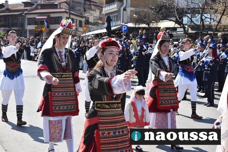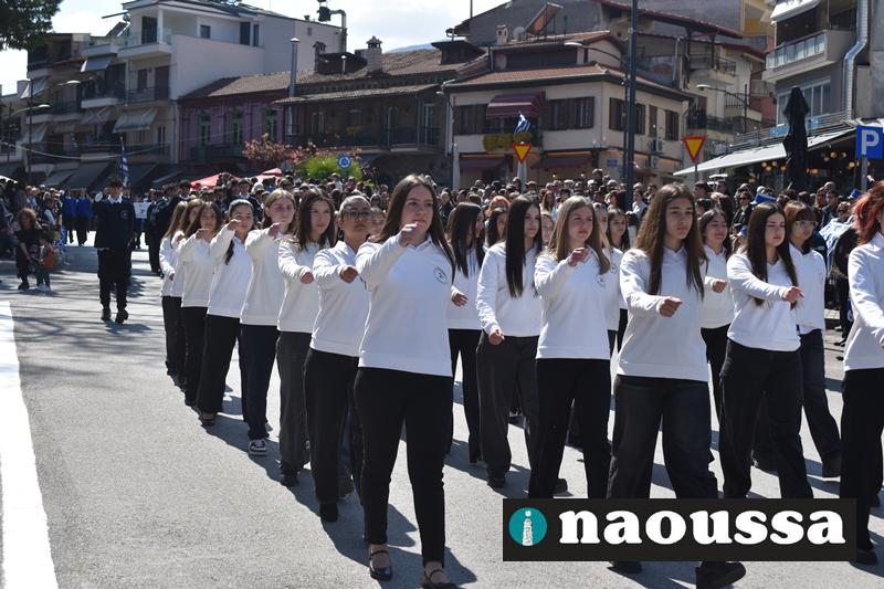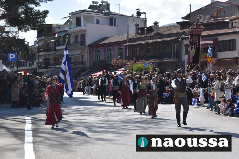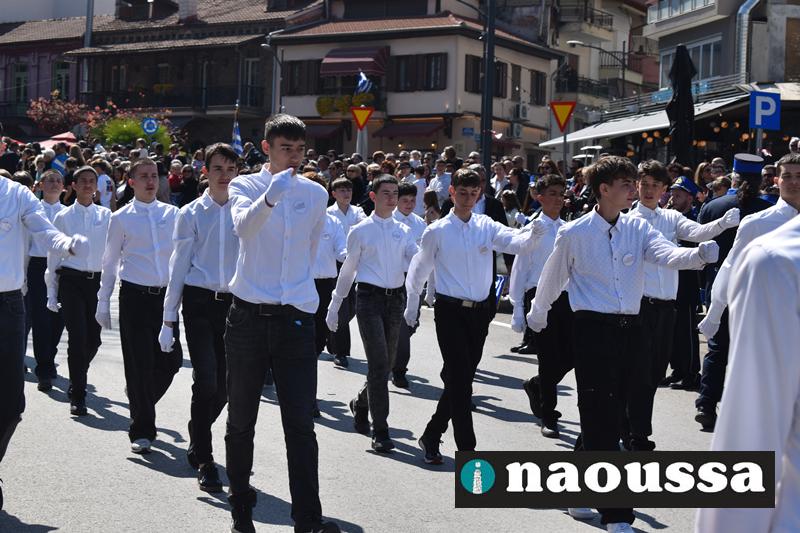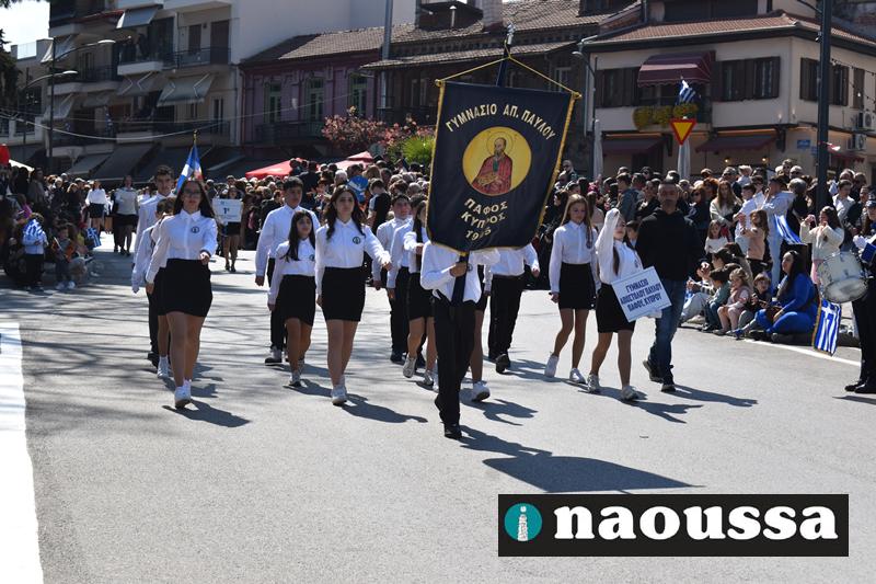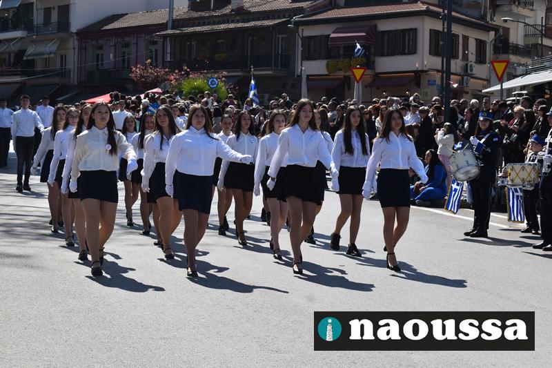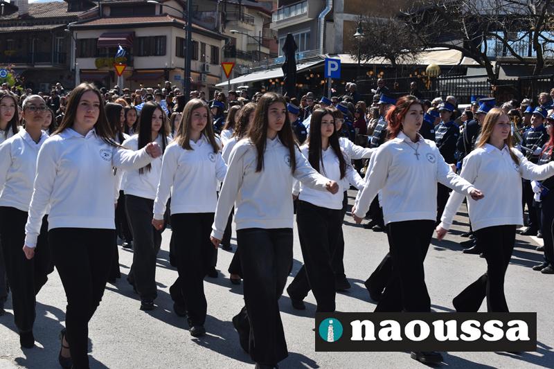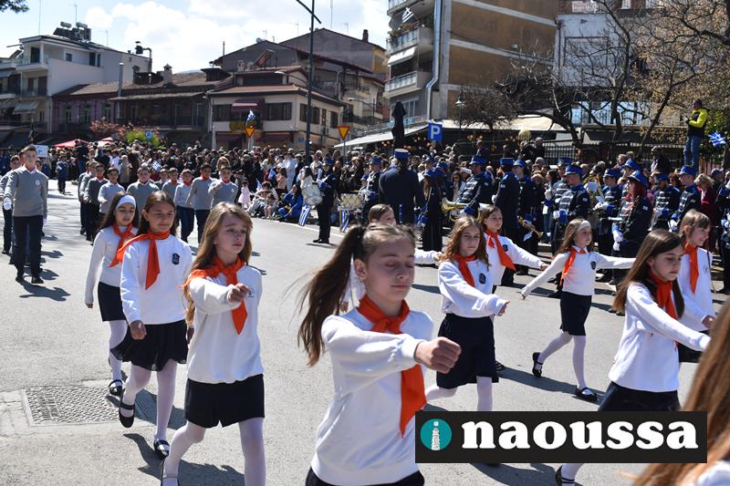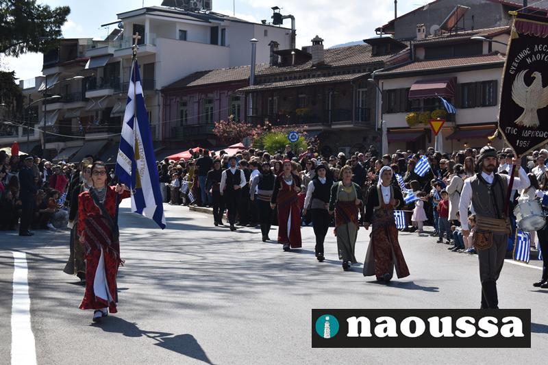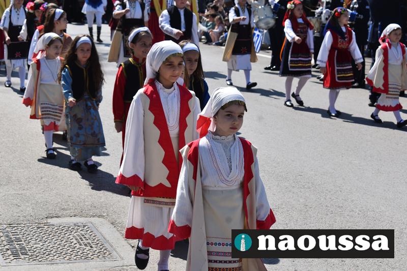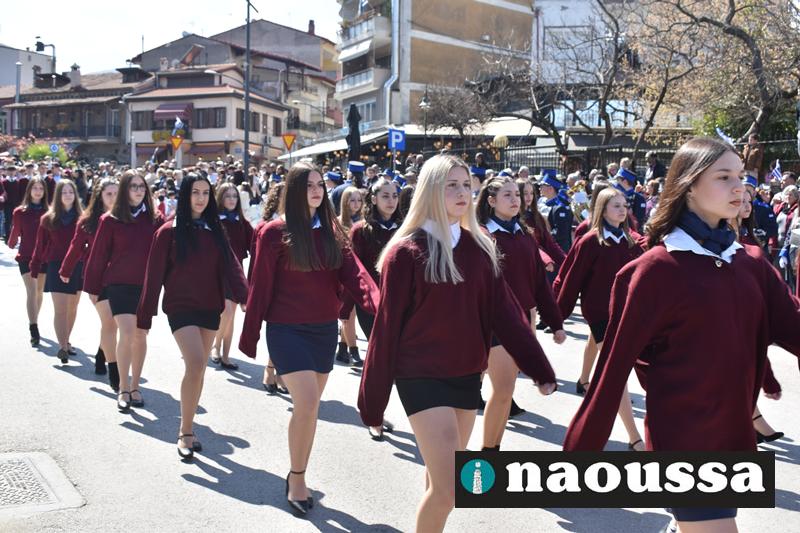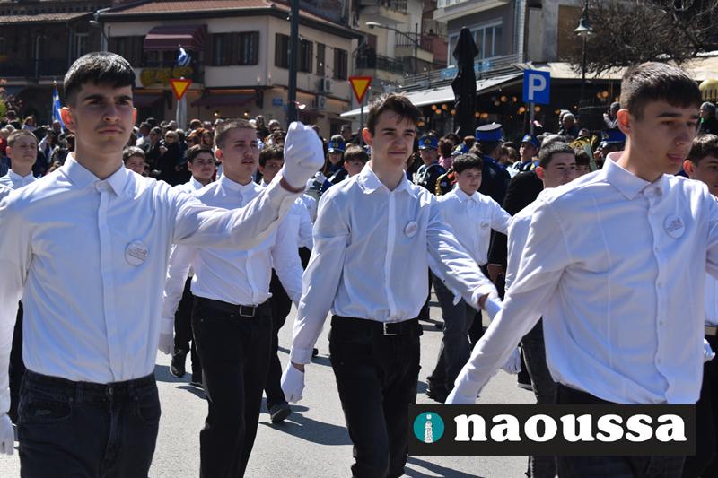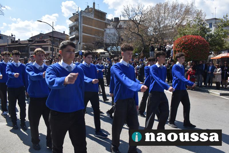 Τα μέλη των πολιτιστικών, οι μαθητές των σχολείων, οι σπουδαστές της σχολής Αστυφυλάκων και άνδρες της Β΄Μοίρας Καταδρομών παρήλασαν καταχειροκροτούμενοι από τους κατοίκους της Νάουσας.