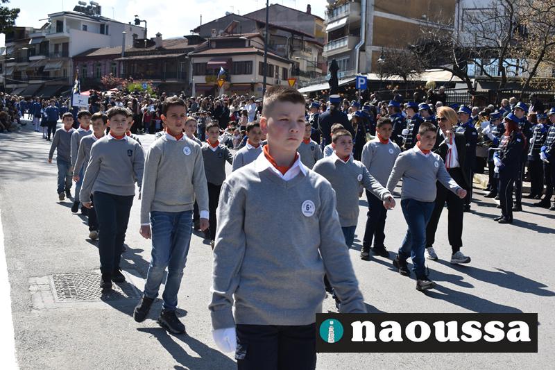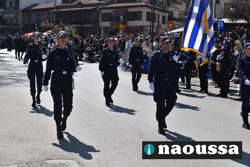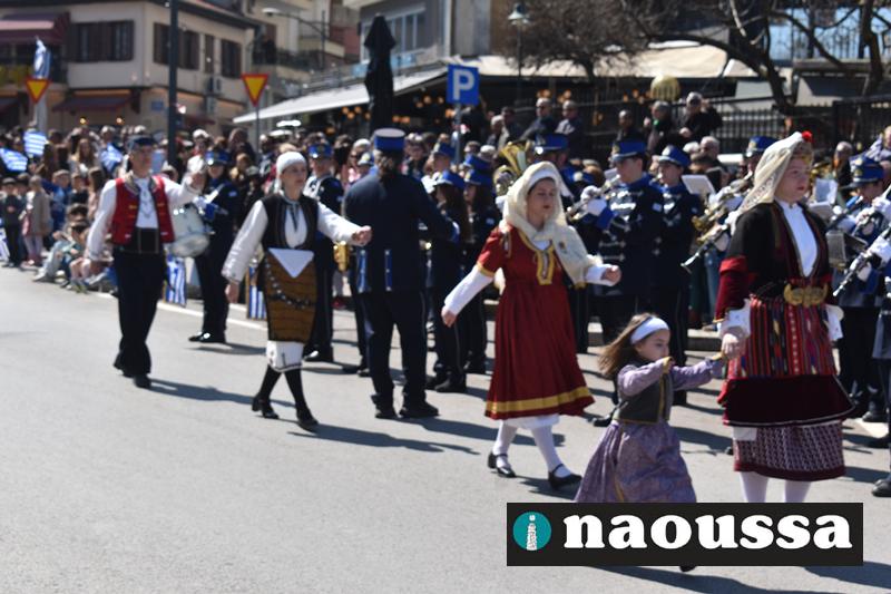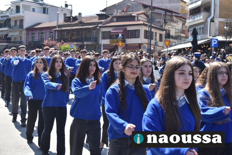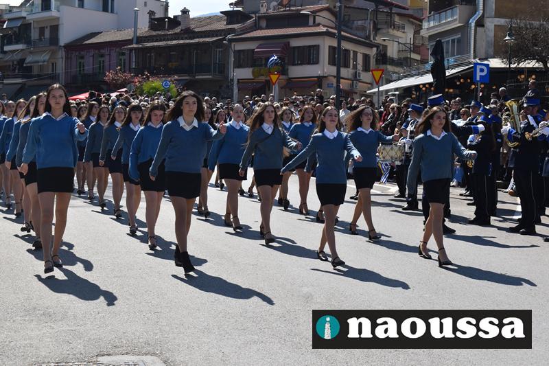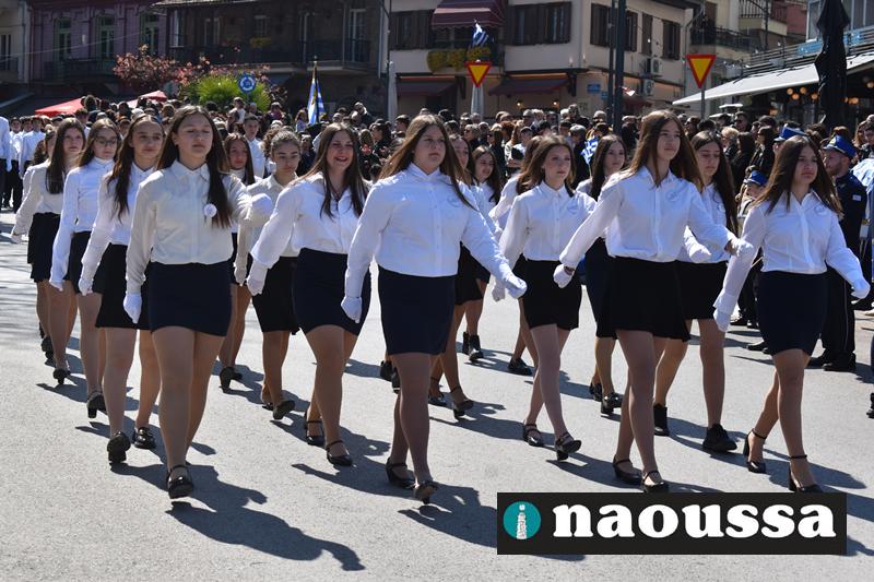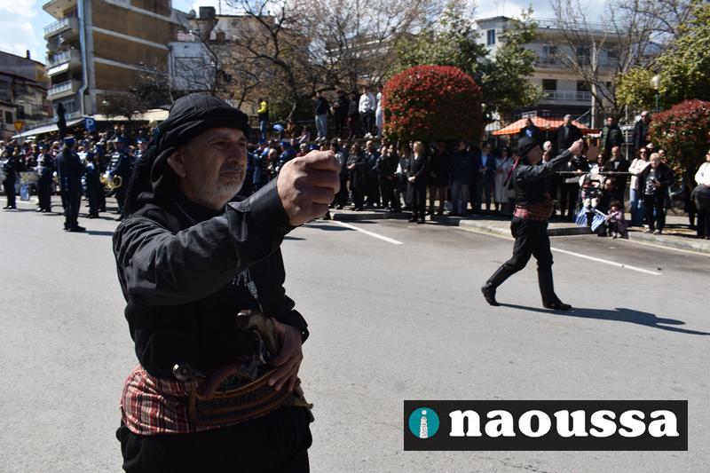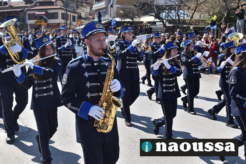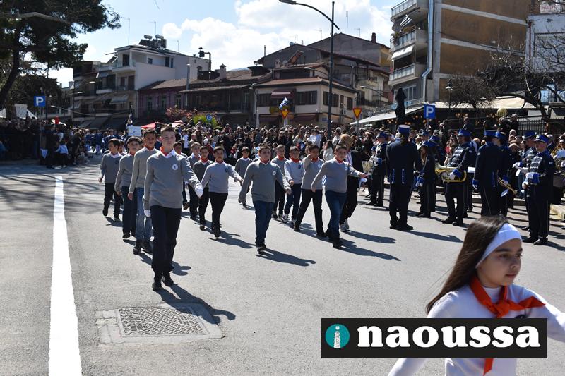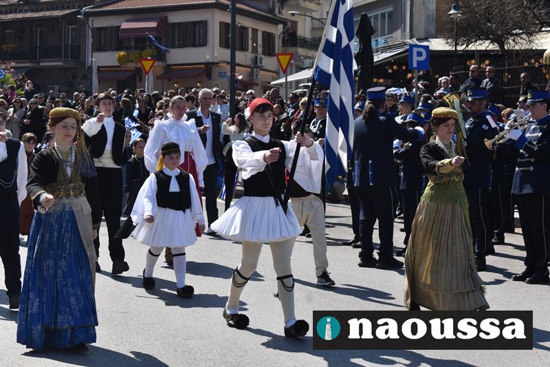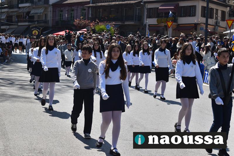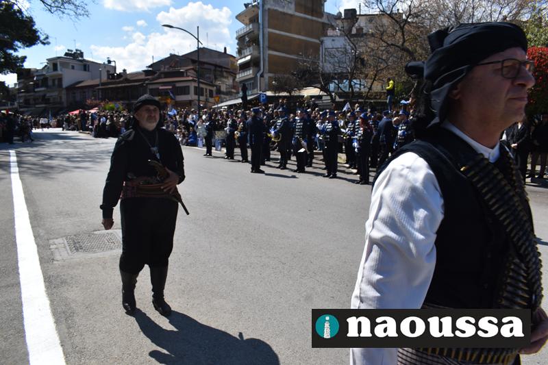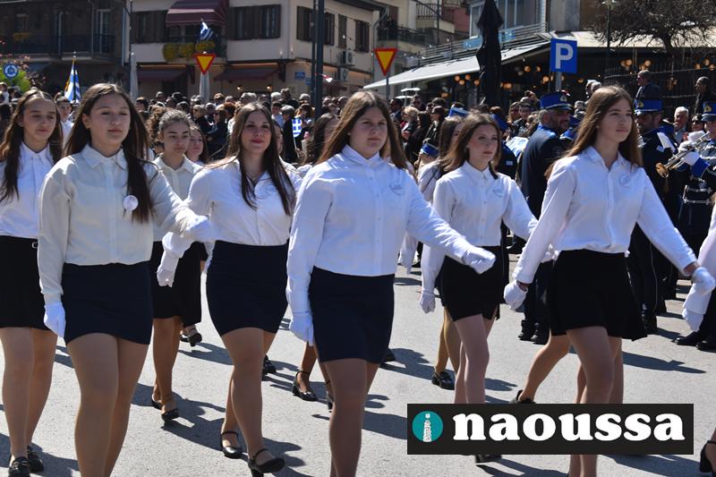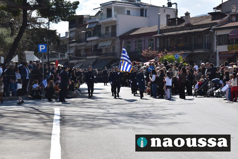 Τα μέλη των πολιτιστικών, οι μαθητές των σχολείων, οι σπουδαστές της σχολής Αστυφυλάκων και άνδρες της Β΄Μοίρας Καταδρομών παρήλασαν καταχειροκροτούμενοι από τους κατοίκους της Νάουσας.