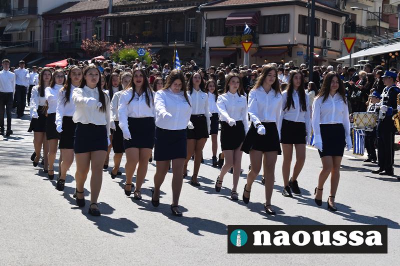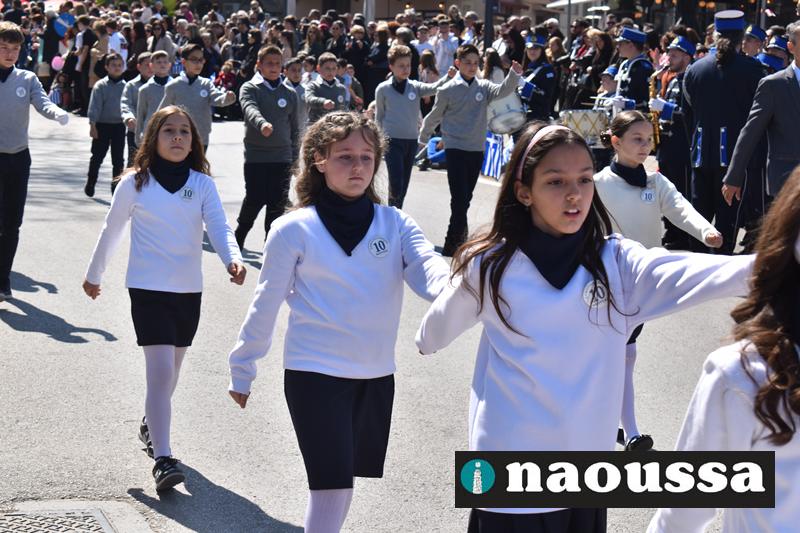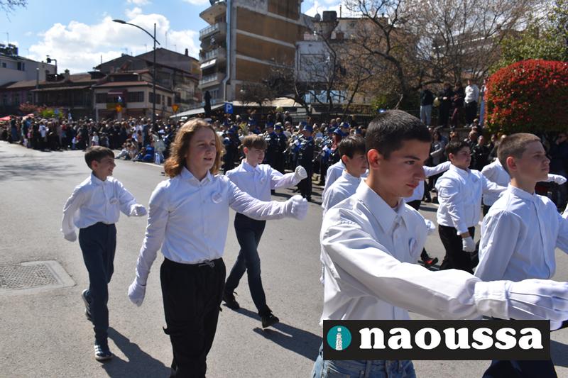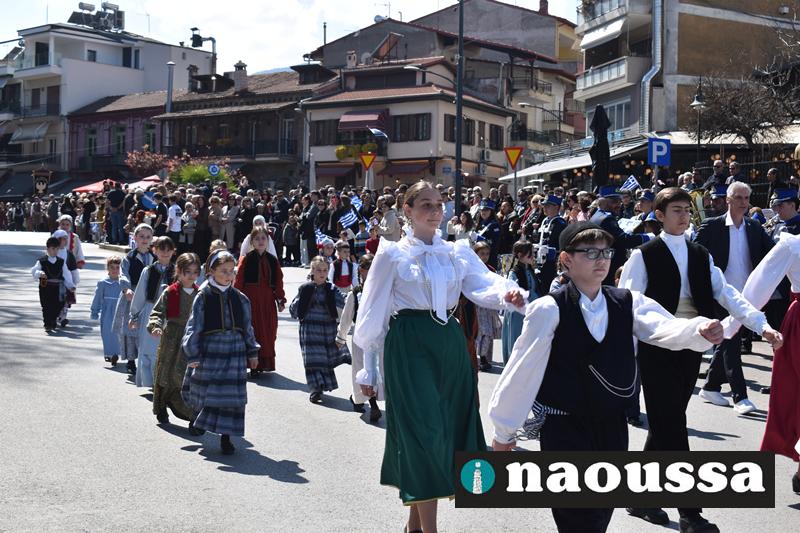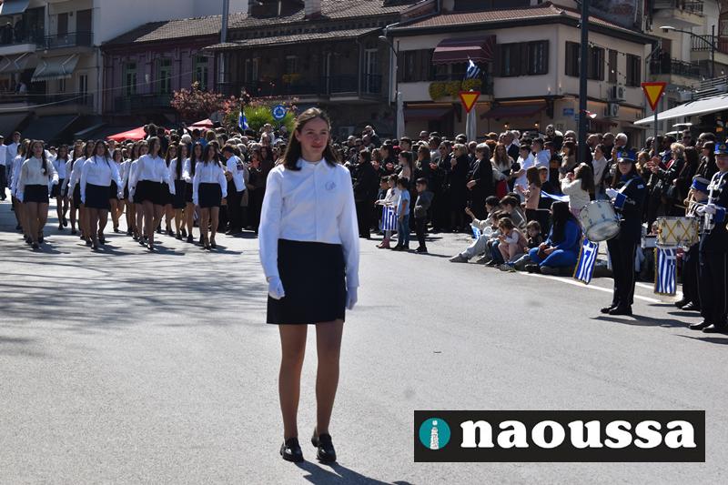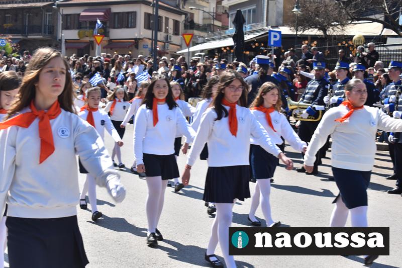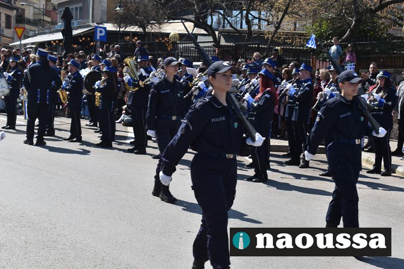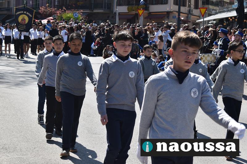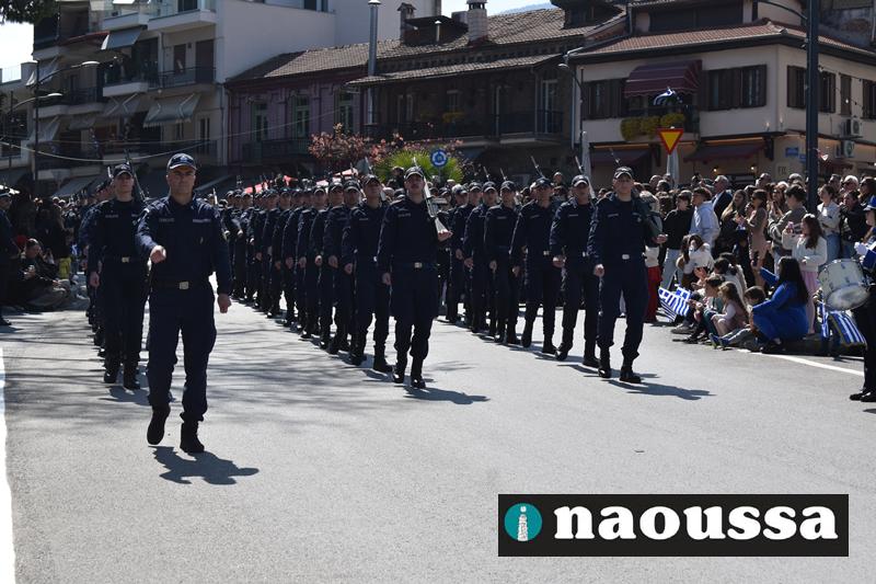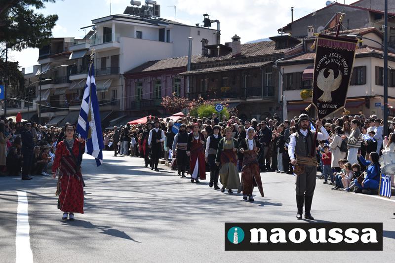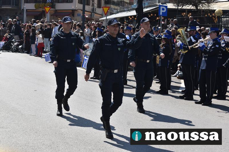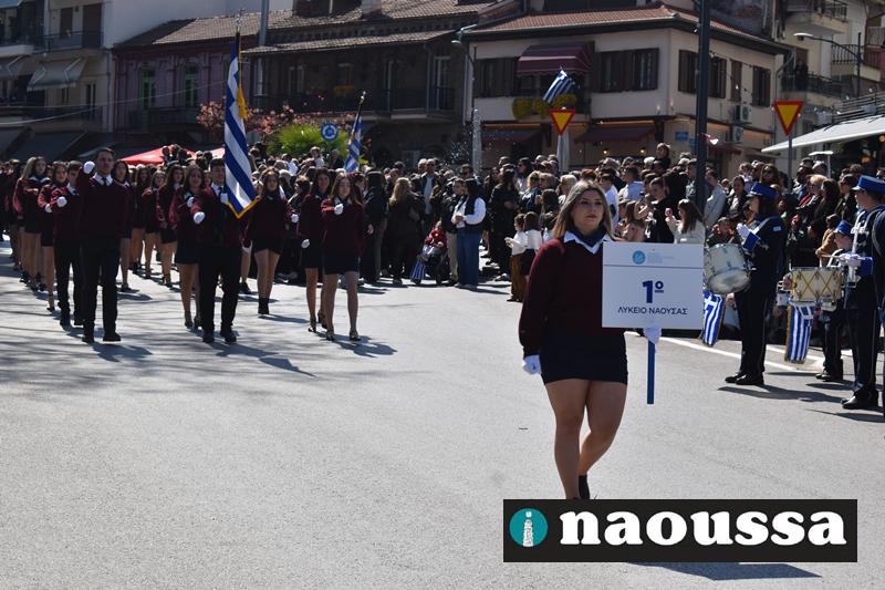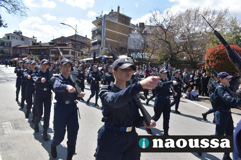 Τα μέλη των πολιτιστικών, οι μαθητές των σχολείων, οι σπουδαστές της σχολής Αστυφυλάκων και άνδρες της Β΄Μοίρας Καταδρομών παρήλασαν καταχειροκροτούμενοι από τους κατοίκους της Νάουσας.
