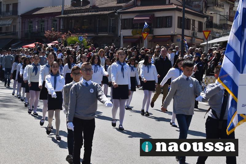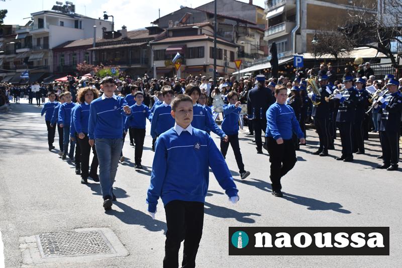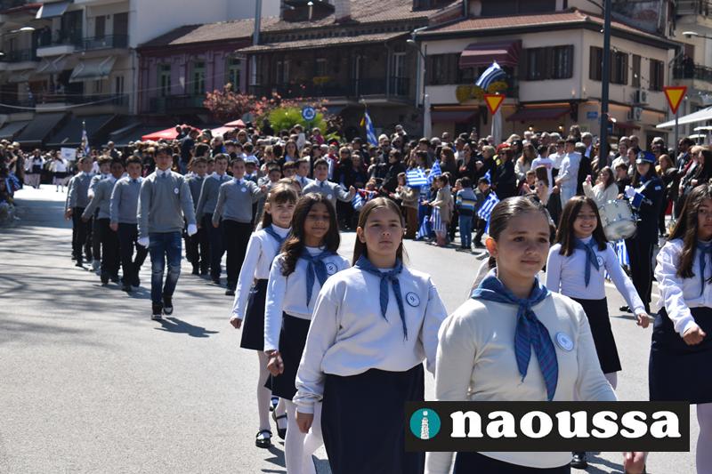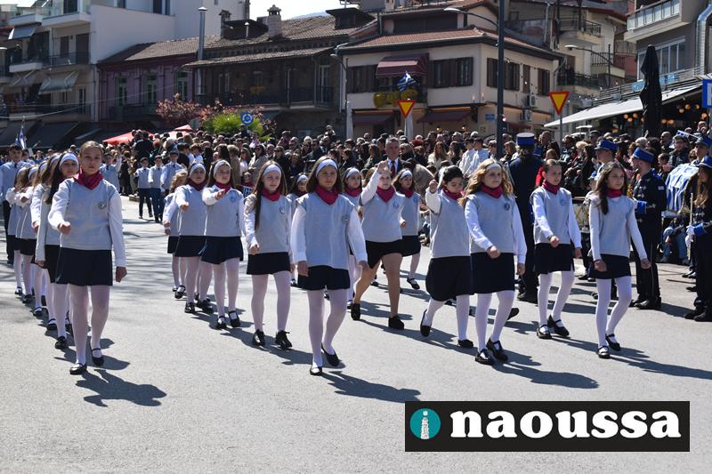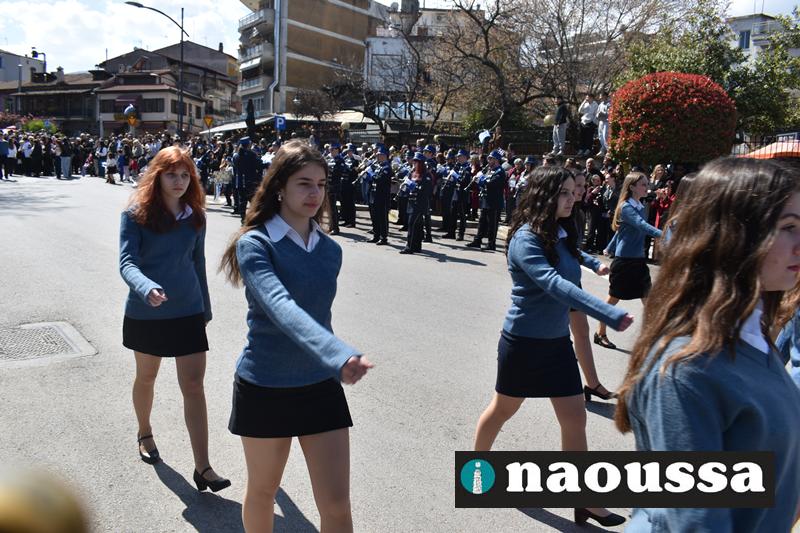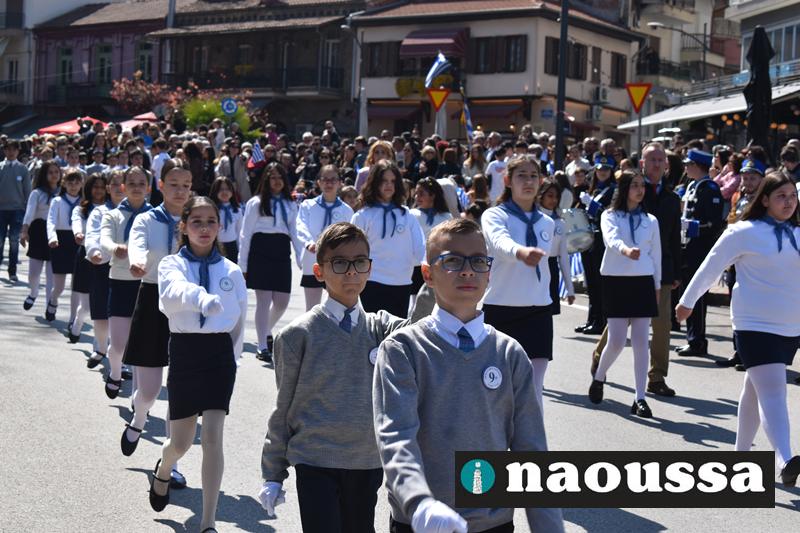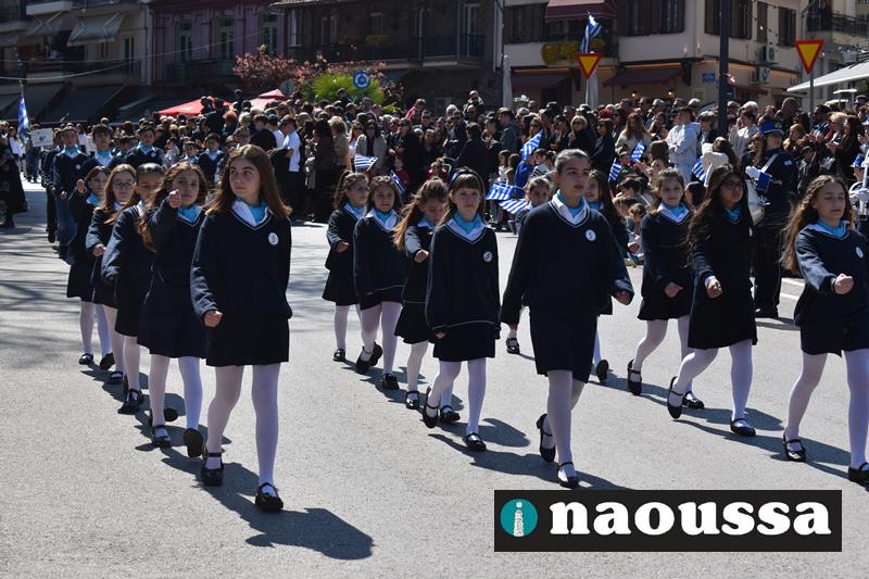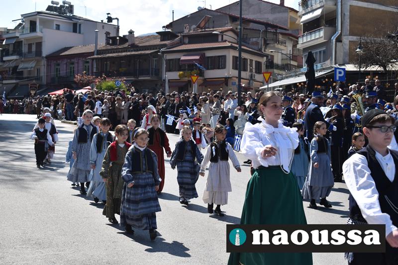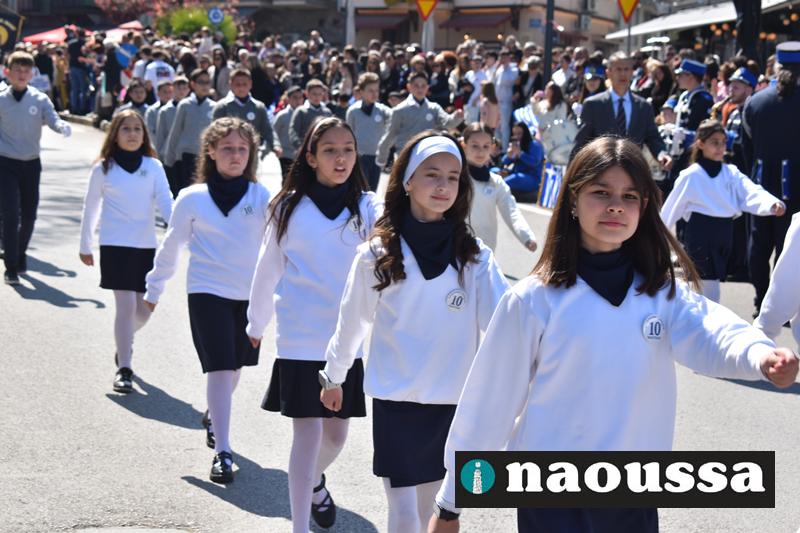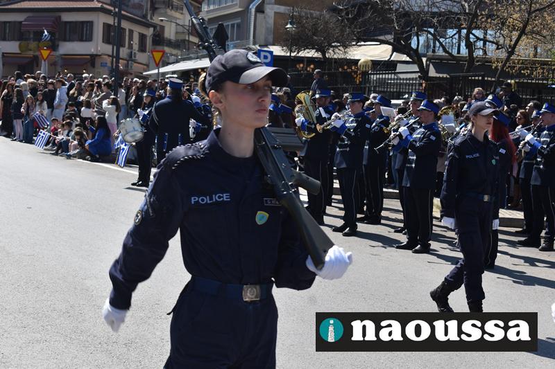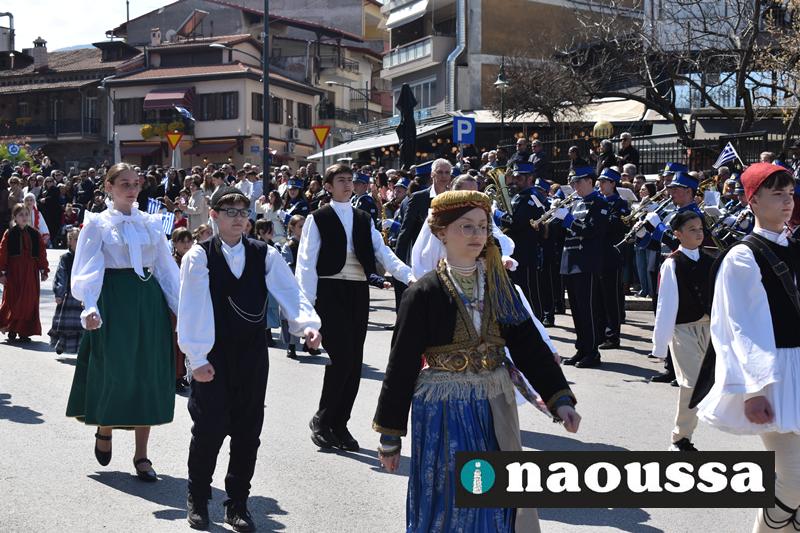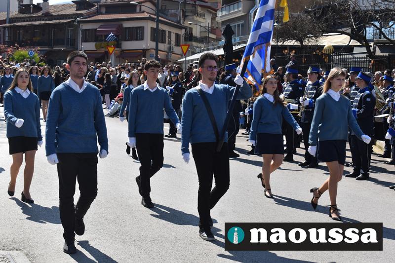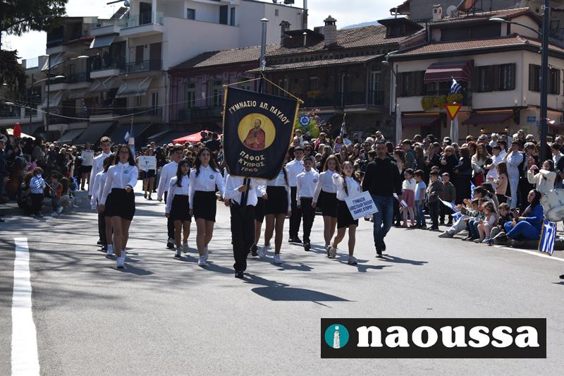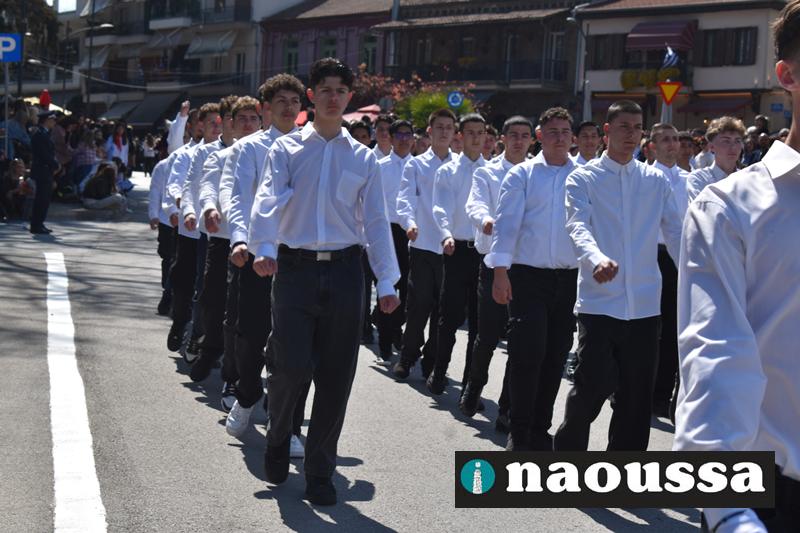Τα μέλη των πολιτιστικών, οι μαθητές των σχολείων, οι σπουδαστές της σχολής Αστυφυλάκων και άνδρες της Β΄Μοίρας Καταδρομών παρήλασαν καταχειροκροτούμενοι από τους κατοίκους της Νάουσας.