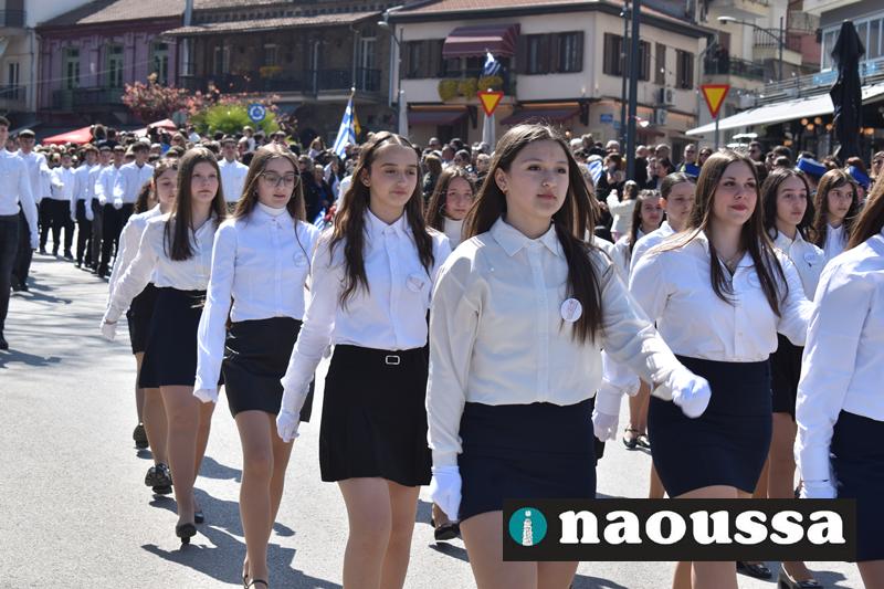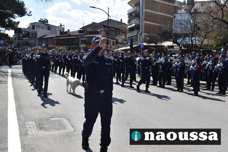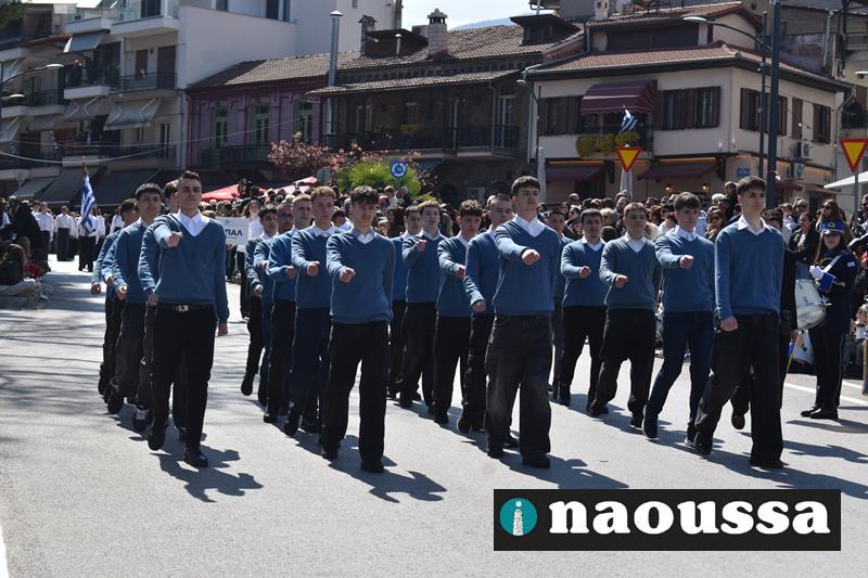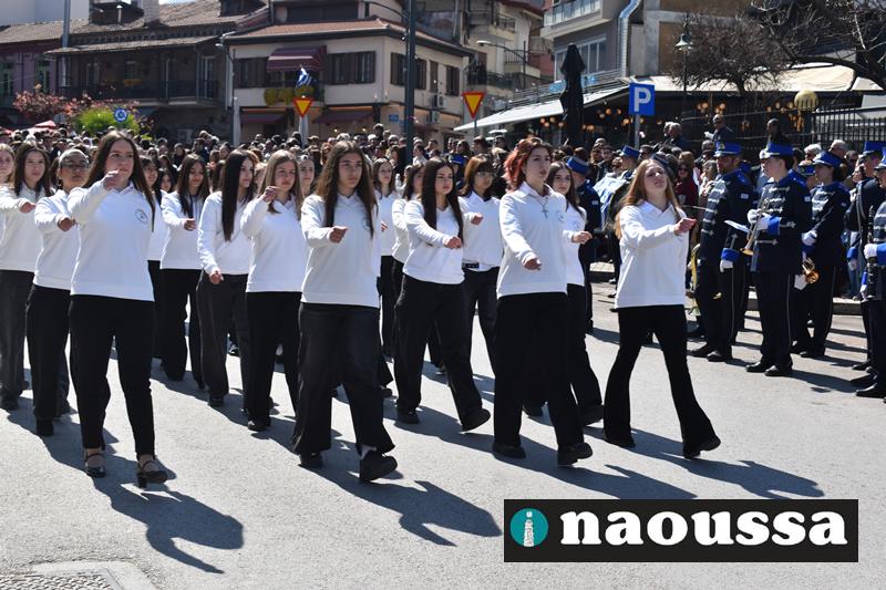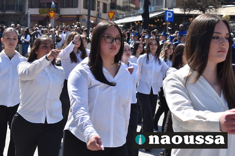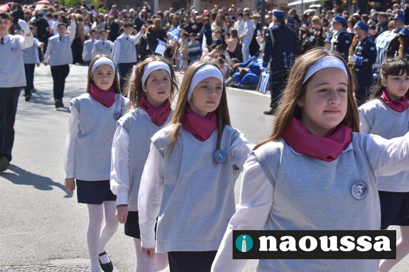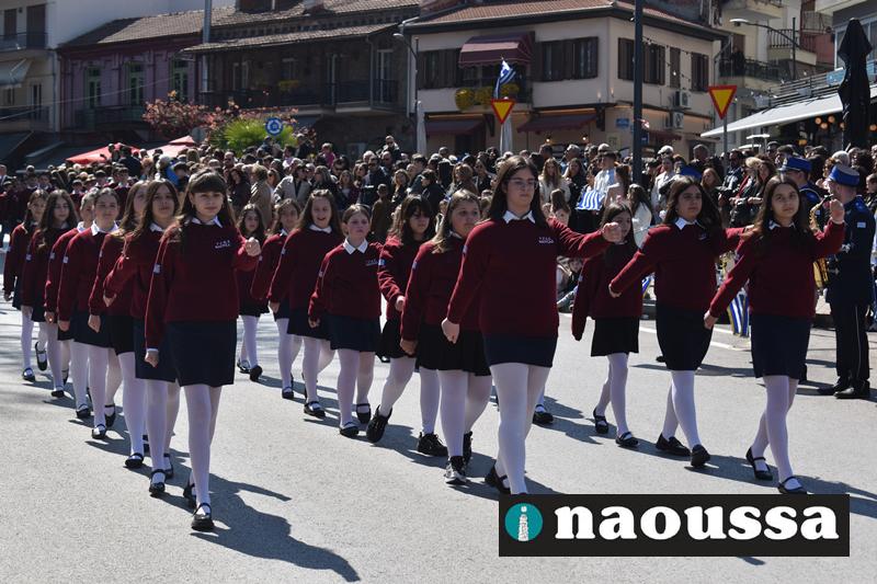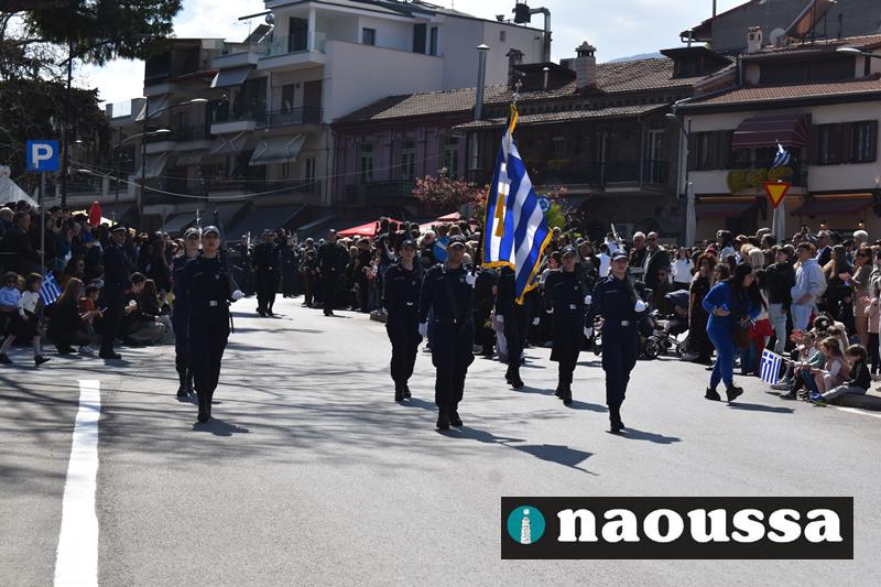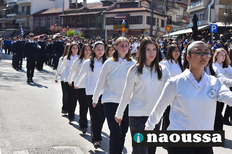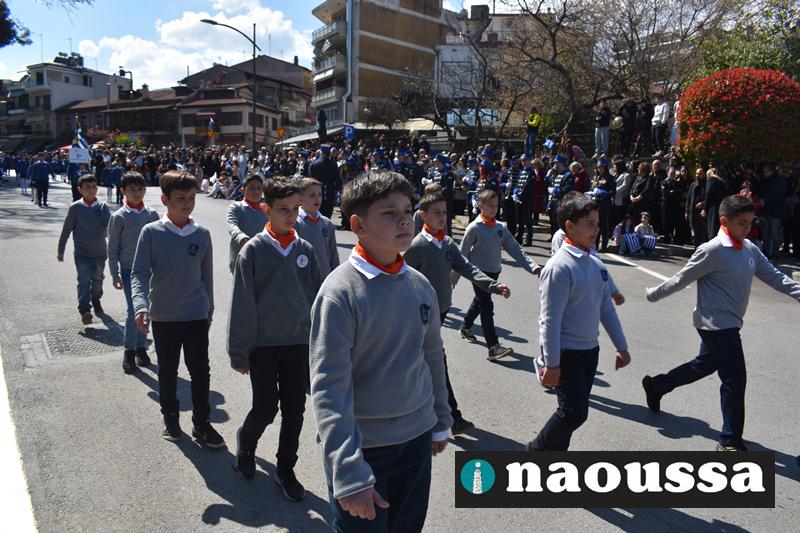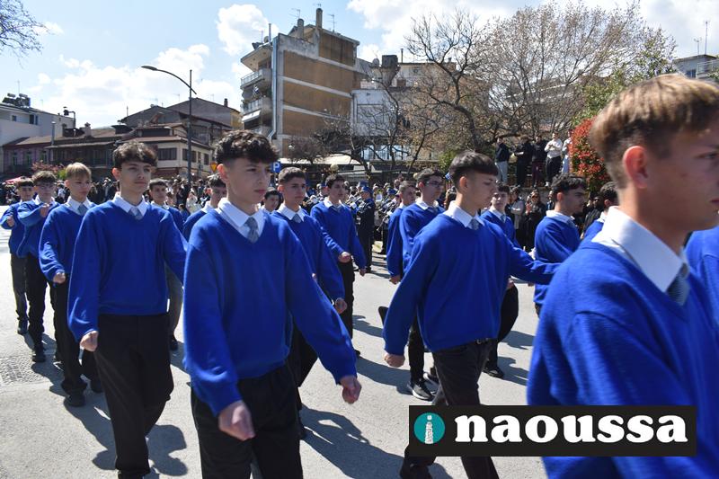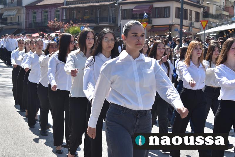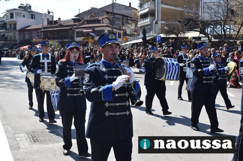 Τα μέλη των πολιτιστικών, οι μαθητές των σχολείων, οι σπουδαστές της σχολής Αστυφυλάκων και άνδρες της Β΄Μοίρας Καταδρομών παρήλασαν καταχειροκροτούμενοι από τους κατοίκους της Νάουσας.