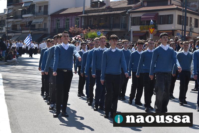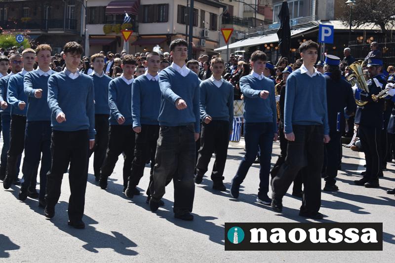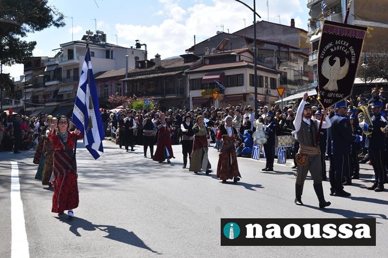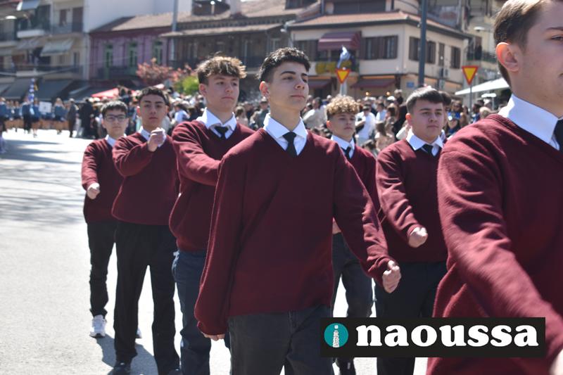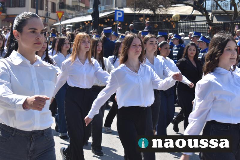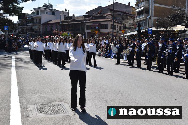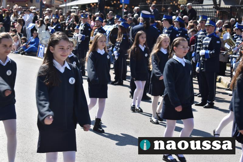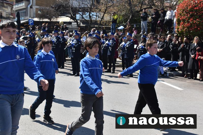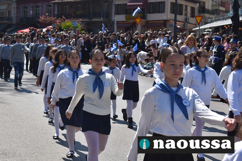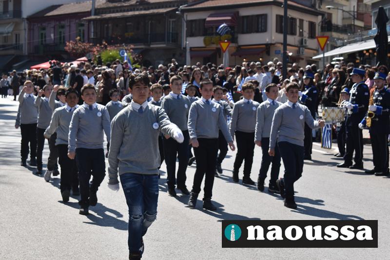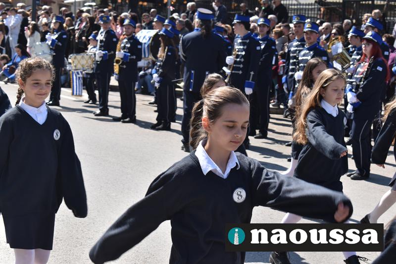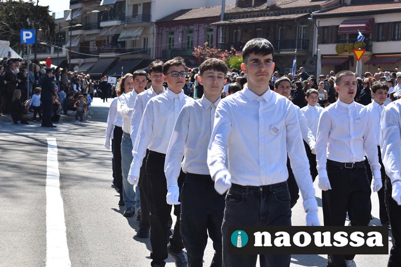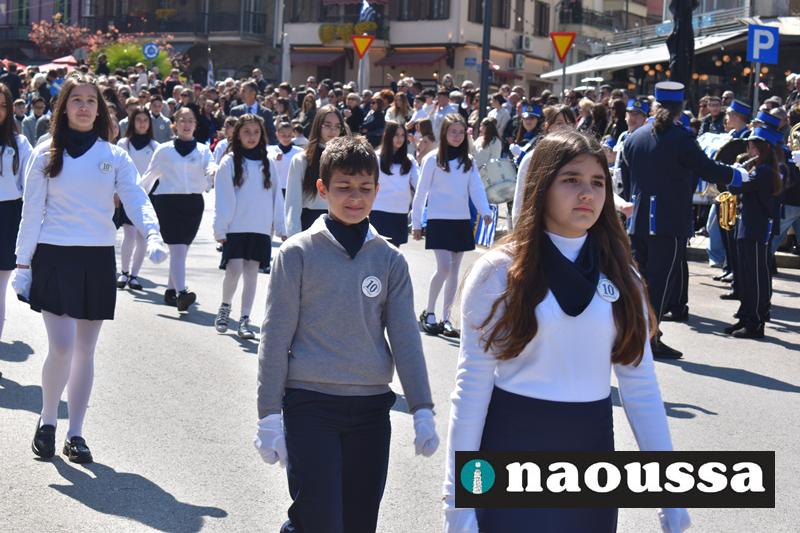 Τα μέλη των πολιτιστικών, οι μαθητές των σχολείων, οι σπουδαστές της σχολής Αστυφυλάκων και άνδρες της Β΄Μοίρας Καταδρομών παρήλασαν καταχειροκροτούμενοι από τους κατοίκους της Νάουσας.