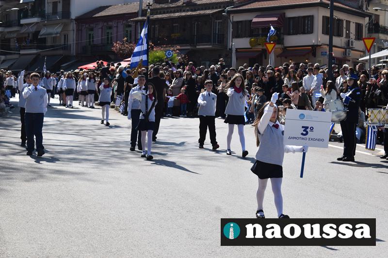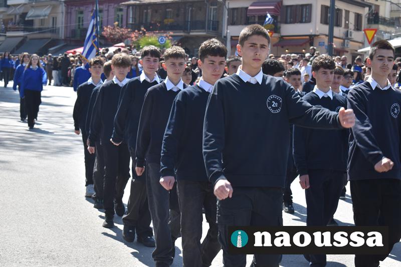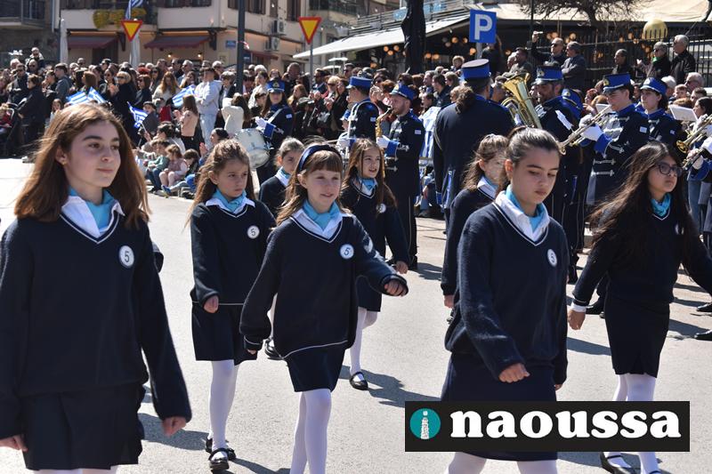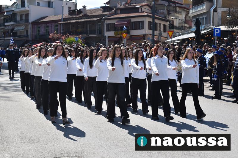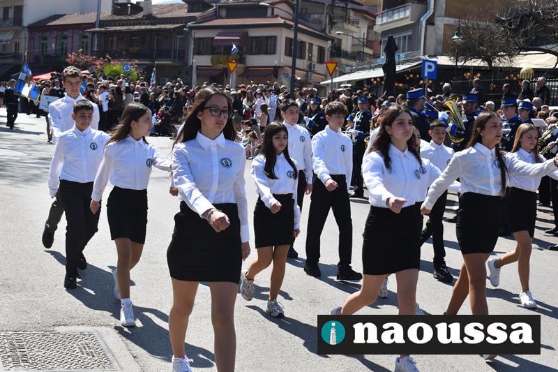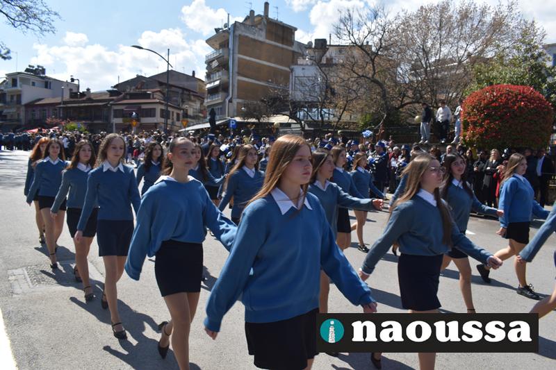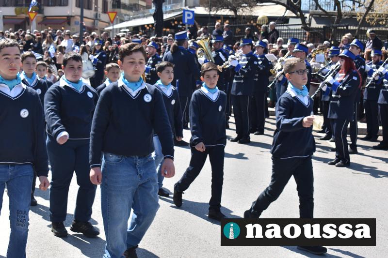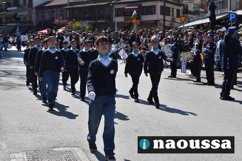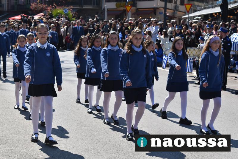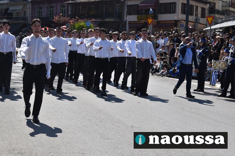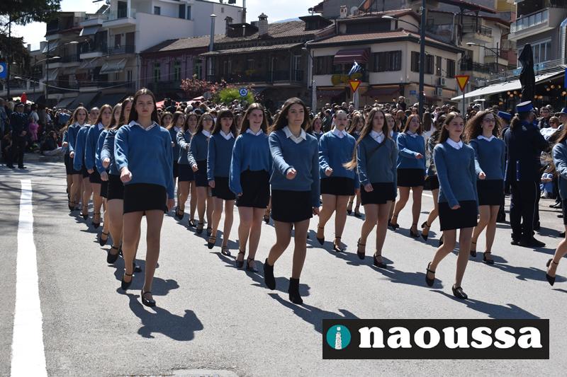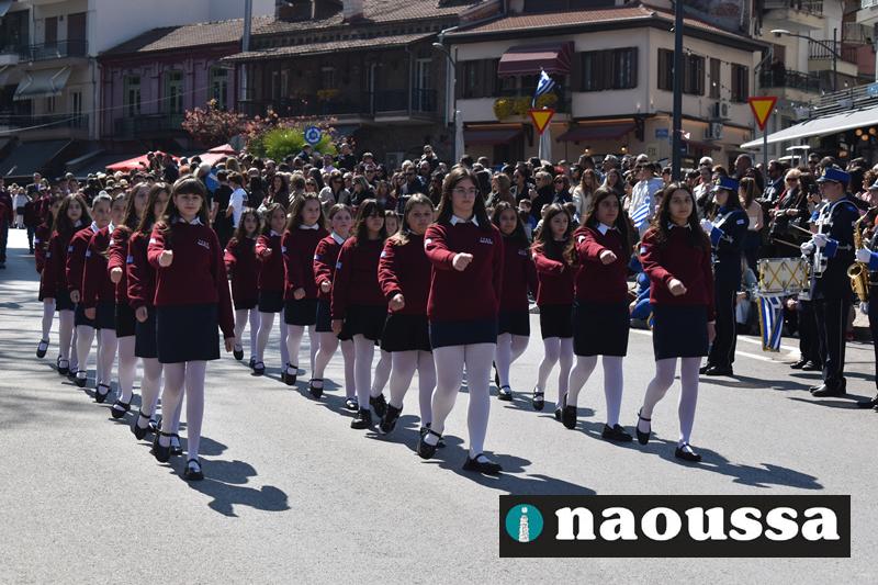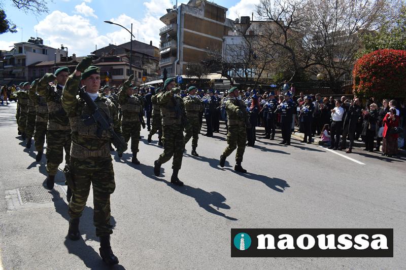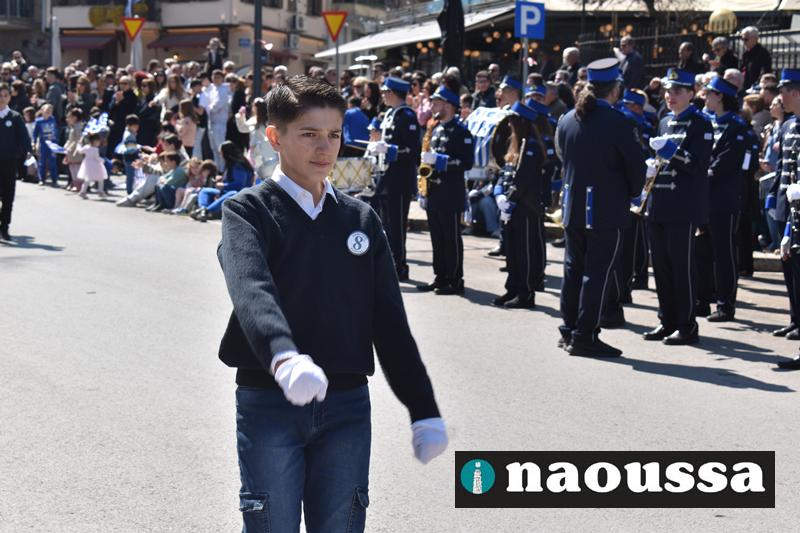 Τα μέλη των πολιτιστικών, οι μαθητές των σχολείων, οι σπουδαστές της σχολής Αστυφυλάκων και άνδρες της Β΄Μοίρας Καταδρομών παρήλασαν καταχειροκροτούμενοι από τους κατοίκους της Νάουσας.