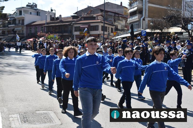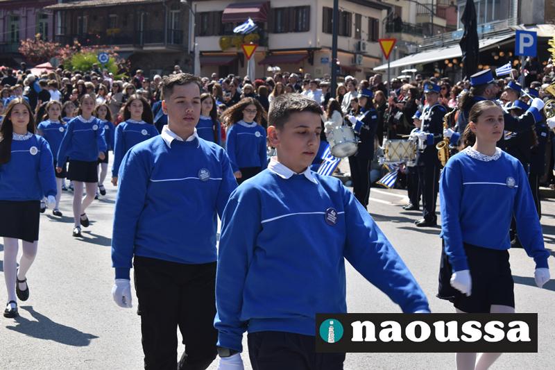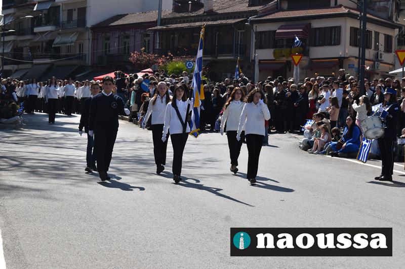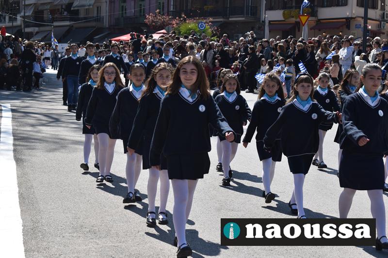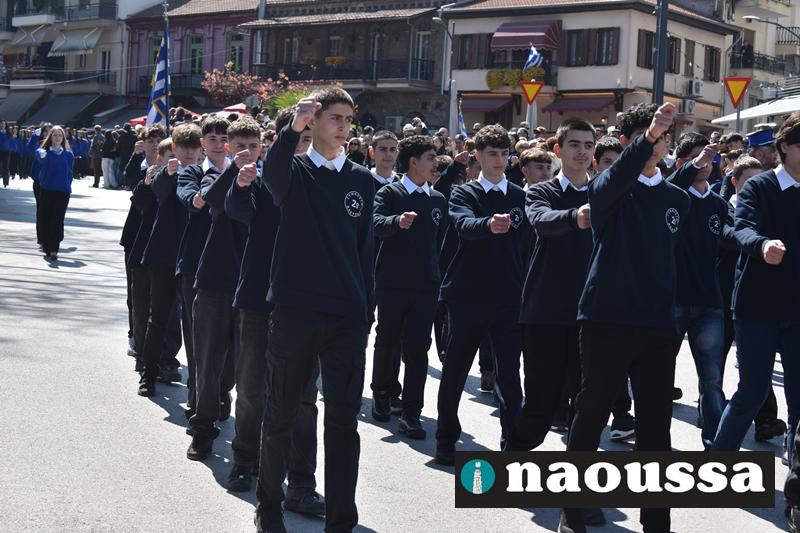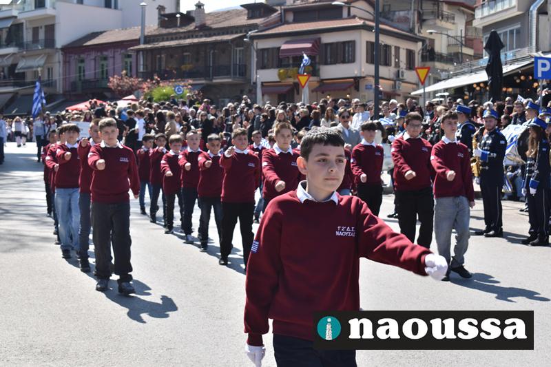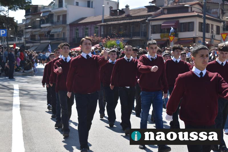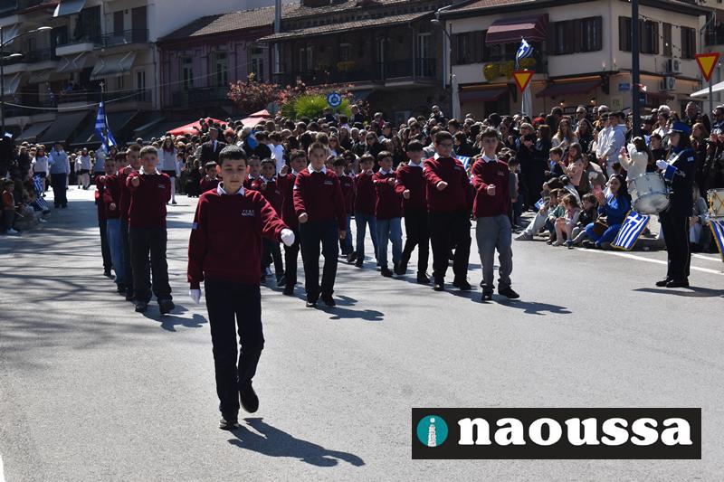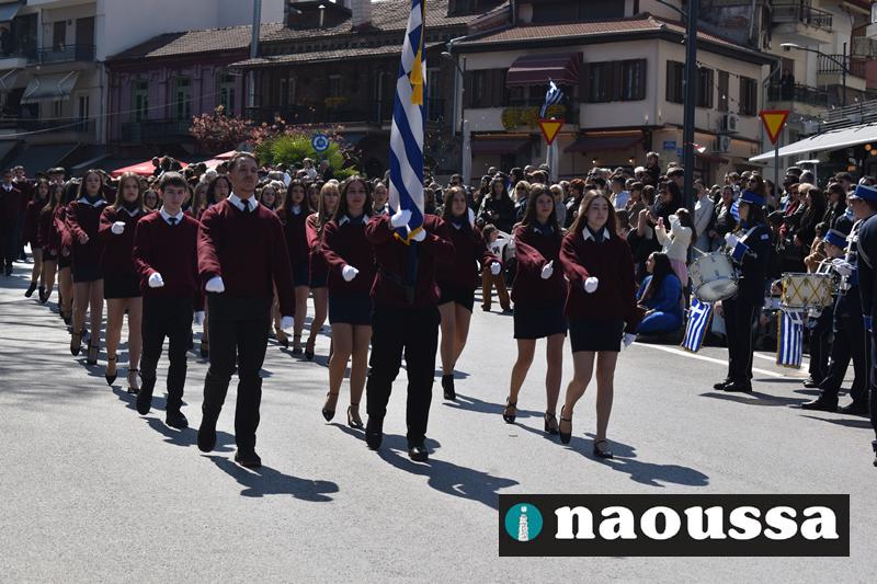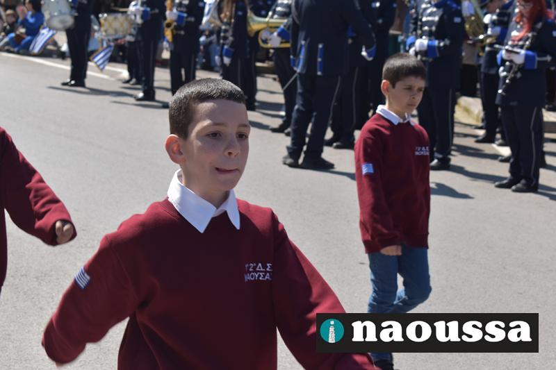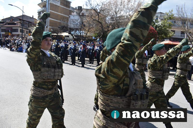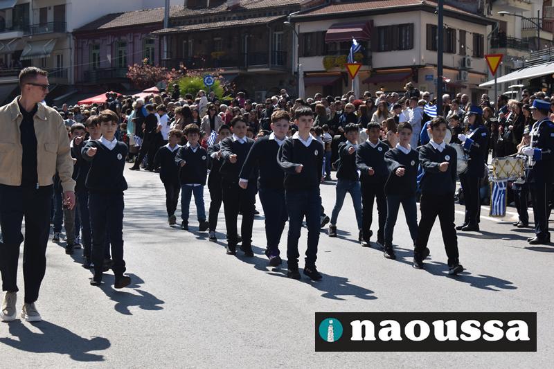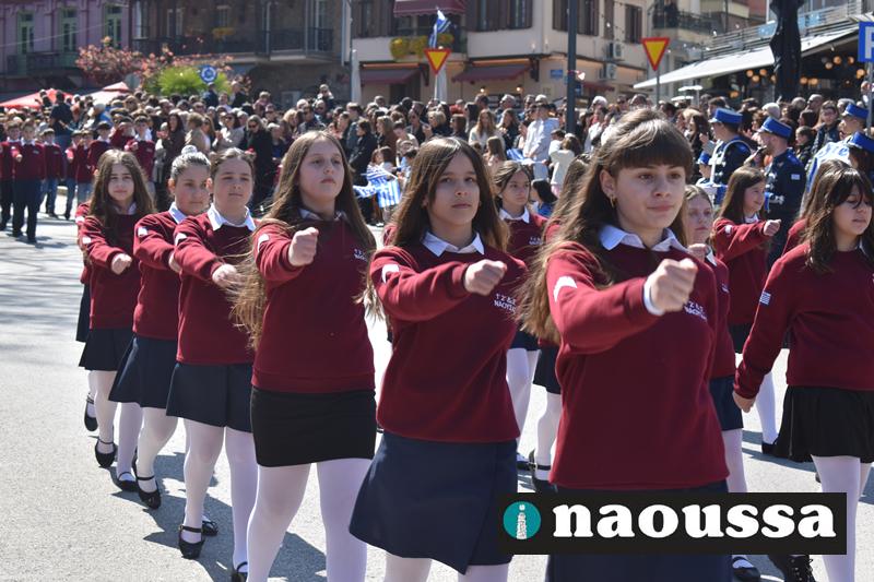 Τα μέλη των πολιτιστικών, οι μαθητές των σχολείων, οι σπουδαστές της σχολής Αστυφυλάκων και άνδρες της Β΄Μοίρας Καταδρομών παρήλασαν καταχειροκροτούμενοι από τους κατοίκους της Νάουσας.