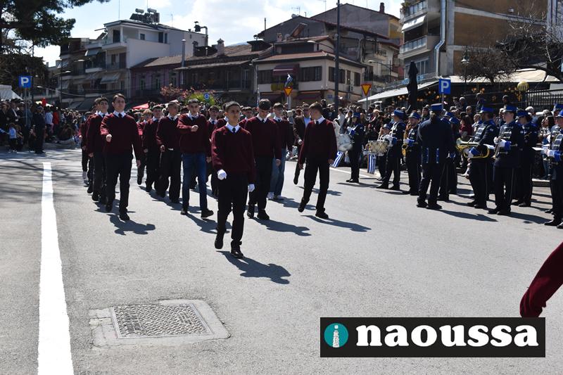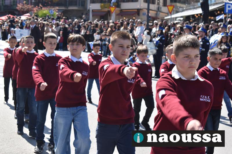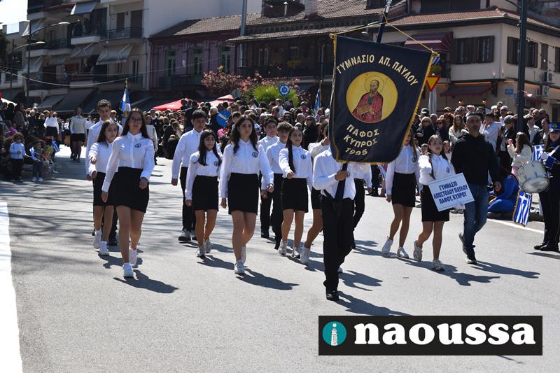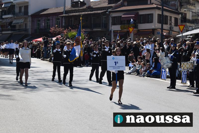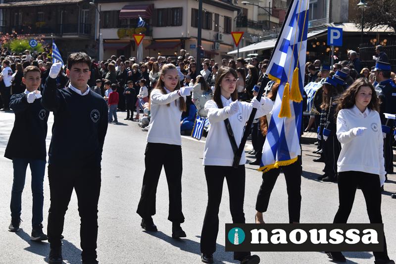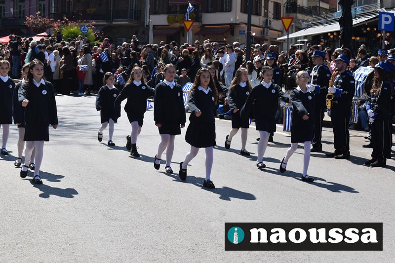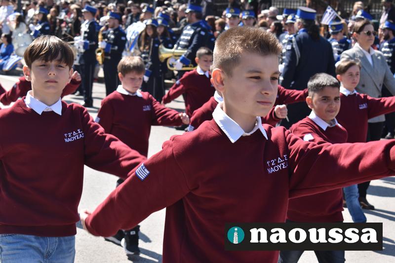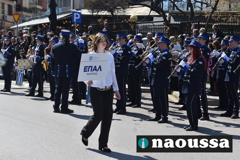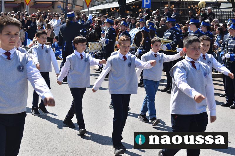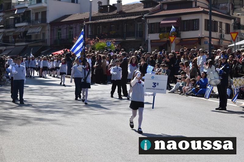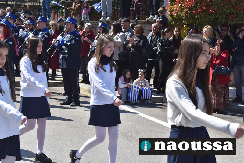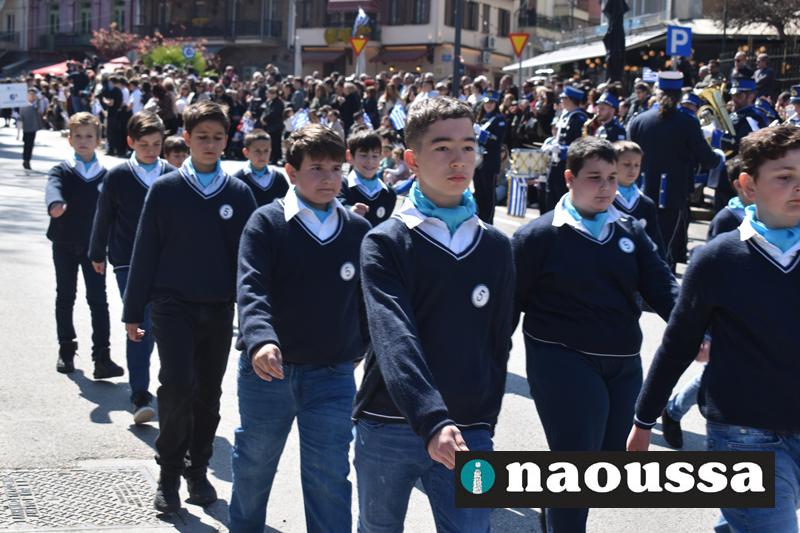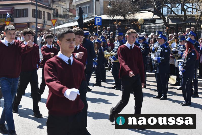 Τα μέλη των πολιτιστικών, οι μαθητές των σχολείων, οι σπουδαστές της σχολής Αστυφυλάκων και άνδρες της Β΄Μοίρας Καταδρομών παρήλασαν καταχειροκροτούμενοι από τους κατοίκους της Νάουσας.