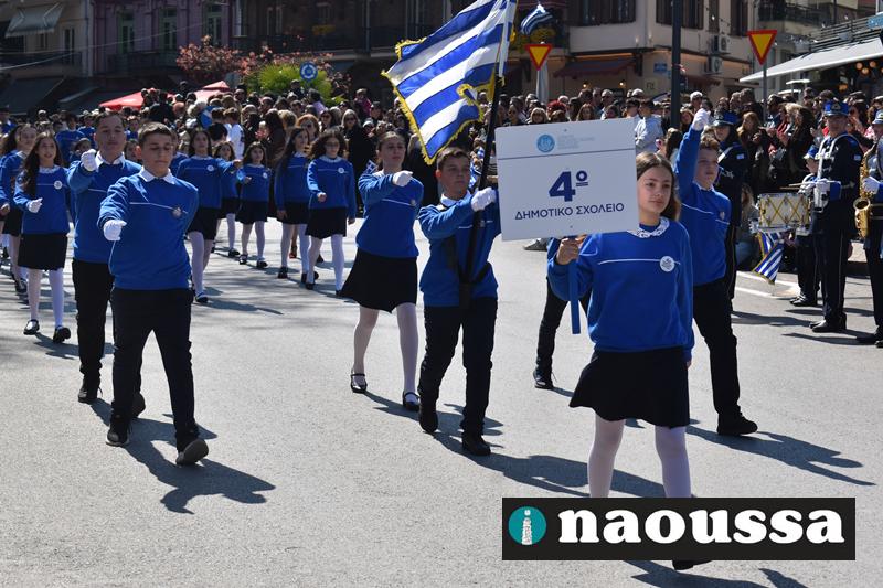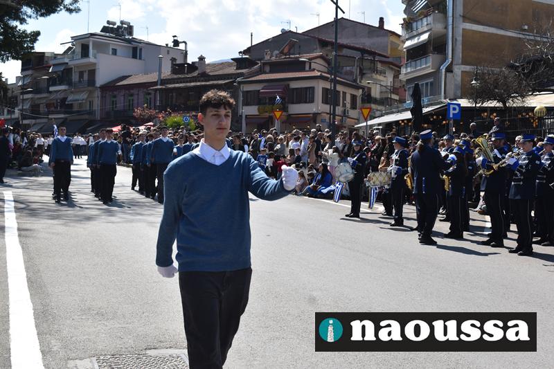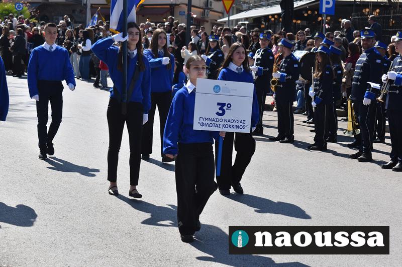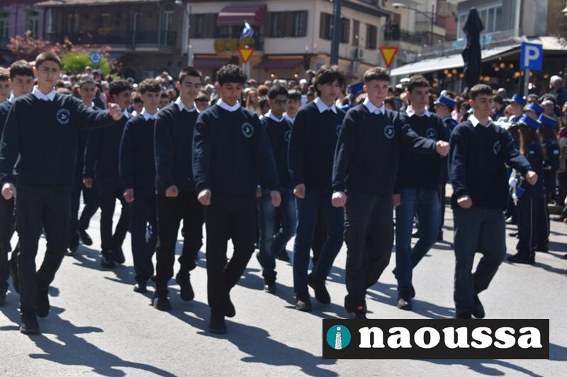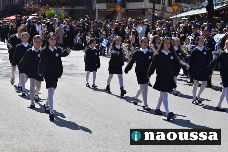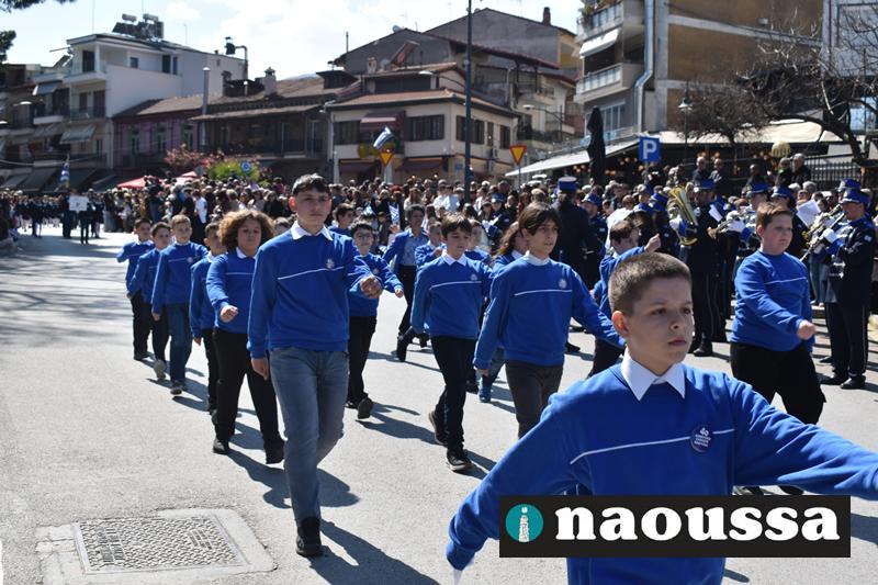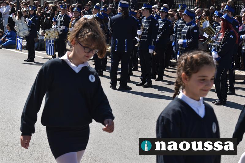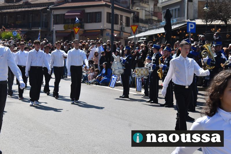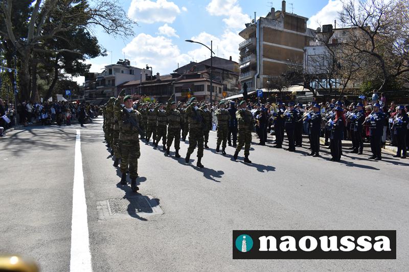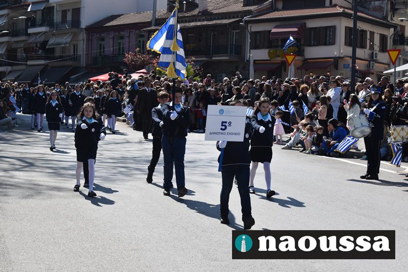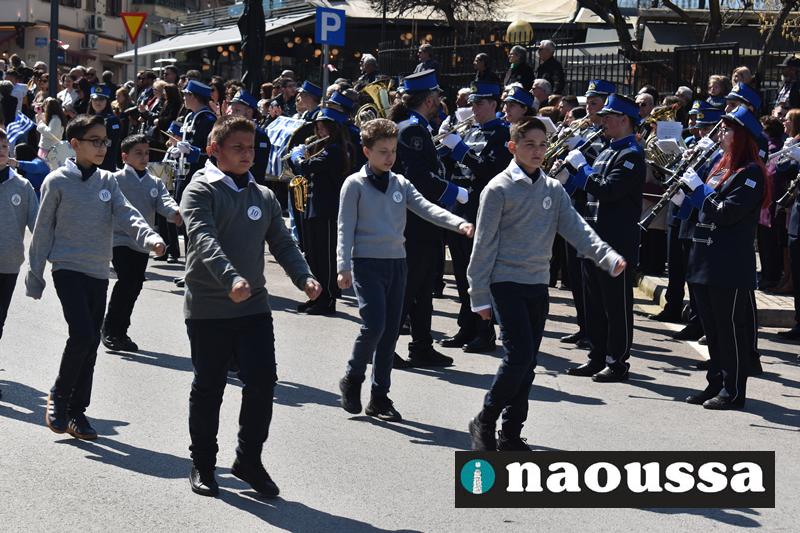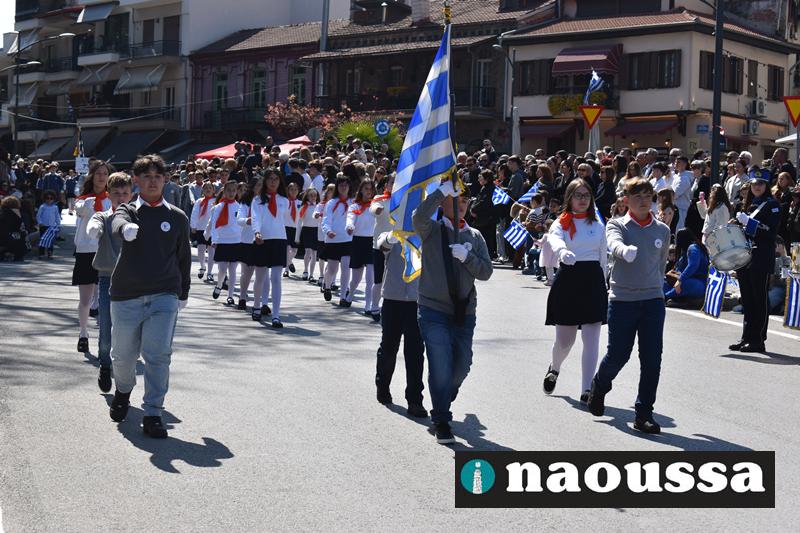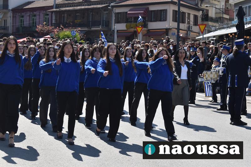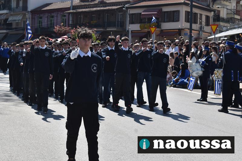 Τα μέλη των πολιτιστικών, οι μαθητές των σχολείων, οι σπουδαστές της σχολής Αστυφυλάκων και άνδρες της Β΄Μοίρας Καταδρομών παρήλασαν καταχειροκροτούμενοι από τους κατοίκους της Νάουσας.