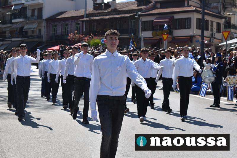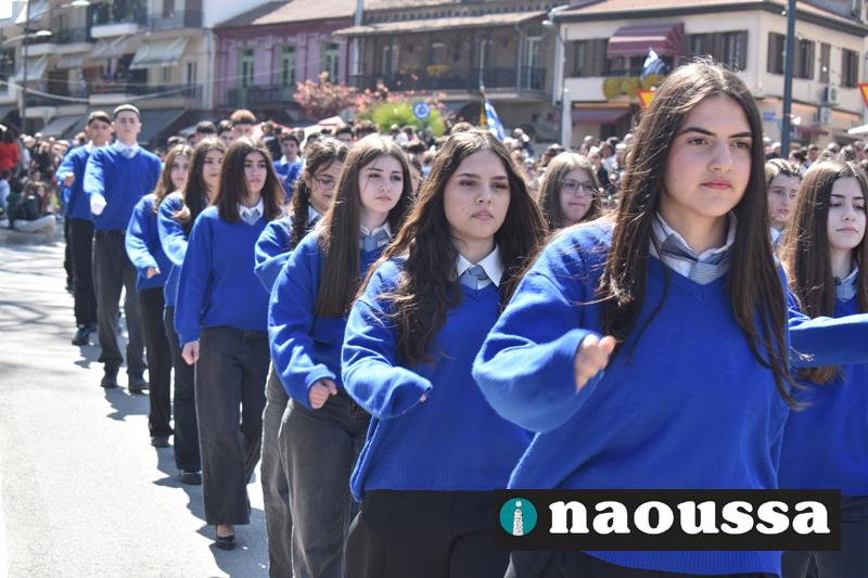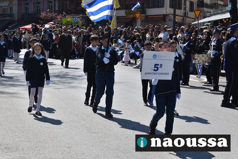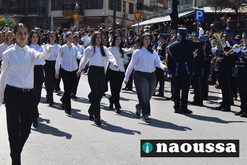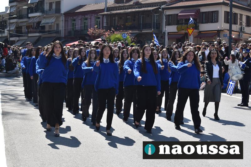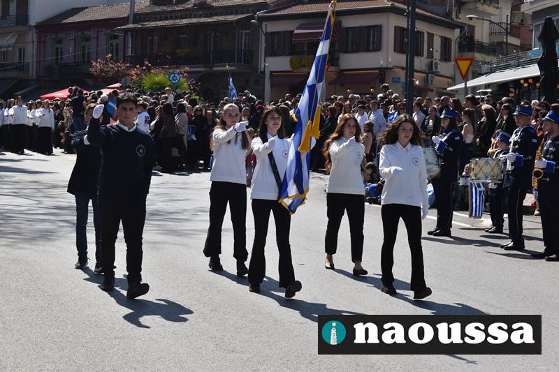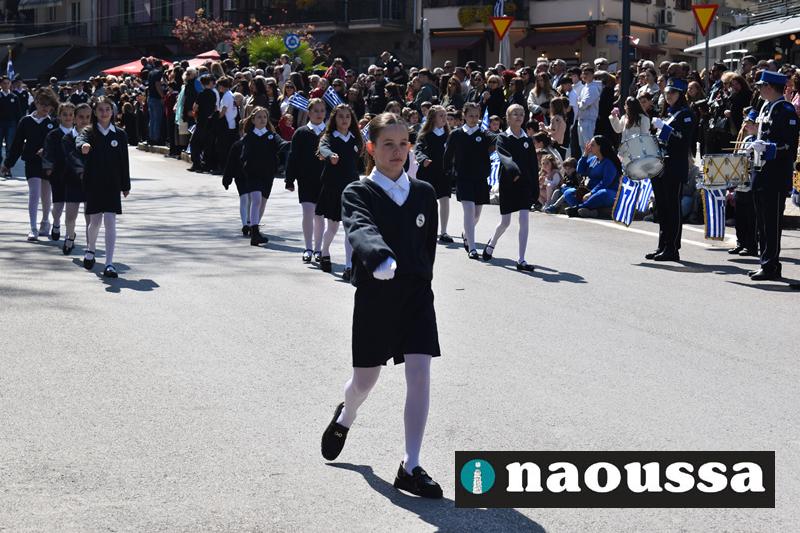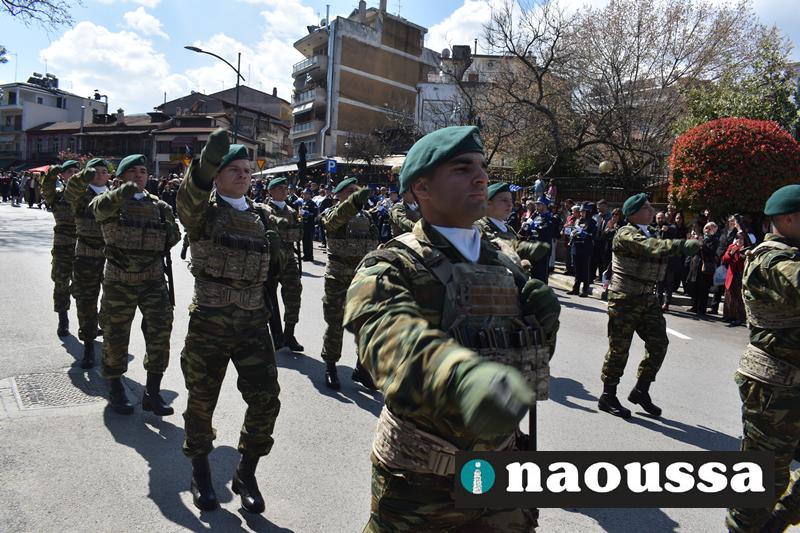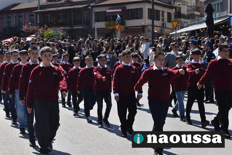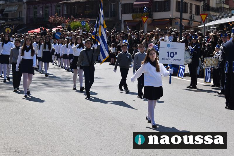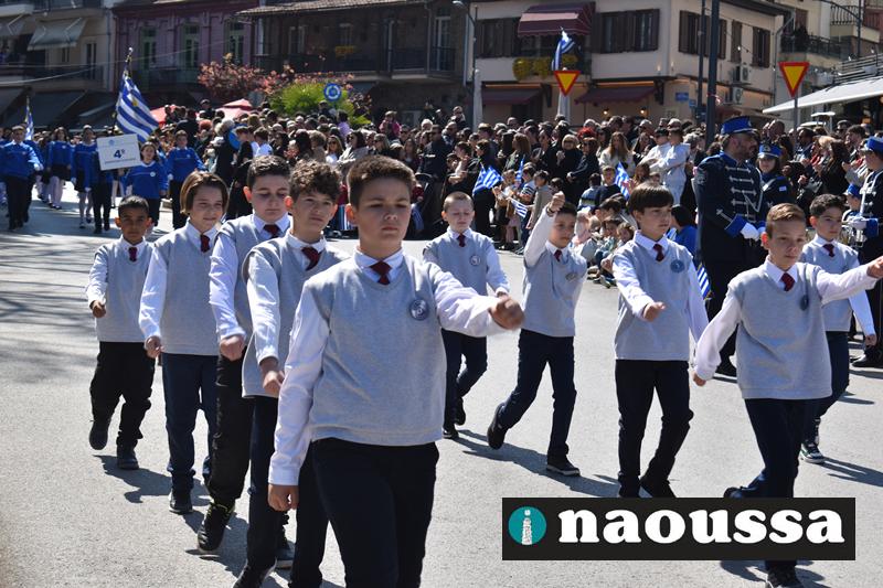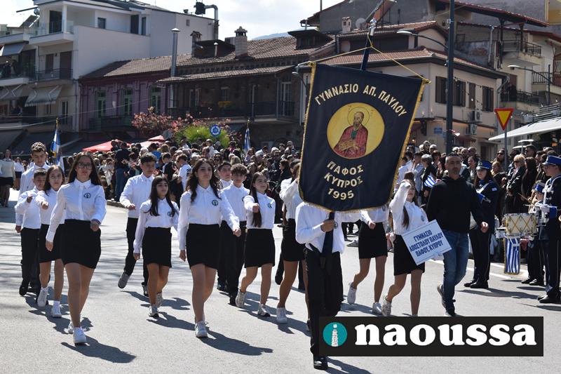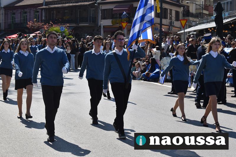 Τα μέλη των πολιτιστικών, οι μαθητές των σχολείων, οι σπουδαστές της σχολής Αστυφυλάκων και άνδρες της Β΄Μοίρας Καταδρομών παρήλασαν καταχειροκροτούμενοι από τους κατοίκους της Νάουσας.