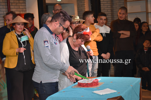 Στο κατάμεστο από κόσμο Στέκι Νεολαίας έκοψαν την βασιλόπιτά τους το απόγευμα της Κυριακής οι Φίλοι Καρναβαλιού Νάουσας. Η εκδήλωση ξεκίνησε με δημιουργικό εργαστήρι κατασκευής Μάσκας και Καπέλου για τα παιδιά για να ακολουθήσει το απολαυστικό θεατρικό (ολόκληρο το video σε επόμενη ανάρτηση του inaoussa.gr) και η κοπή της βασιλόπιτας. Την κοπή της βασιλόπιτας έκανε ο διοικητής της Β΄ Μοίρας Καταδρομών με το φλουρί να βρίσκει η κα. Κούντη.